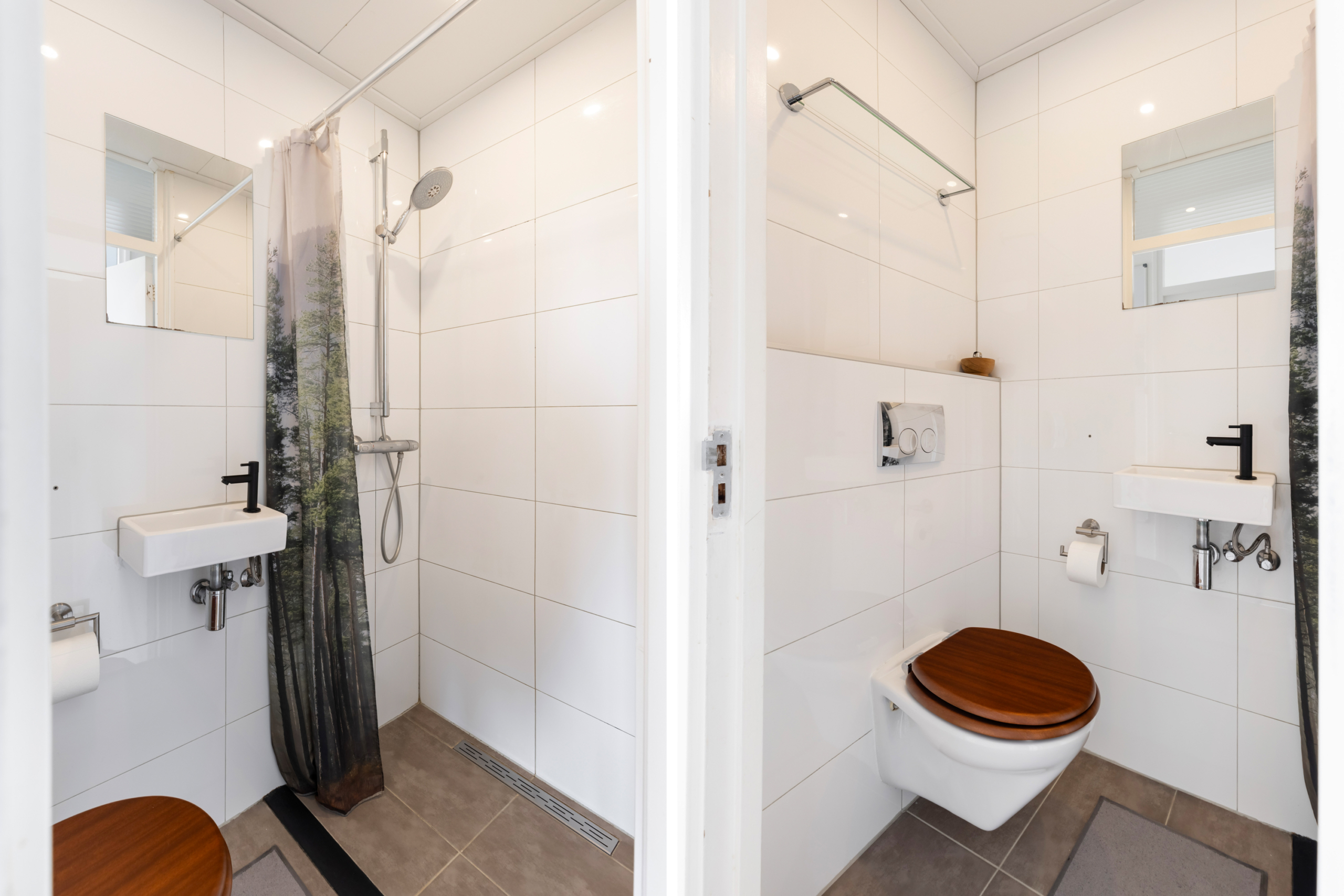 De badkamer heeft lichte kleurstellingen en is voorzien van een toilet, kleine wasbak en een inloopdouche.