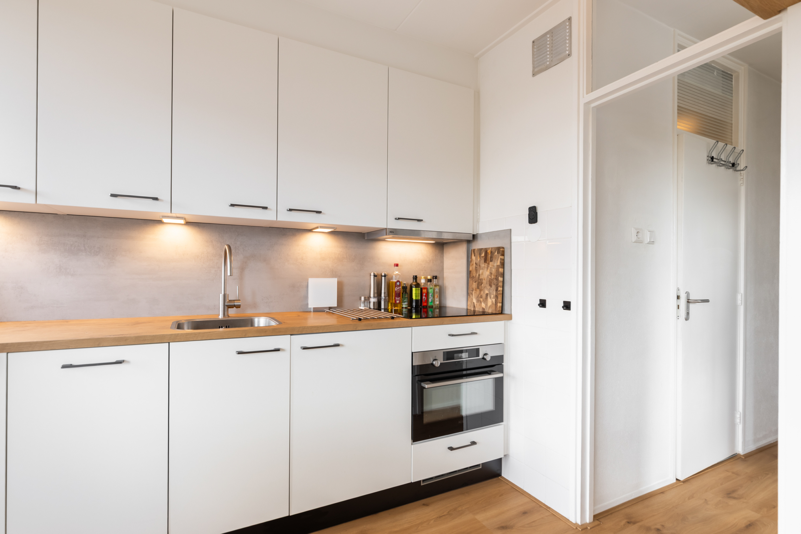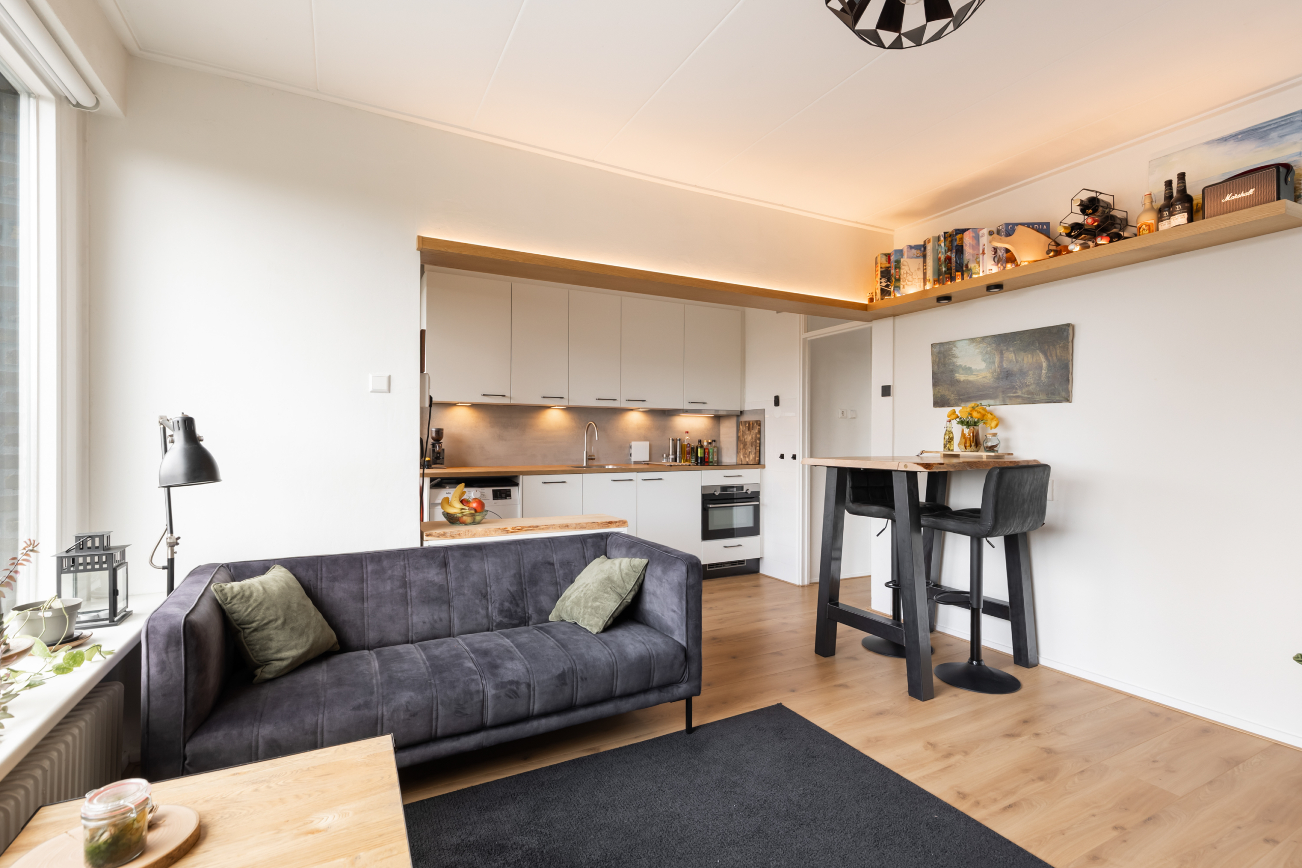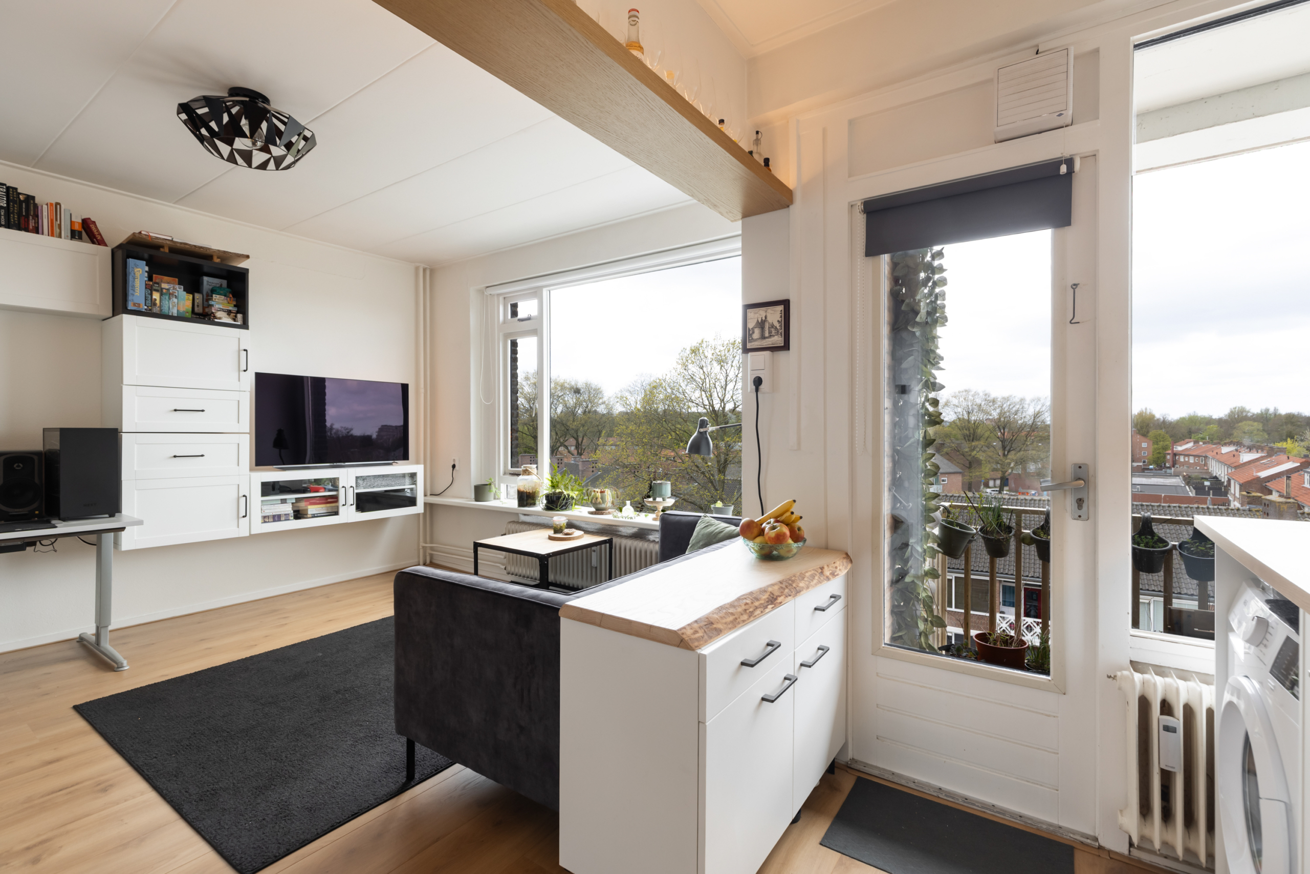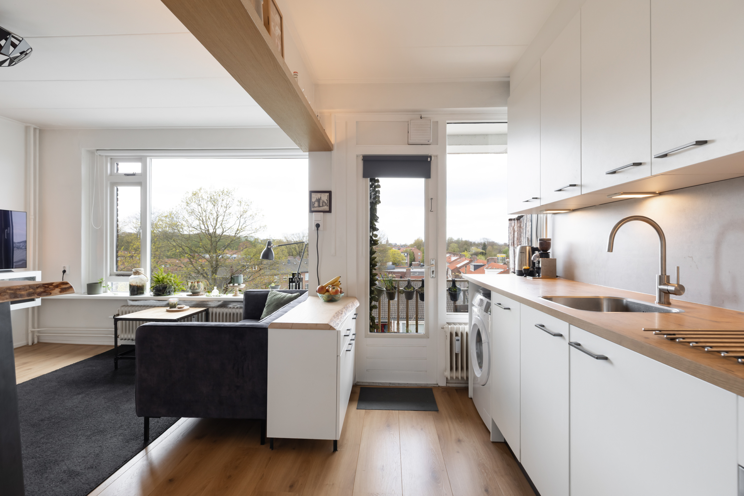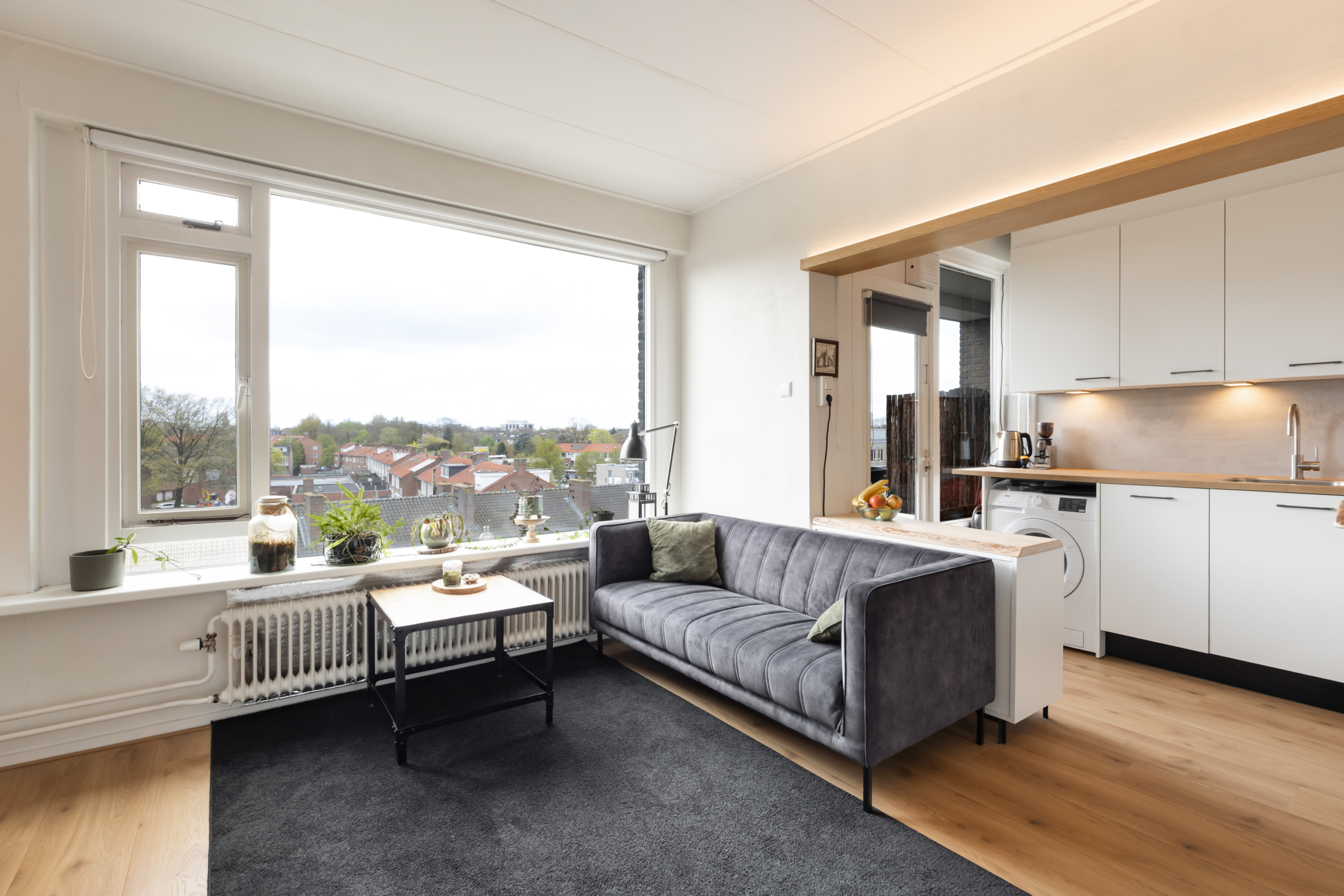 Dit appartement is een ideale woonplek om alleen of met z’n tweeen te gaan wonen. Omdat het een hoekappartement aan de ZuidWest kant is, hebben zowel de woonkamer als de slaapkamer fijne lichte ruimtes. Het appartement bevindt zicht op de 5e verdieping. Dit zorgt voor een schitterende “view” over Amersfoort. Met kers op de taart “de lange Jan” in het vizier. De keuken is bij de woonkamer betrokken, waardoor er optisch meer ruimte is gecreeerd. De keuken heeft een lichte kleurstelling en is voorzien van een inductie kookplaat, vaatwasser, koelkast met vriesvak, magnetron en mengkraan.