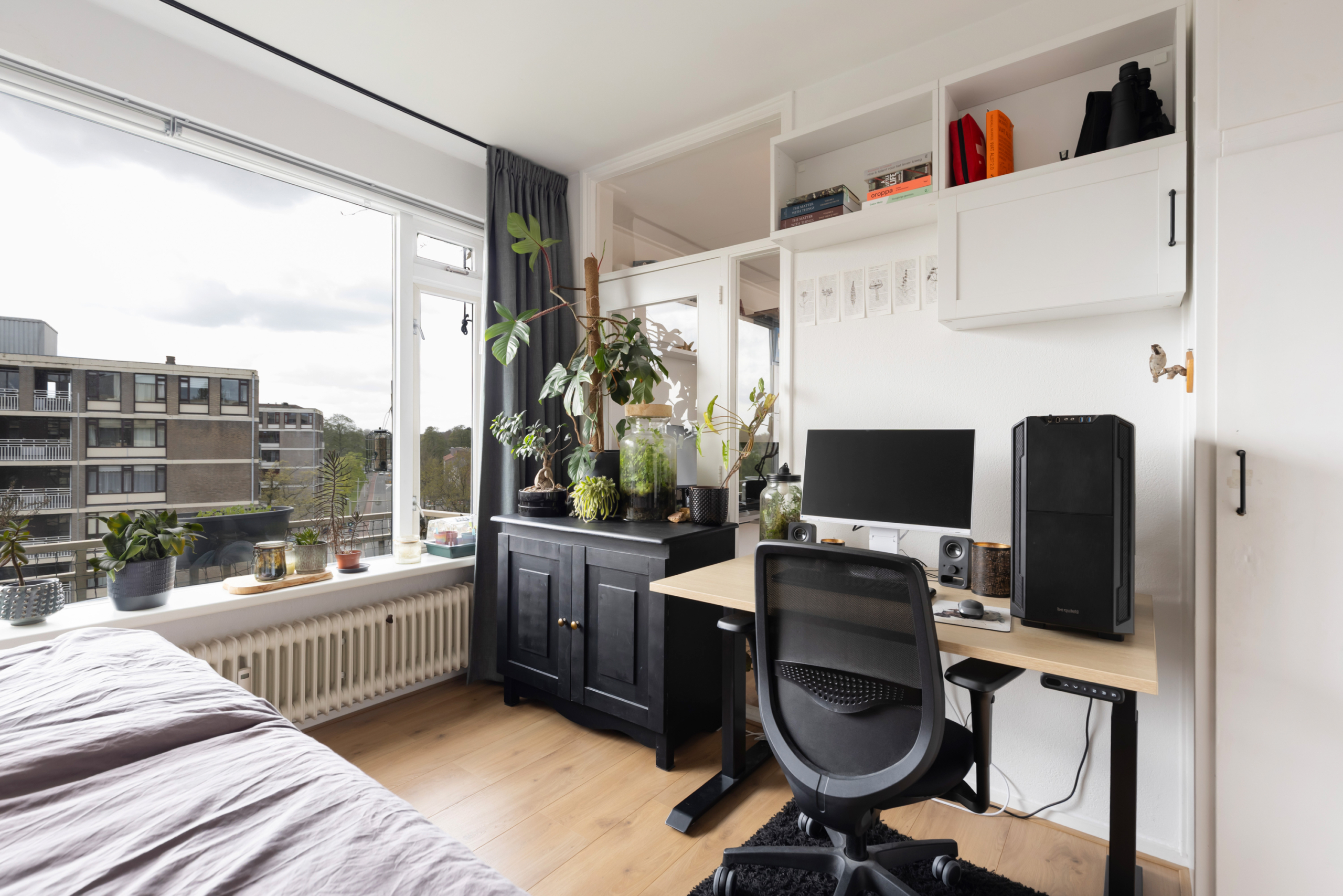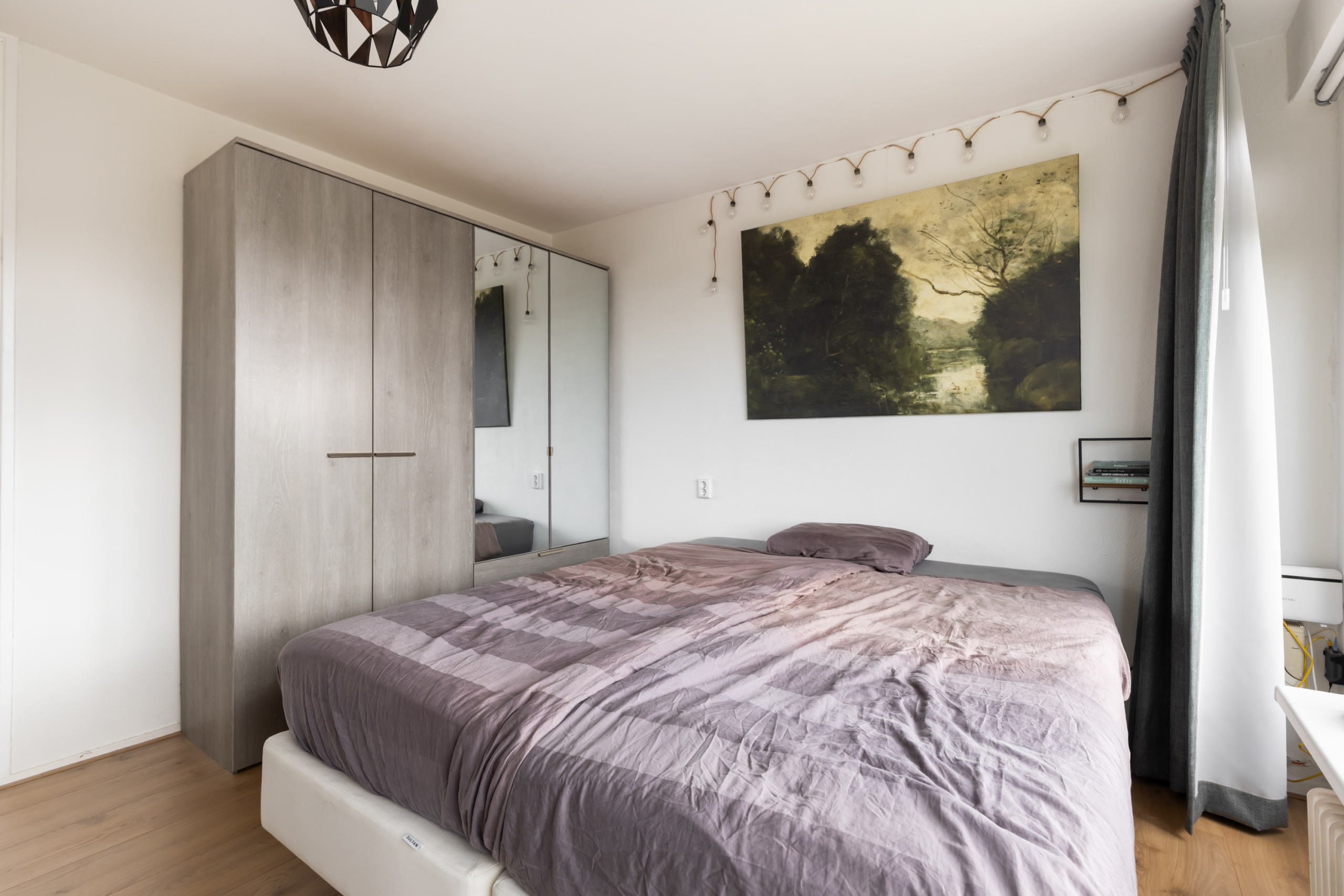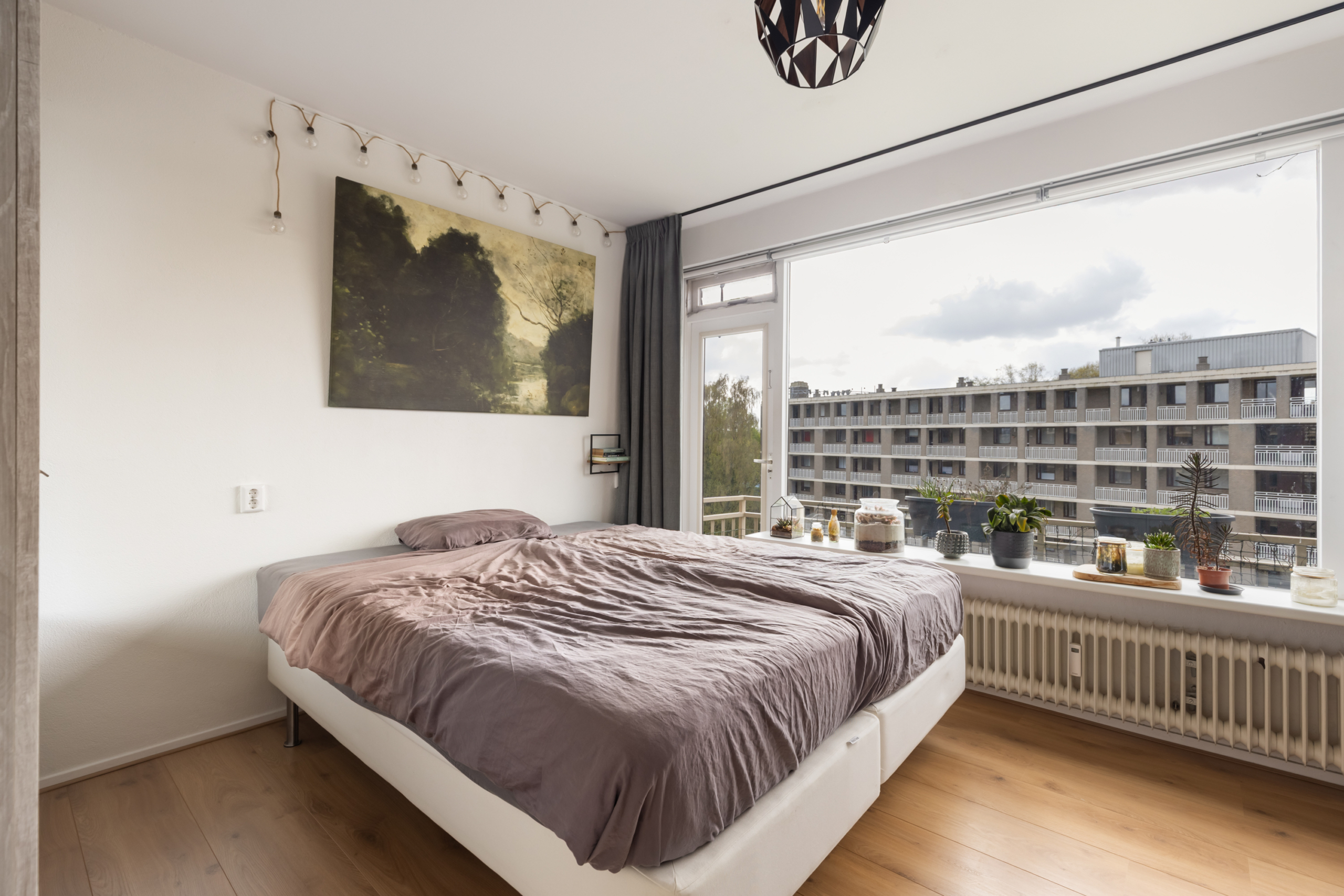 De slaapkamer heeft royale afmetingen. Met groot gemak kan hier een tweepersoons bed en kledingkast staan. De ruimte is ook nog groot genoeg om een bureau neer te zetten. Aan deze zijde is ook een balkon.