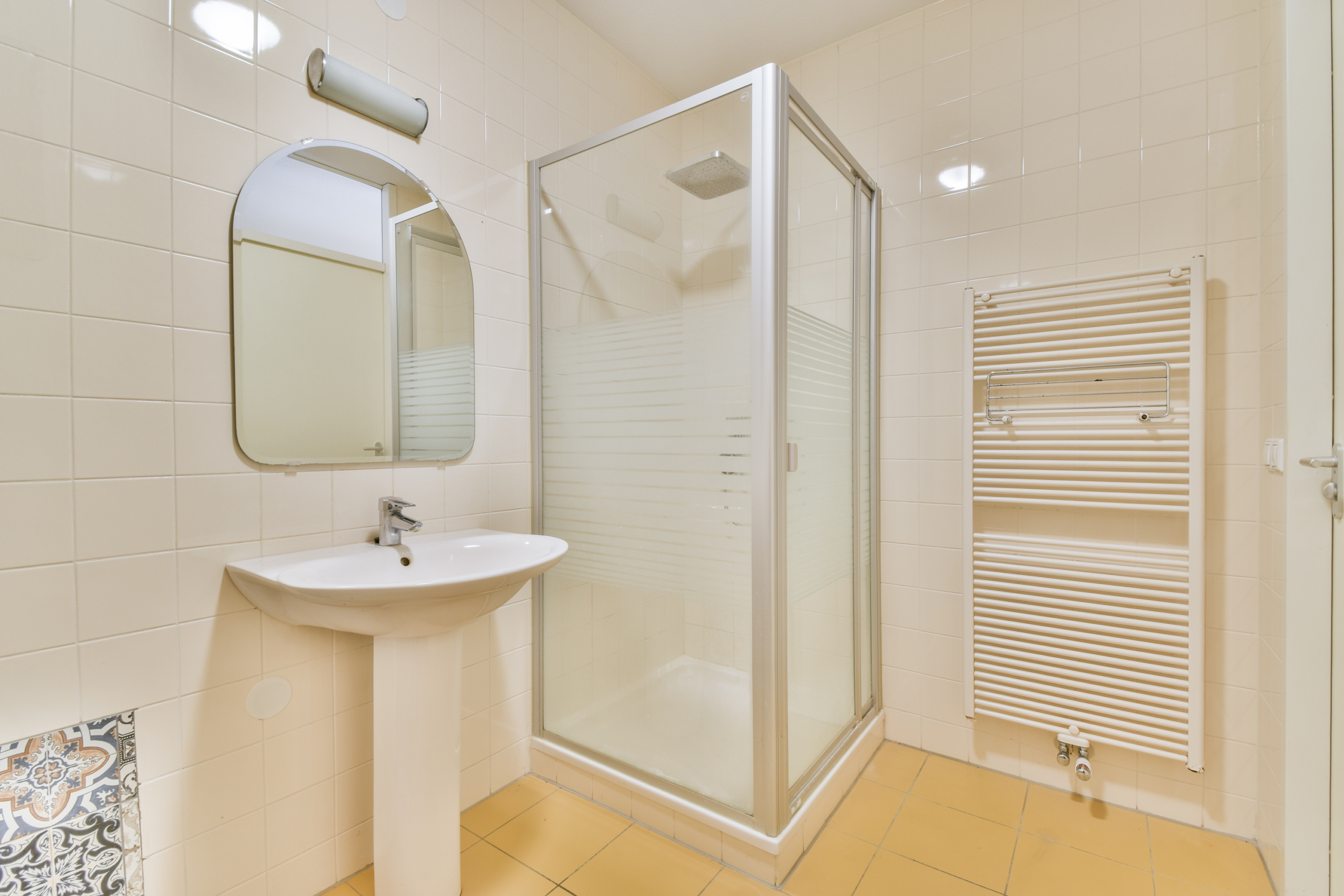 De ruime slaapkamer met directe toegang tot de serre en centrale hal met toegang tot de ruime badkamer inclusief inloopdouche en wastafel. Er is een apart toilet en een inpandige berging met aansluitingen voor wasmachine en droger.