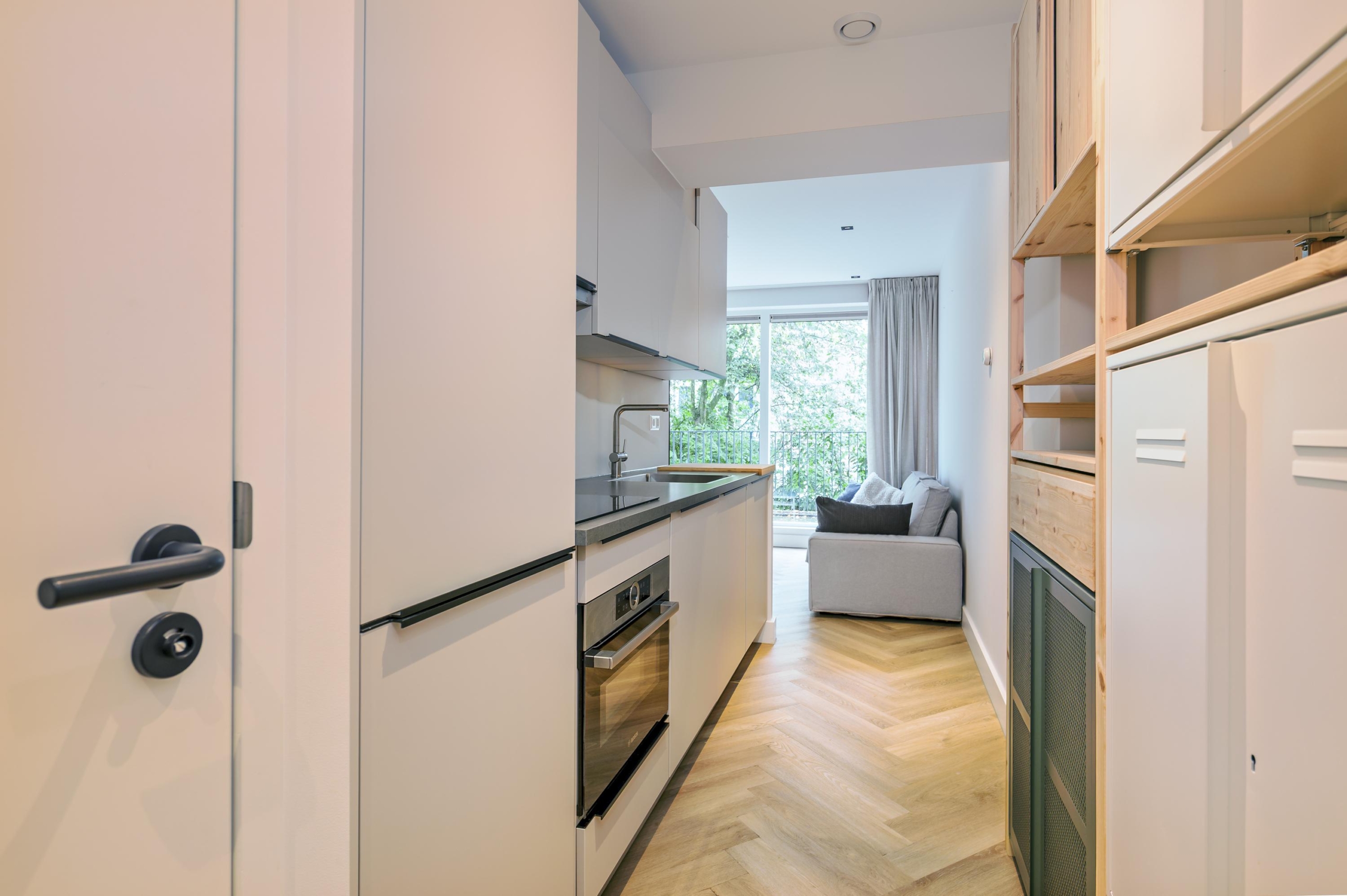Met een gebruiksoppervlakte van ca. 34 m² is dit stijlvolle tweekamerappartement op EIGEN GROND compact en efficiënt ingedeeld. Dankzij de ligging aan de achterzijde geniet je van extra rust. De woonkamer biedt toegang tot een riant terras waar je in alle privacy kunt genieten van de buitenlucht. De aanwezigheid van vloerverwarming zorgt het hele jaar door voor comfort en warm water wordt verzorgd via een centrale voorziening. Het appartement heeft verschillende designdetails zoals de scheidingswand tussen de slaap- en woonkamer en de praktische garderobekast.