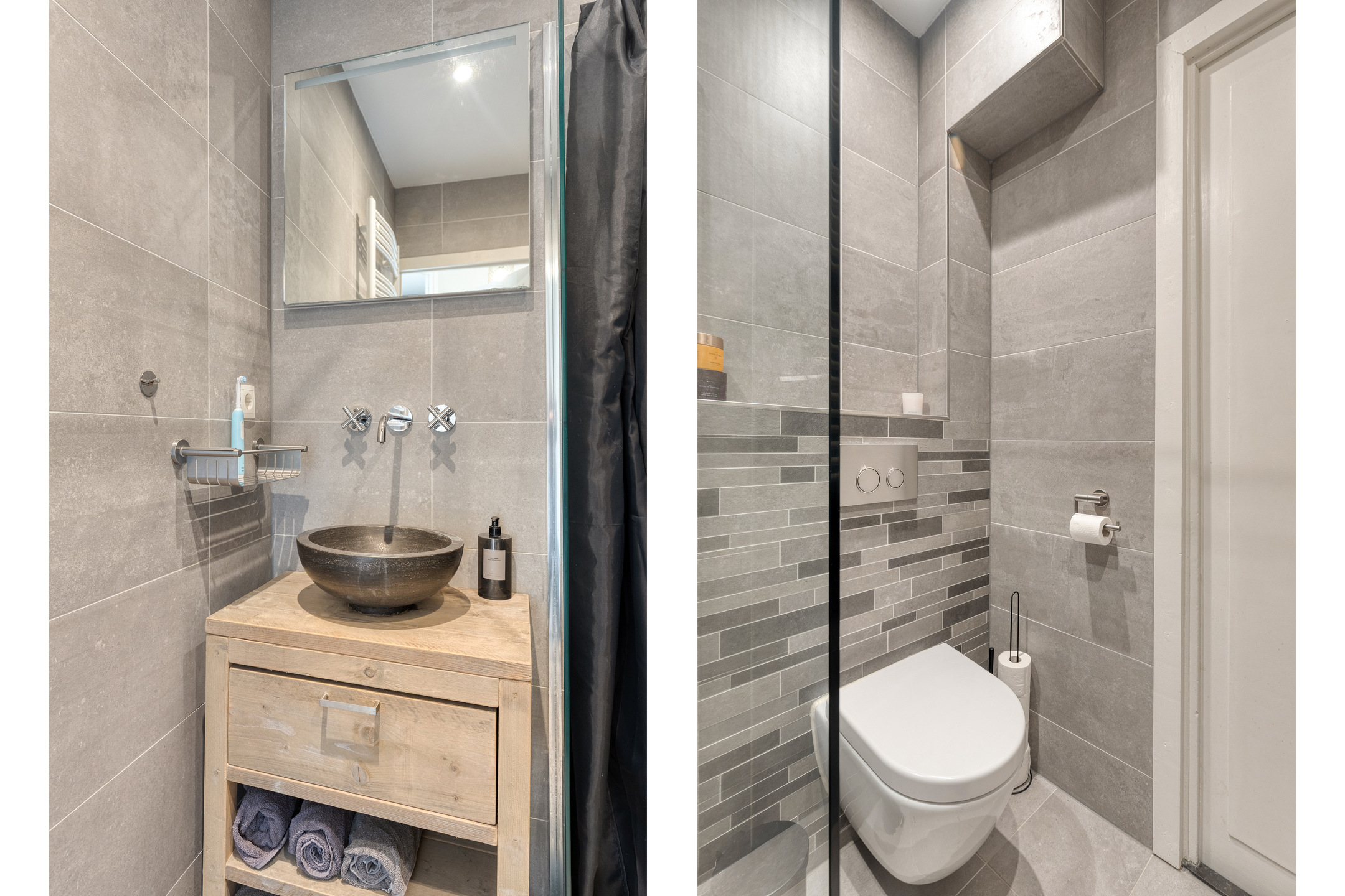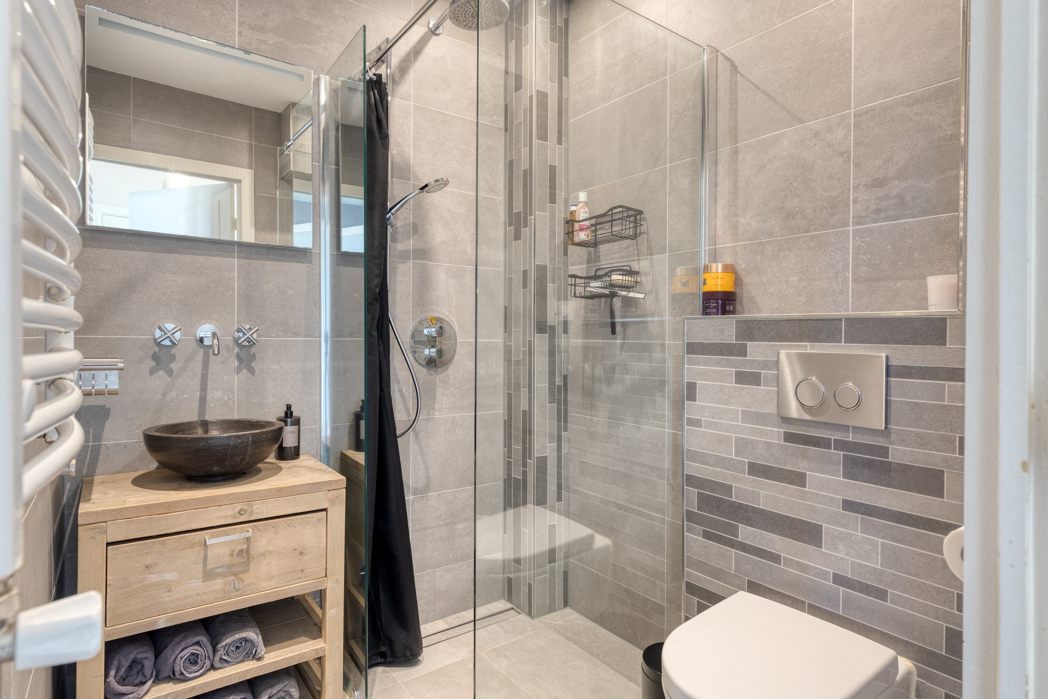 De badkamer is modern en stijlvol en is voorzien van een inloopdouche, een toilet, een handdoekenradiator en een wastafelmeubel met waskom.