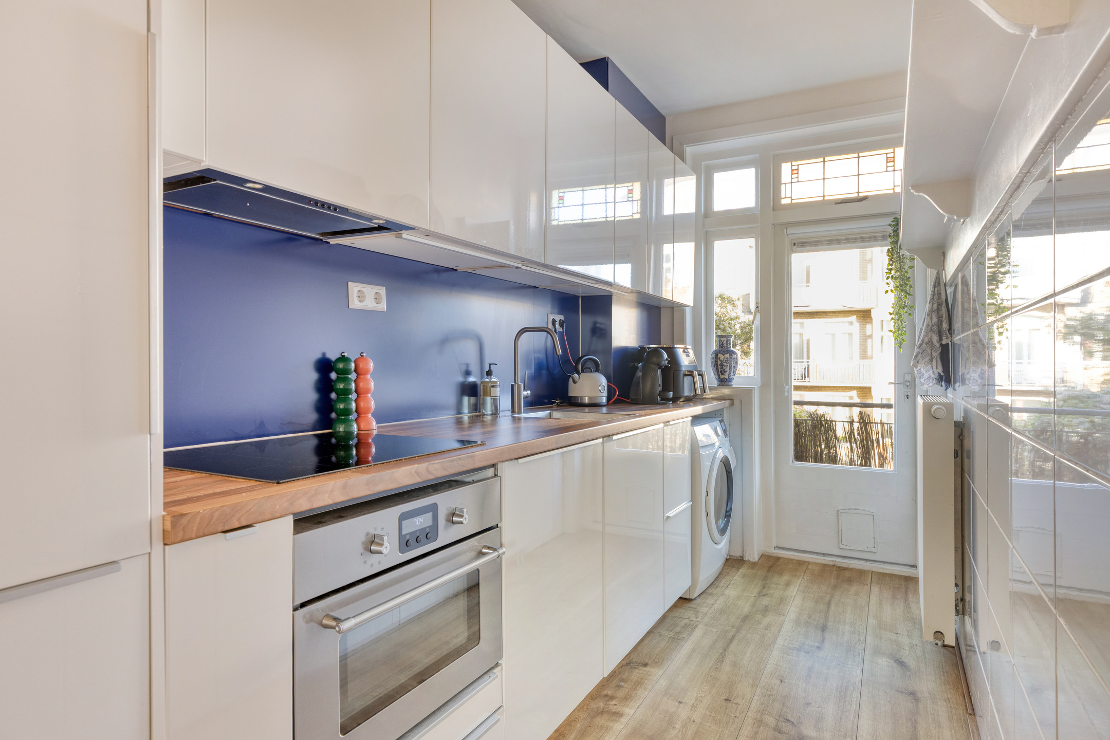 De keuken is modern en beschikt over inbouwapparatuur, zoals een combi-oven, een vaatwasser, een koelkast met vriesvak, een 4-pits inductiekookplaat en afzuigkap. Ook is er ruimte voor de wasmachine en is hier de CV-ketel opgesteld.