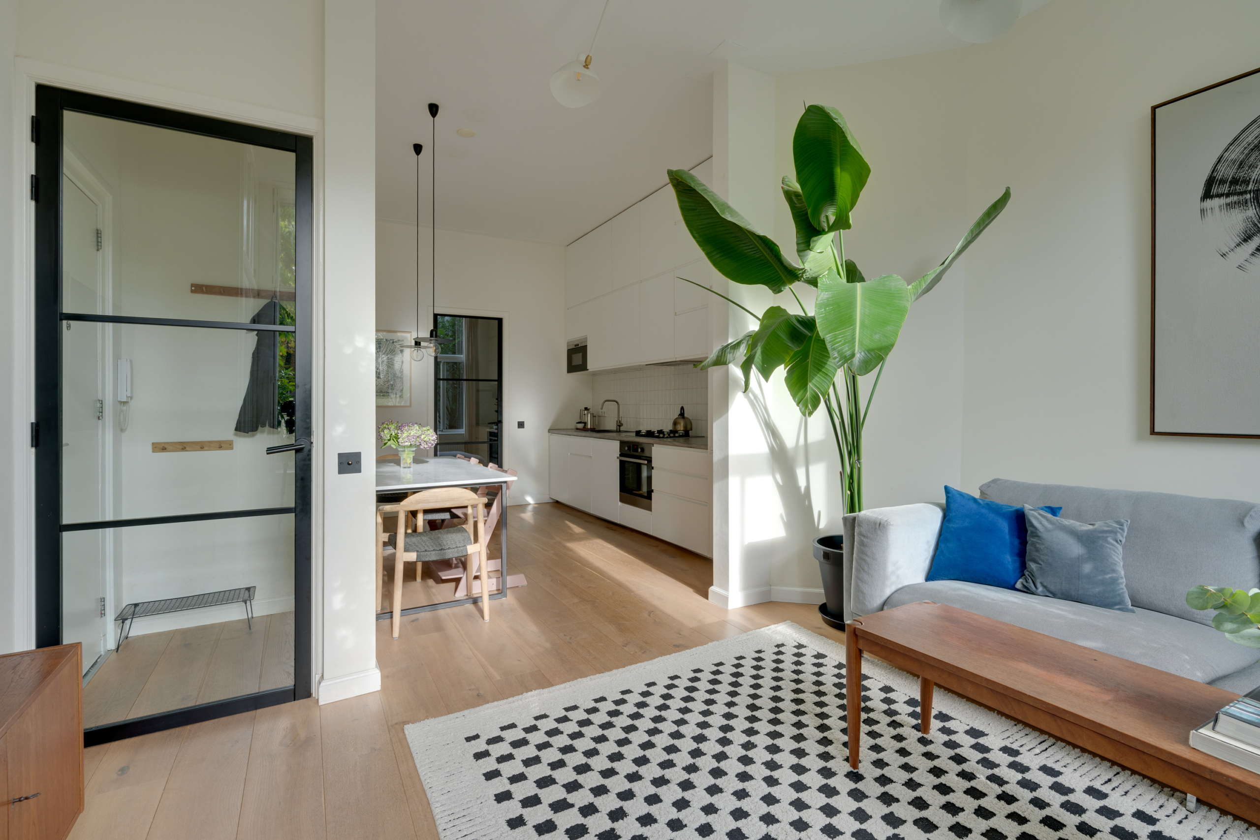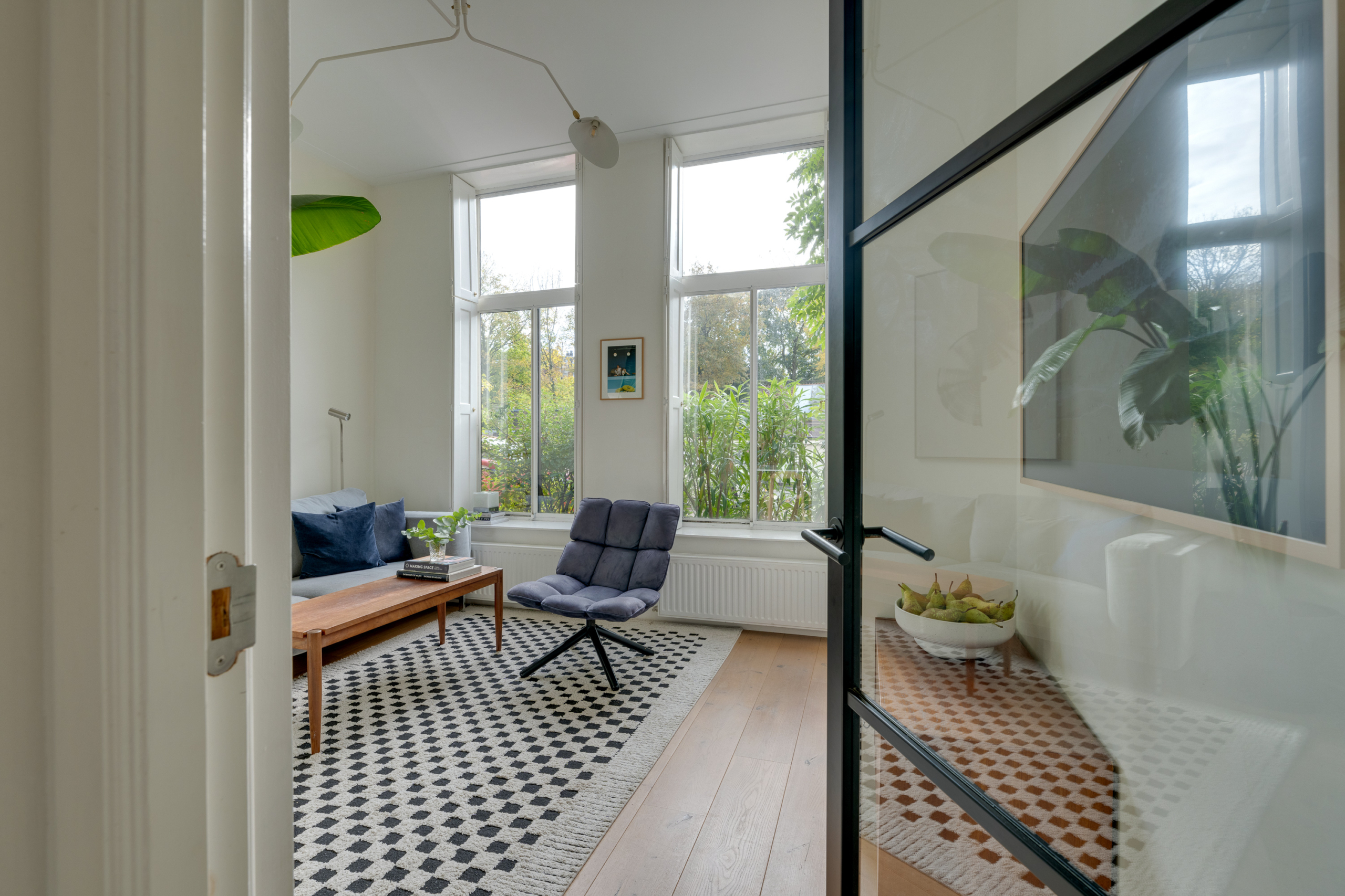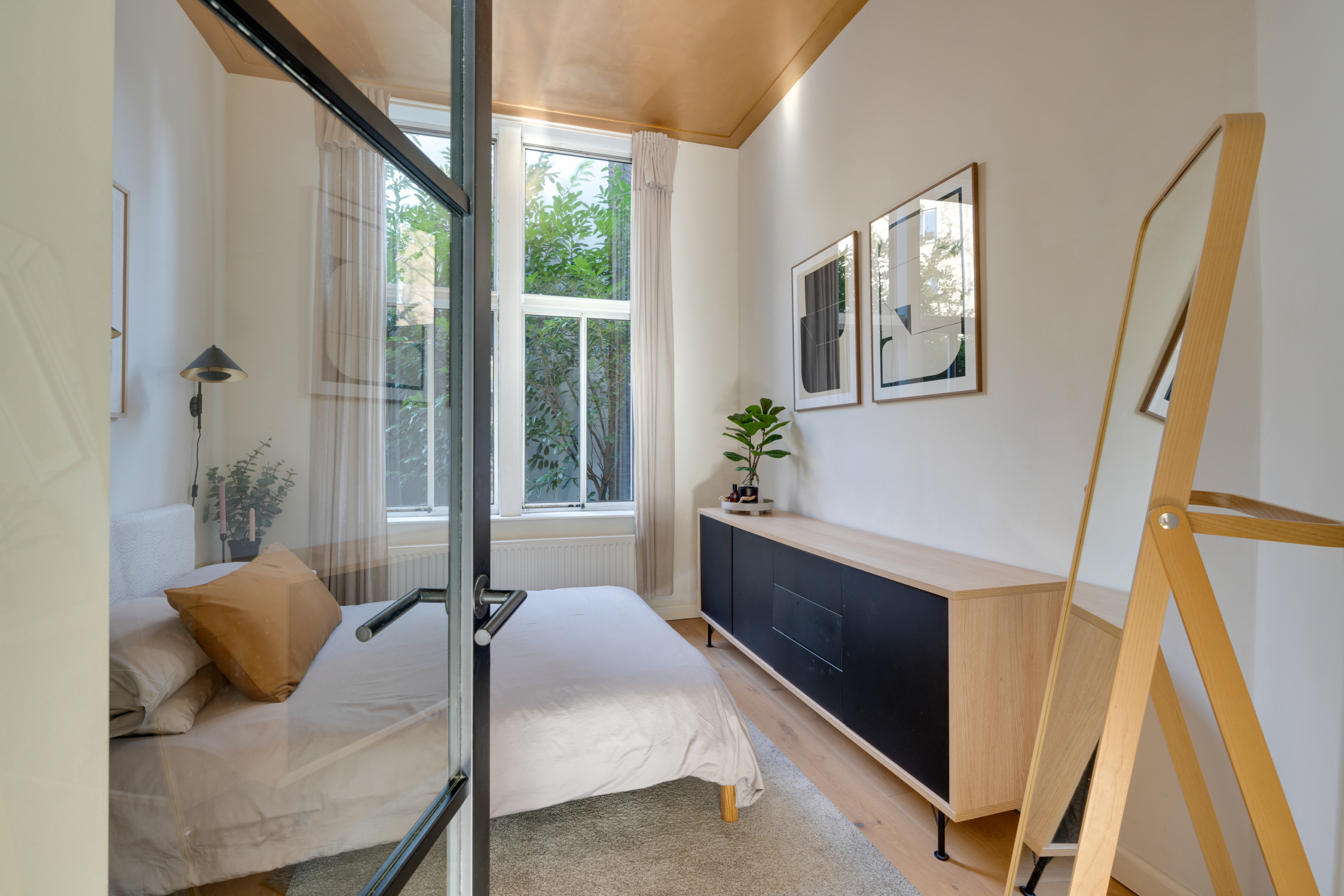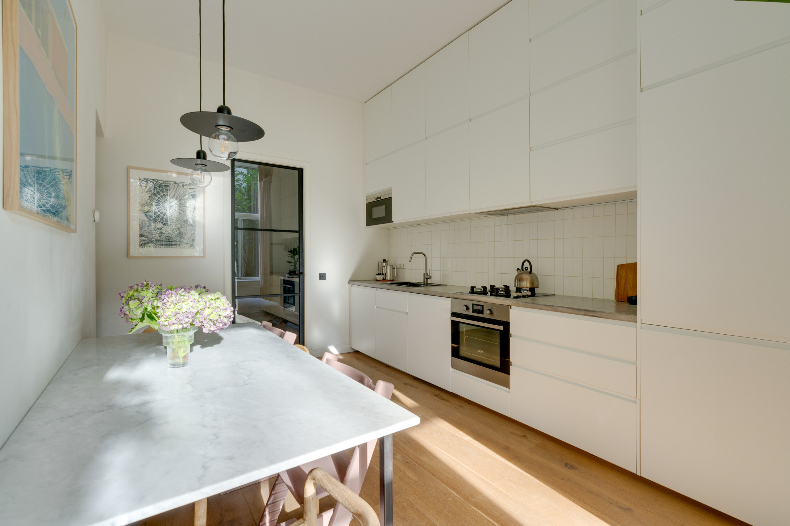 Sunny and modern 3-room ground-floor apartment with a garden and a separate storage unit, beautifully located on the waterfront of Hugo de Grootkade. This turnkey, fully renovated home with exceptionally high ceilings (3.23 m!) offers everything for comfortable and stylish living in the popular Frederik Hendrikbuurt area of Amsterdam.