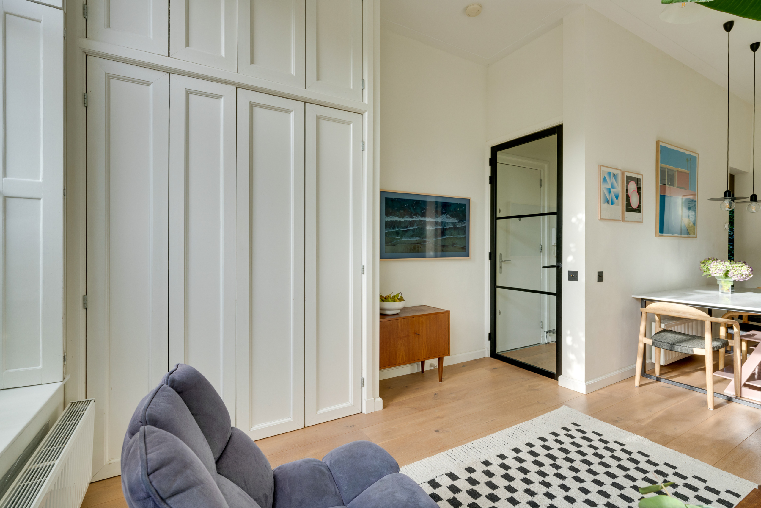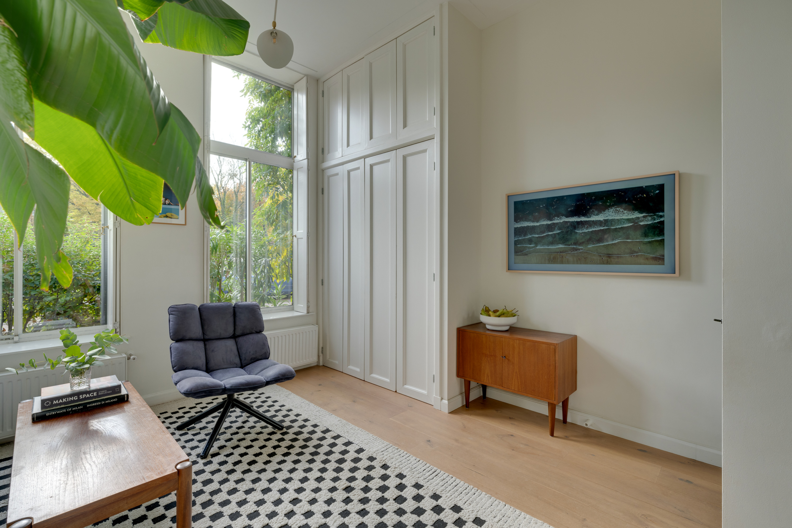 Deze zeer lichte woonkamer voorzien van een vasten kastenwand, waarin de meterkast is verwerkt. De hoogte van het plafond wordt benadrukt door de hoge raampartijen, waardoor er veel lichtinval is. De ramen aan de voorzijde zijn voorzien van fraaie deelbare, houten luiken.