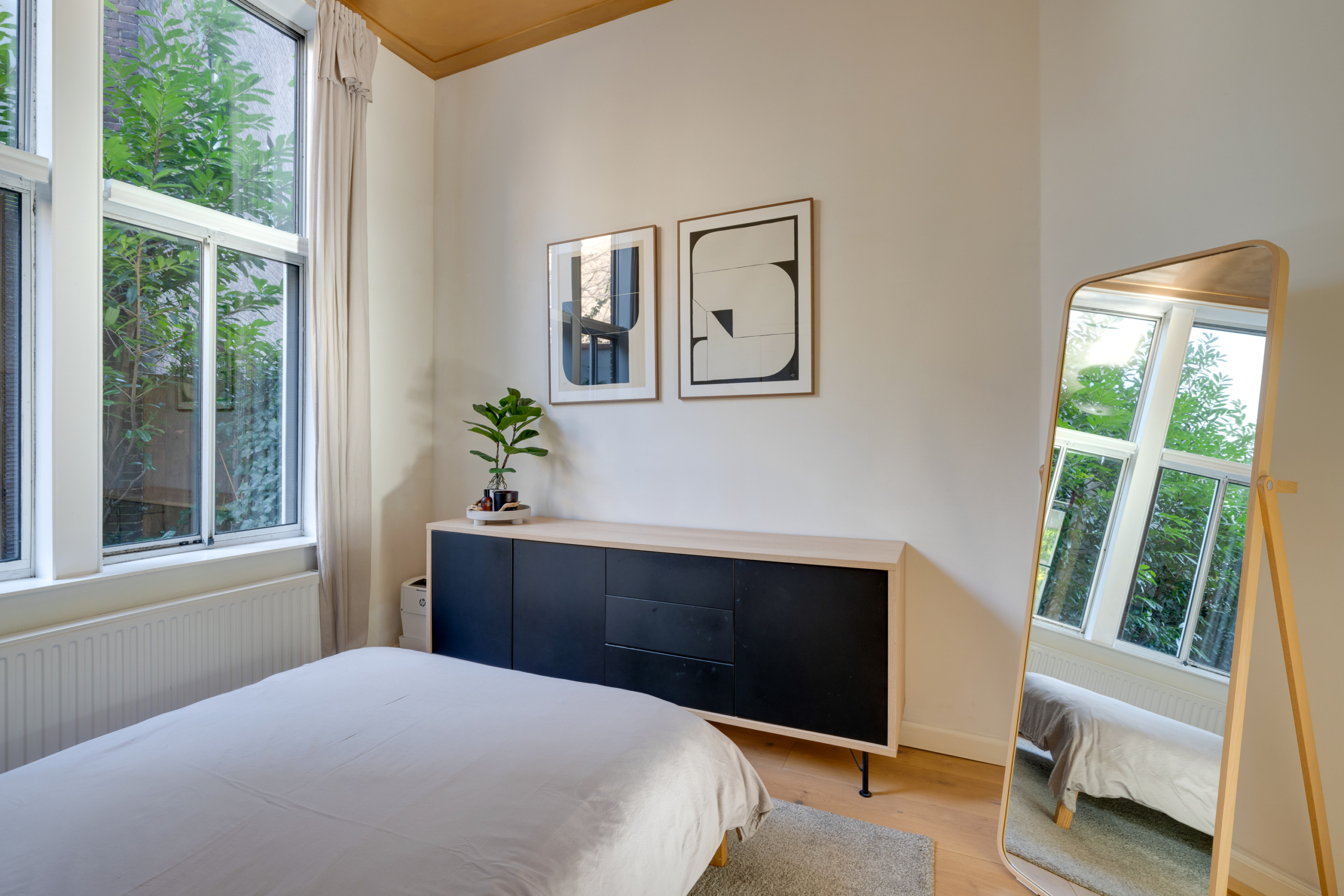 Beide slaapkamers zijn gelegen aan de achterzijde van het appartement en hebben eveneens de hoge plafonds. De master bedroom heeft een vaste kast en een oppervlakte van ruim 11m2.