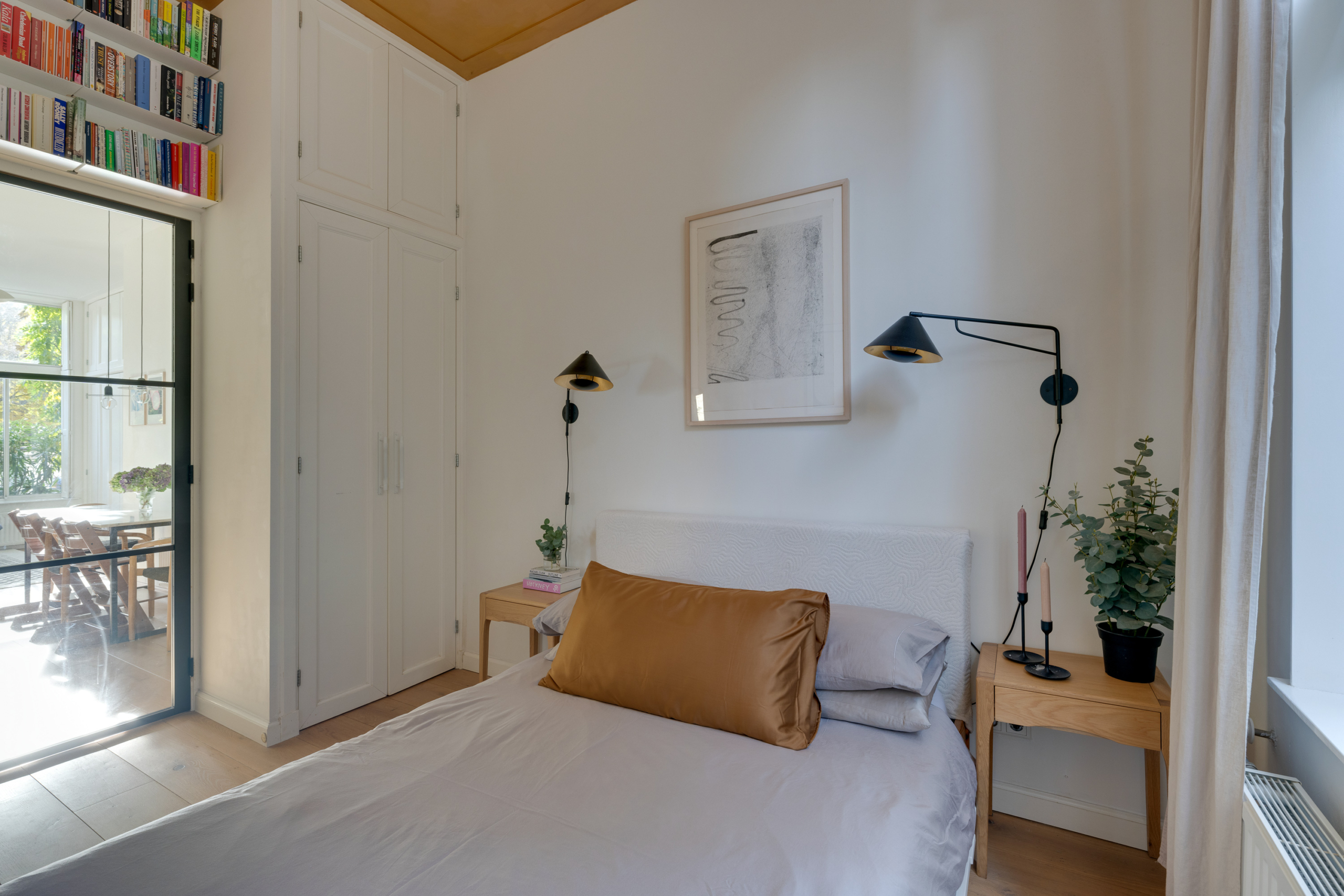The second bedroom makes clever use of the ceiling height, offering two sleeping spaces, a built-in closet, and a children’s desk – an ideal family bedroom, guest room or home office. This bedroom opens directly onto the green garden at the rear.