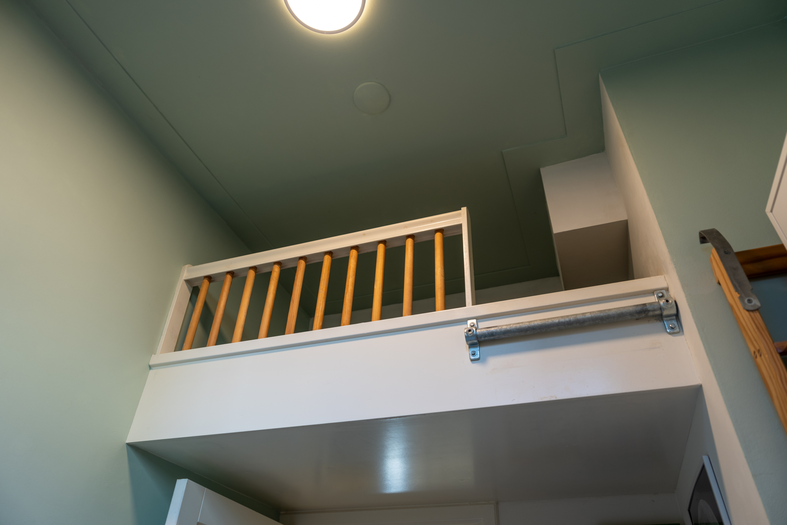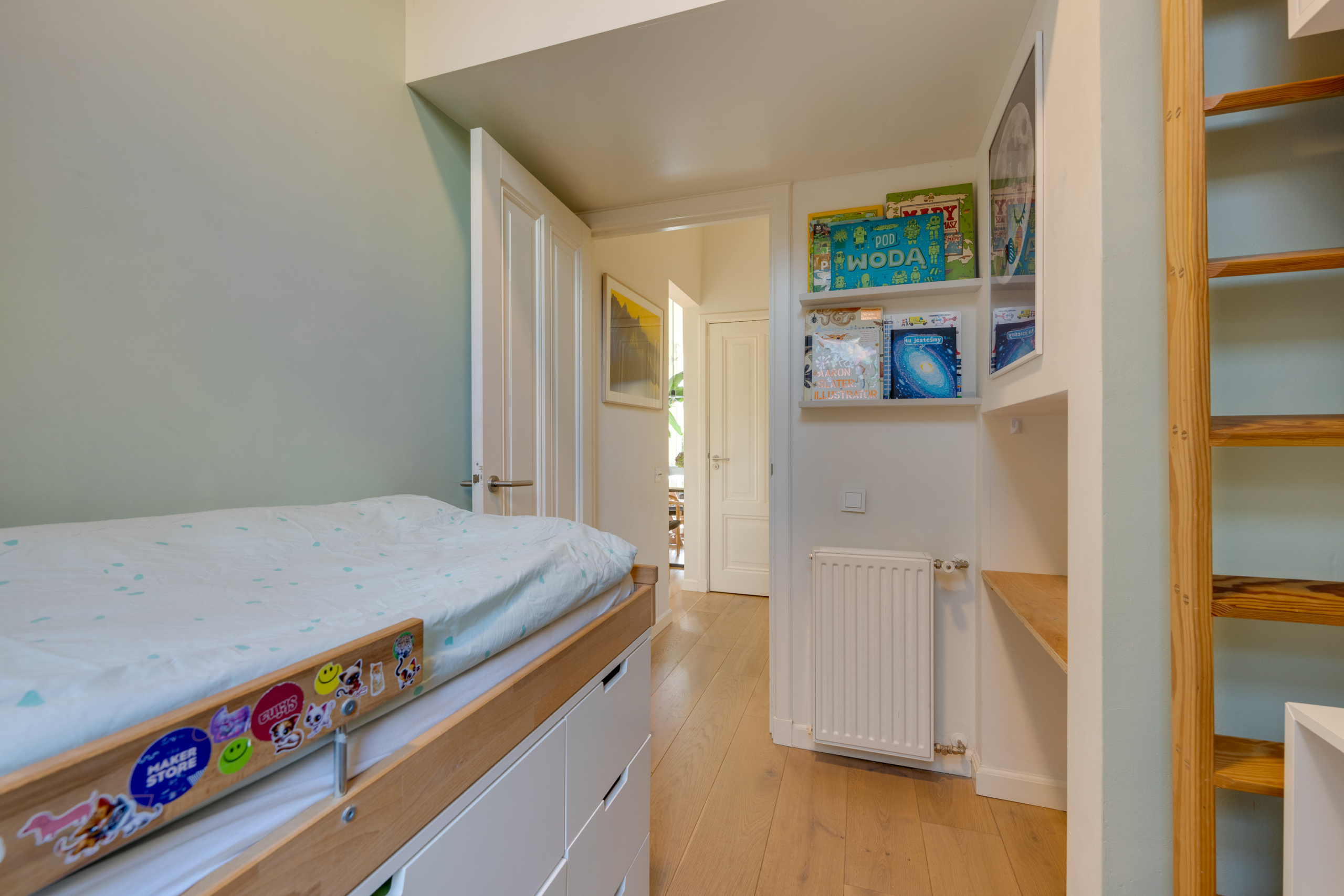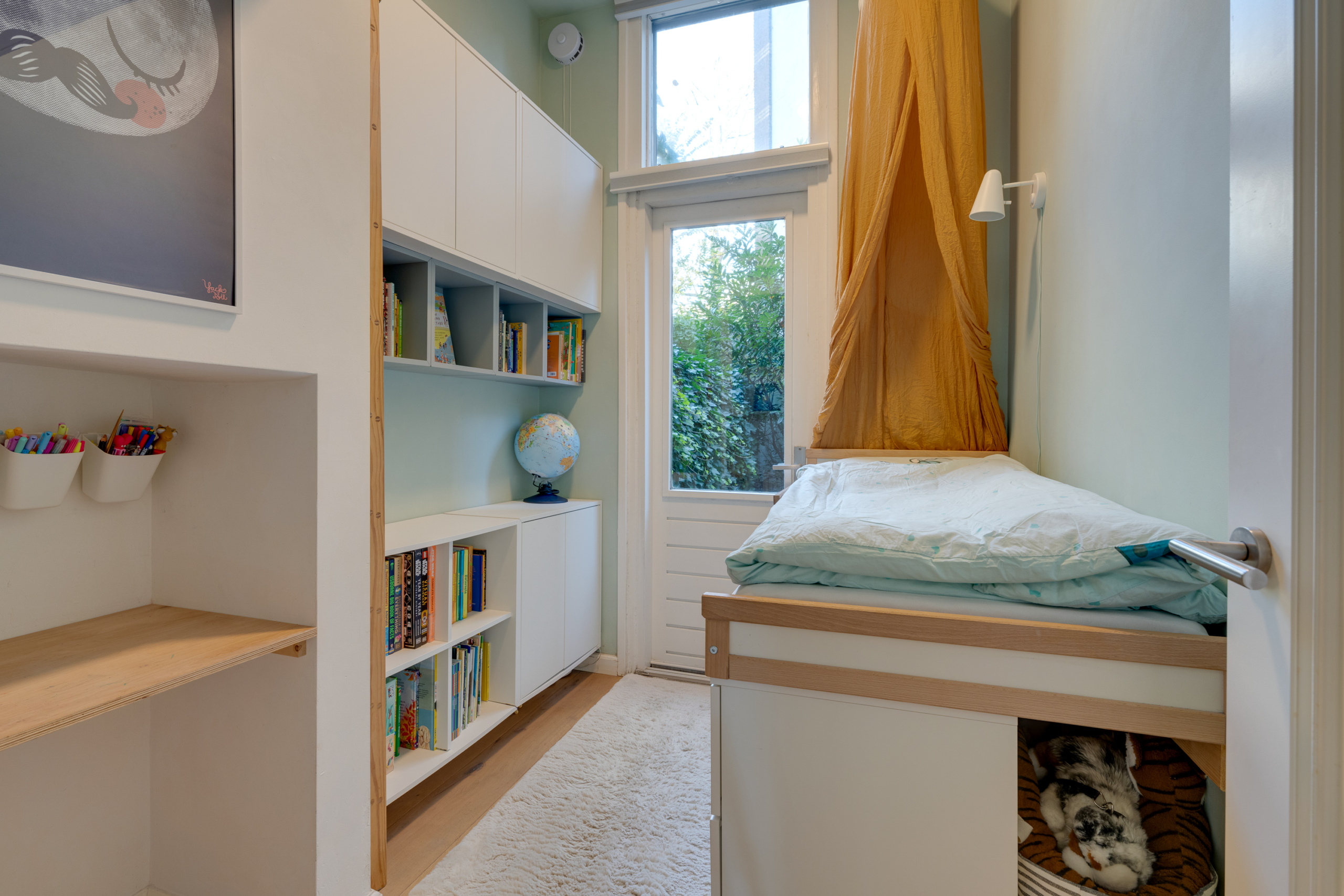 In de tweede slaapkamer is vernuftig gebruik gemaakt van de hoogte van het plafond. Zo zijn er twee slaapplekken gecreëerd, is er een vaste kast aanwezig én is er een kinderbureau waar aan geknutseld kan worden.