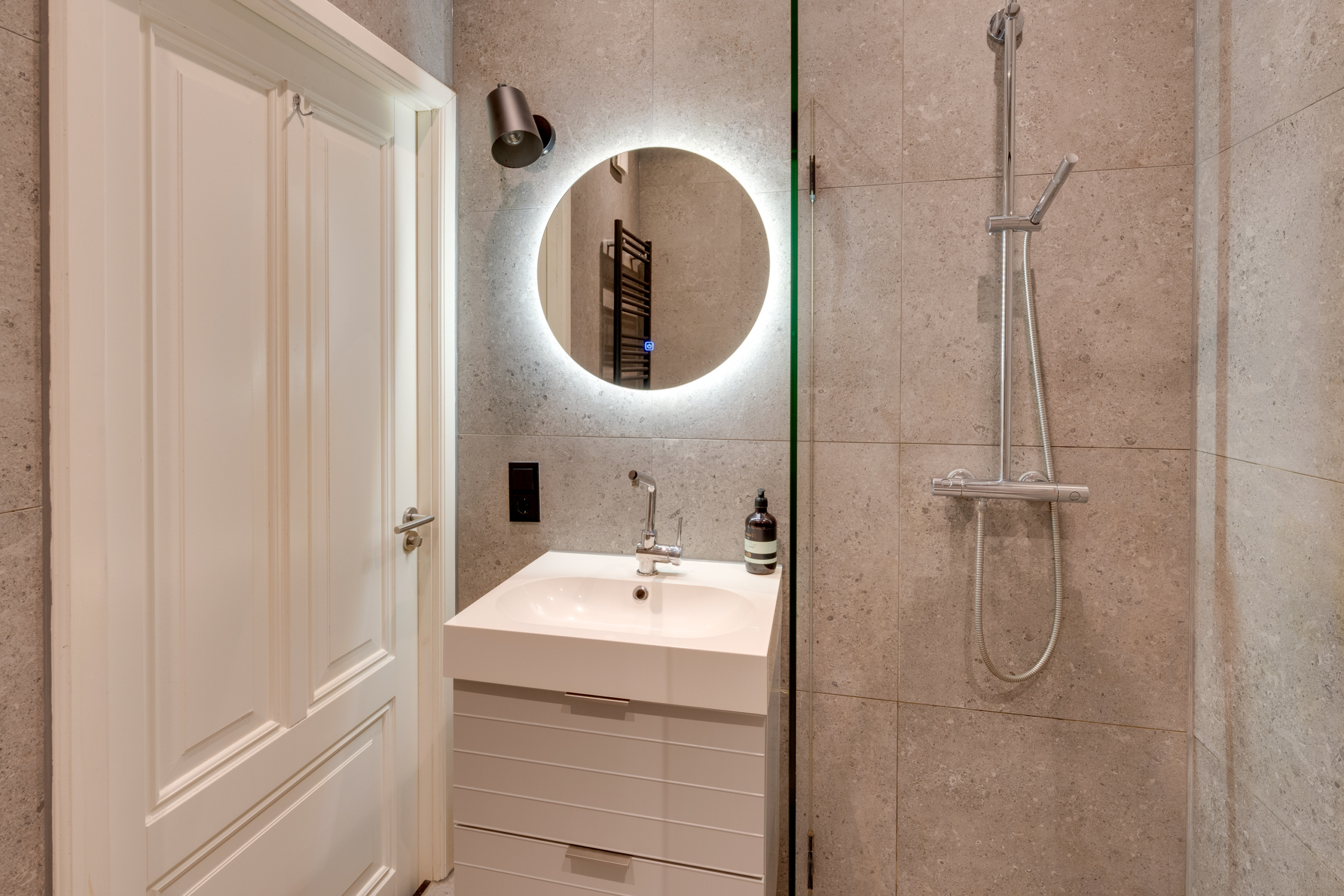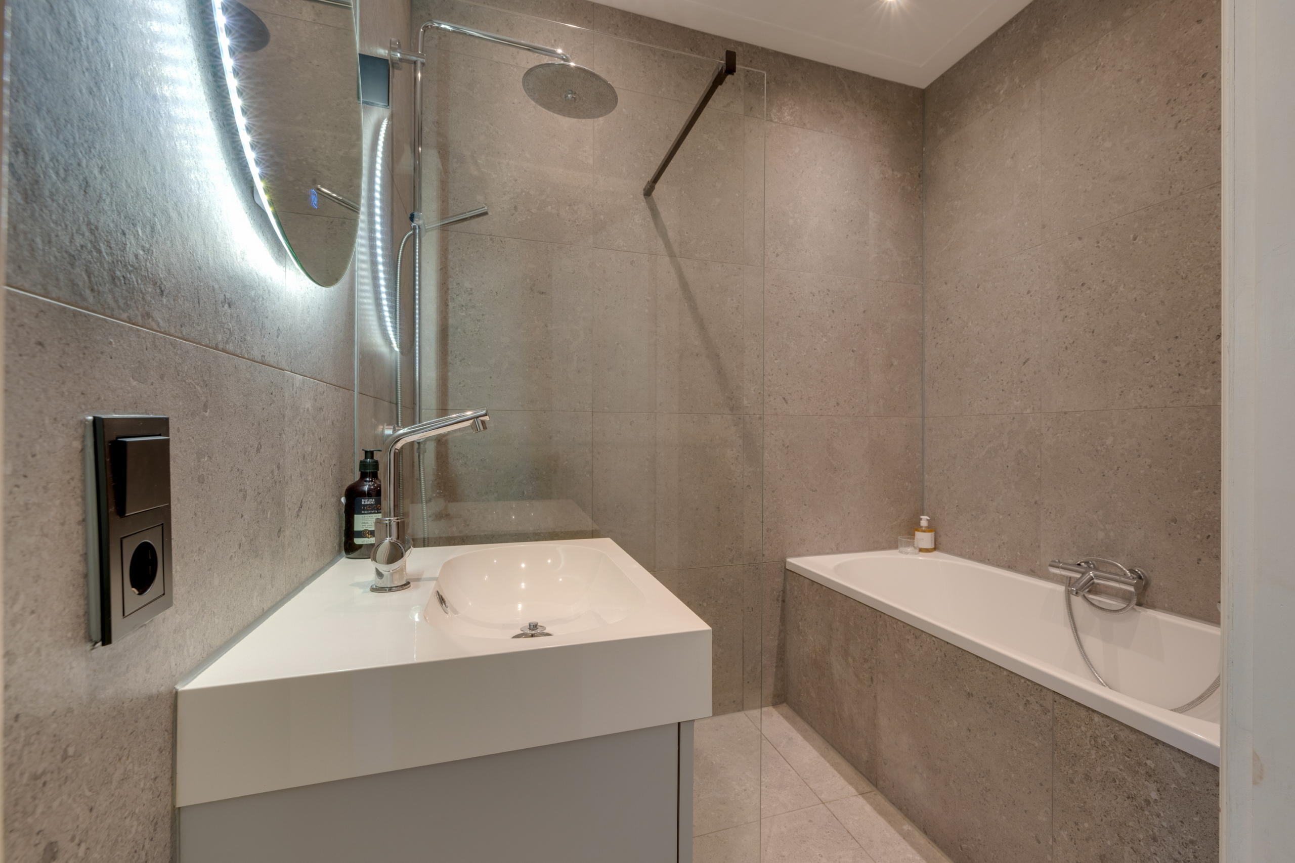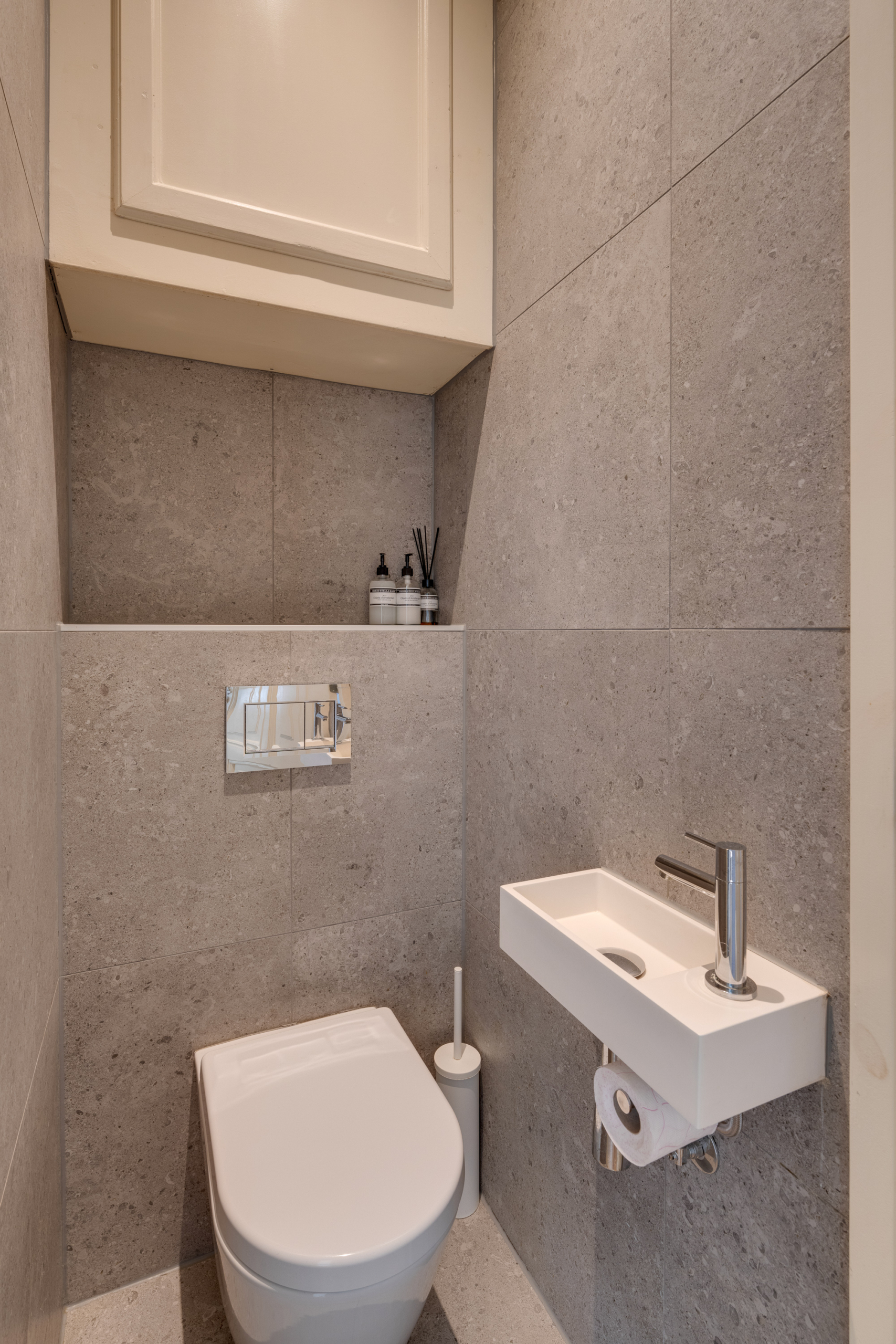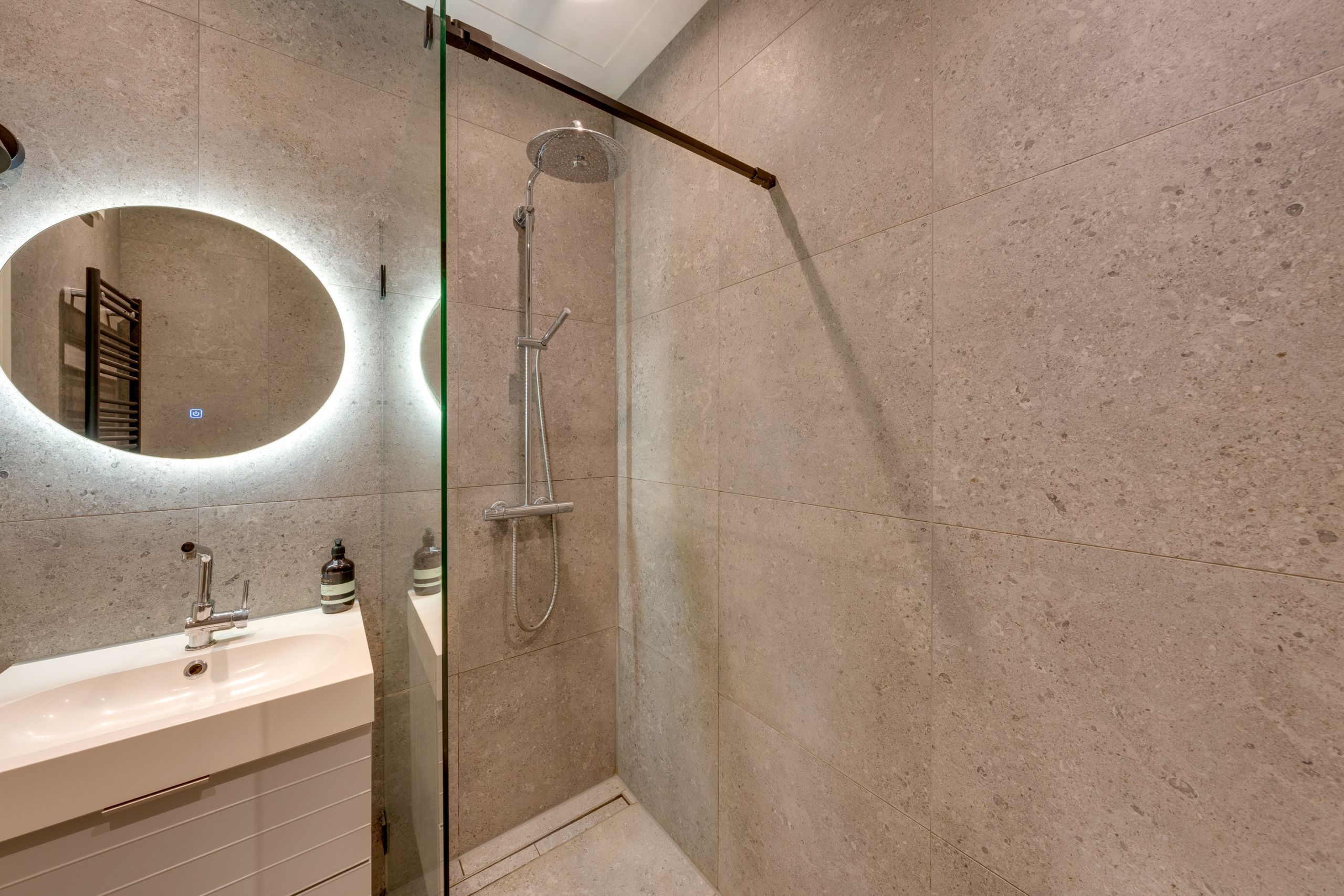 De toiletruimte is voorzien van een hangend toilet en fonteintje, terwijl in de badkamer een inloopdouche, een ligbad en een fraai wastafelmeubel het sanitair compleet maken.