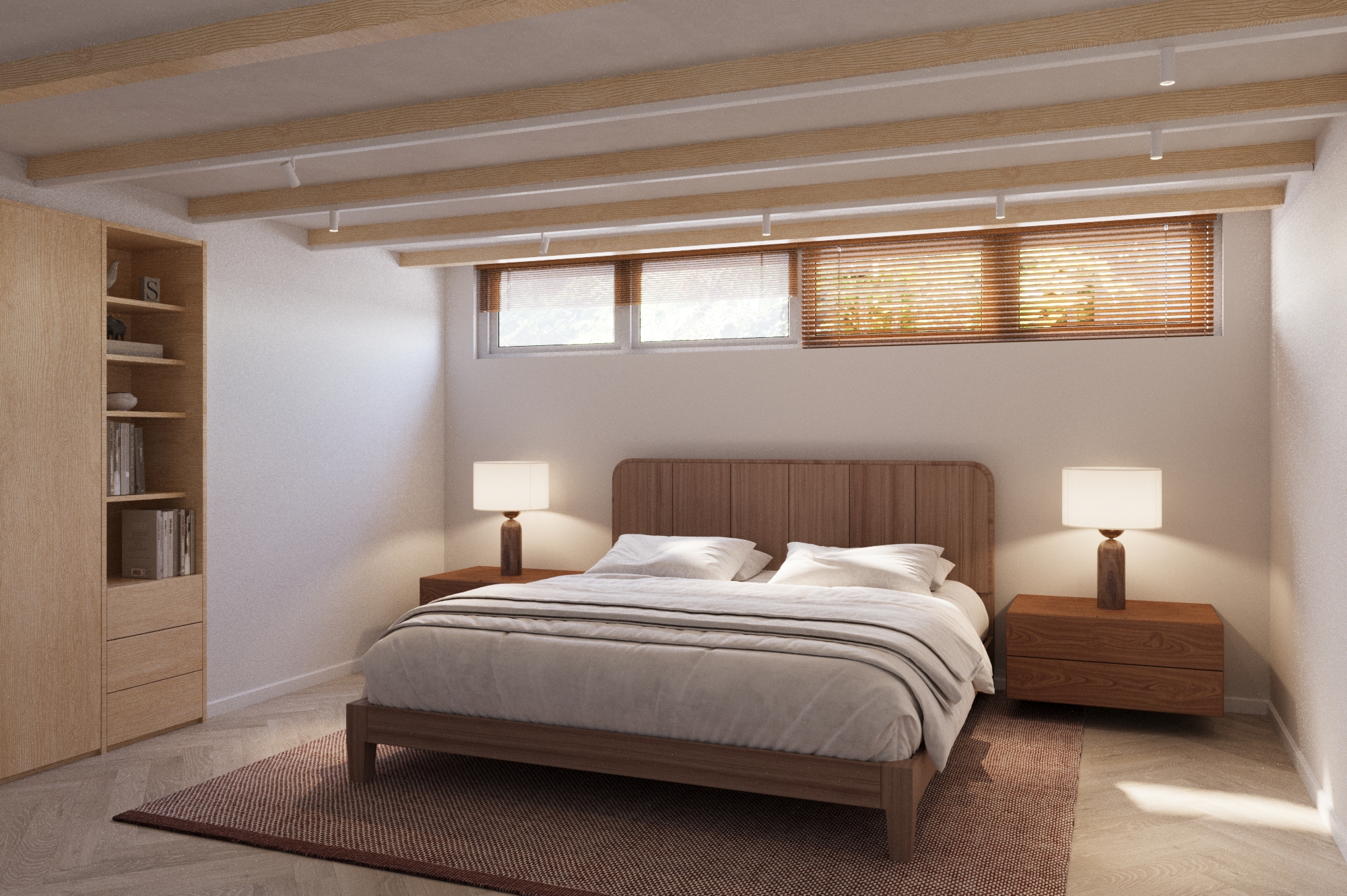 Souterrain: directe toegang tot de open ruimte, thans in gebruik als werkruimte en woonkamer, aan de voorzijde van het souterrain gelegen. Twee ruime slaapkamers liggen aan de achterzijde. Een wastafel met inloopdouche is naast één van de slaapkamers gelegen.