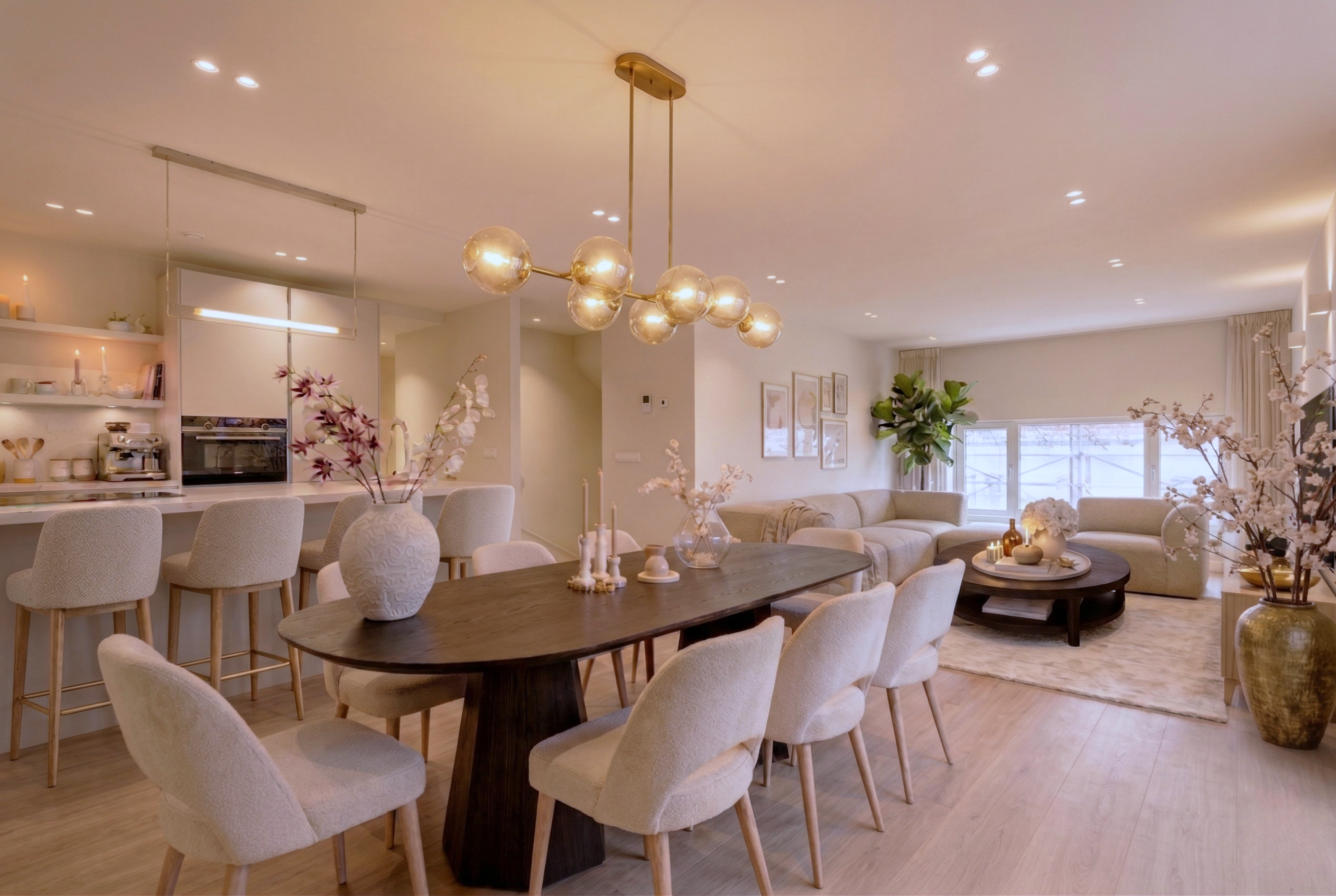 De open keuken met kookeiland vormt het hart van de woning en is uitgerust met hoogwaardige Siemens inbouwapparatuur, een luxe werkblad en een strak, tijdloos design. Een perfecte plek om te koken, dineren en gasten te ontvangen.