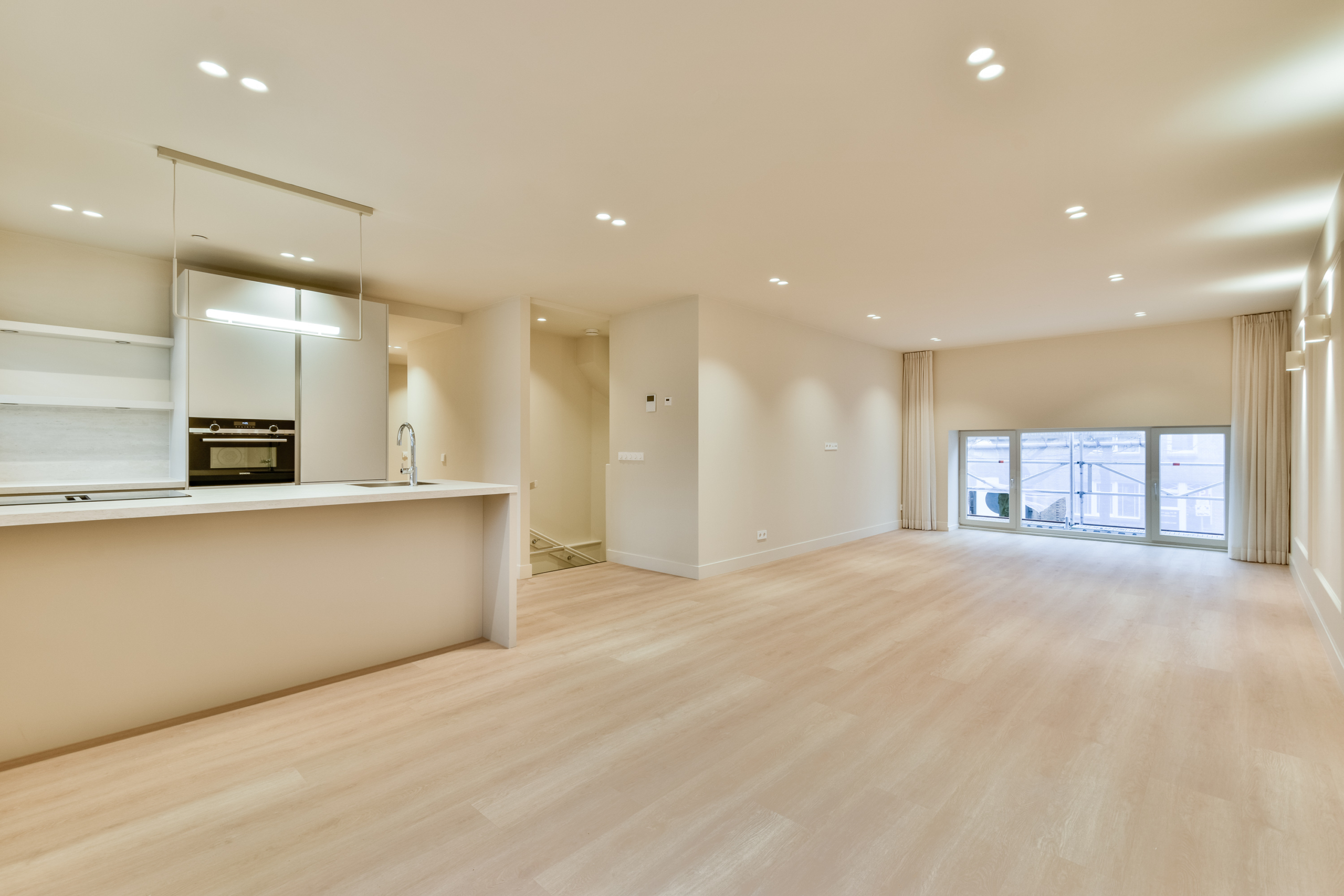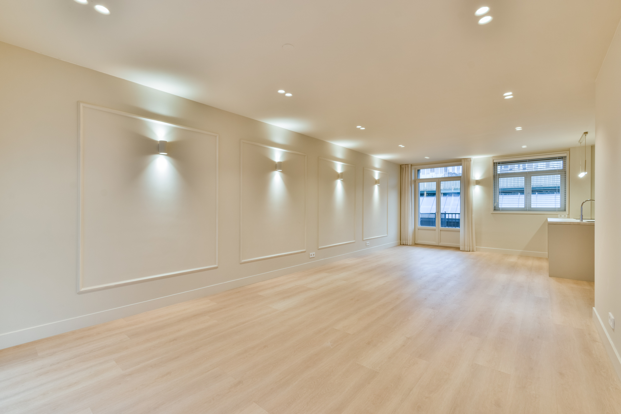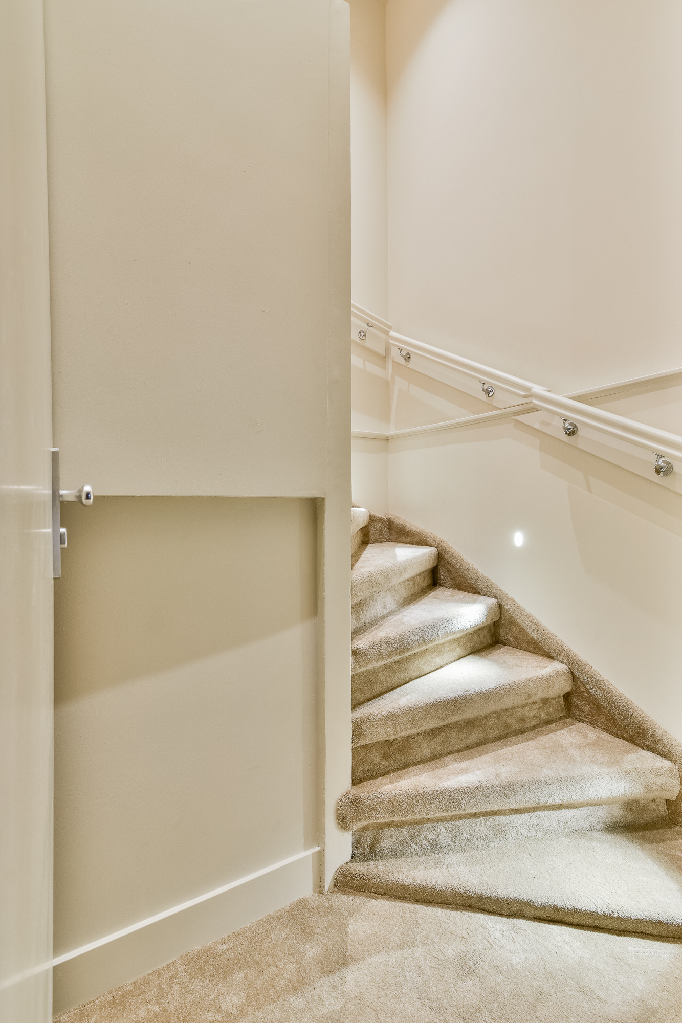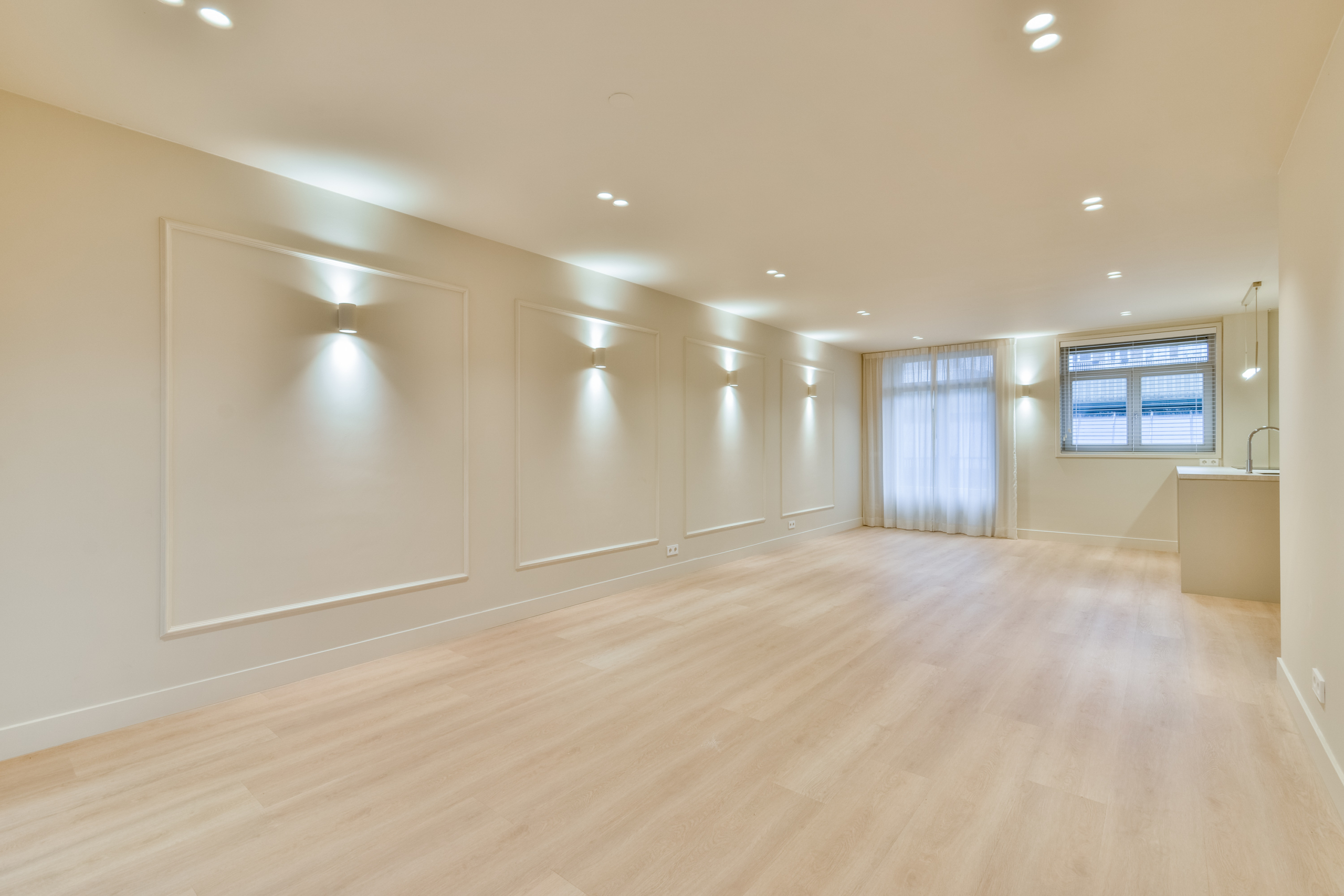 Via de eigen entree bereik je de tussenverdieping waar direct de hoogwaardige afwerking opvalt. De lichte leefruimte is strak gestuukt en voorzien van geïntegreerde spotverlichting en subtiel weggewerkte gordijnrails, verfijnde details die zorgen voor een rustige, luxe uitstraling.