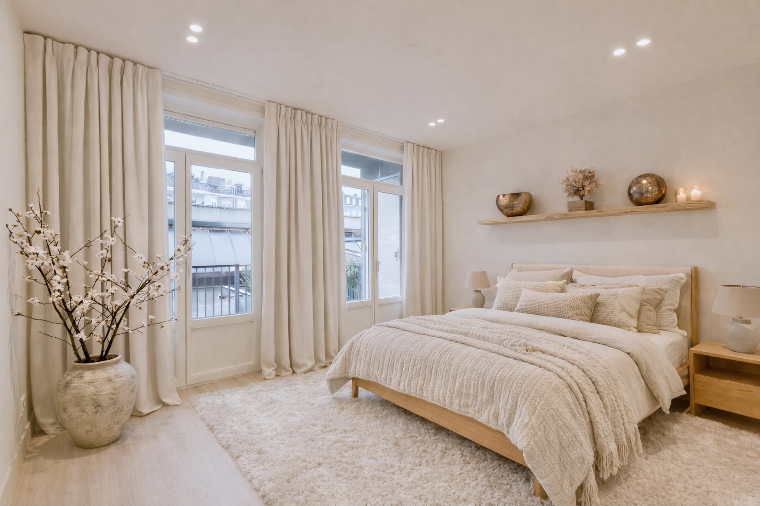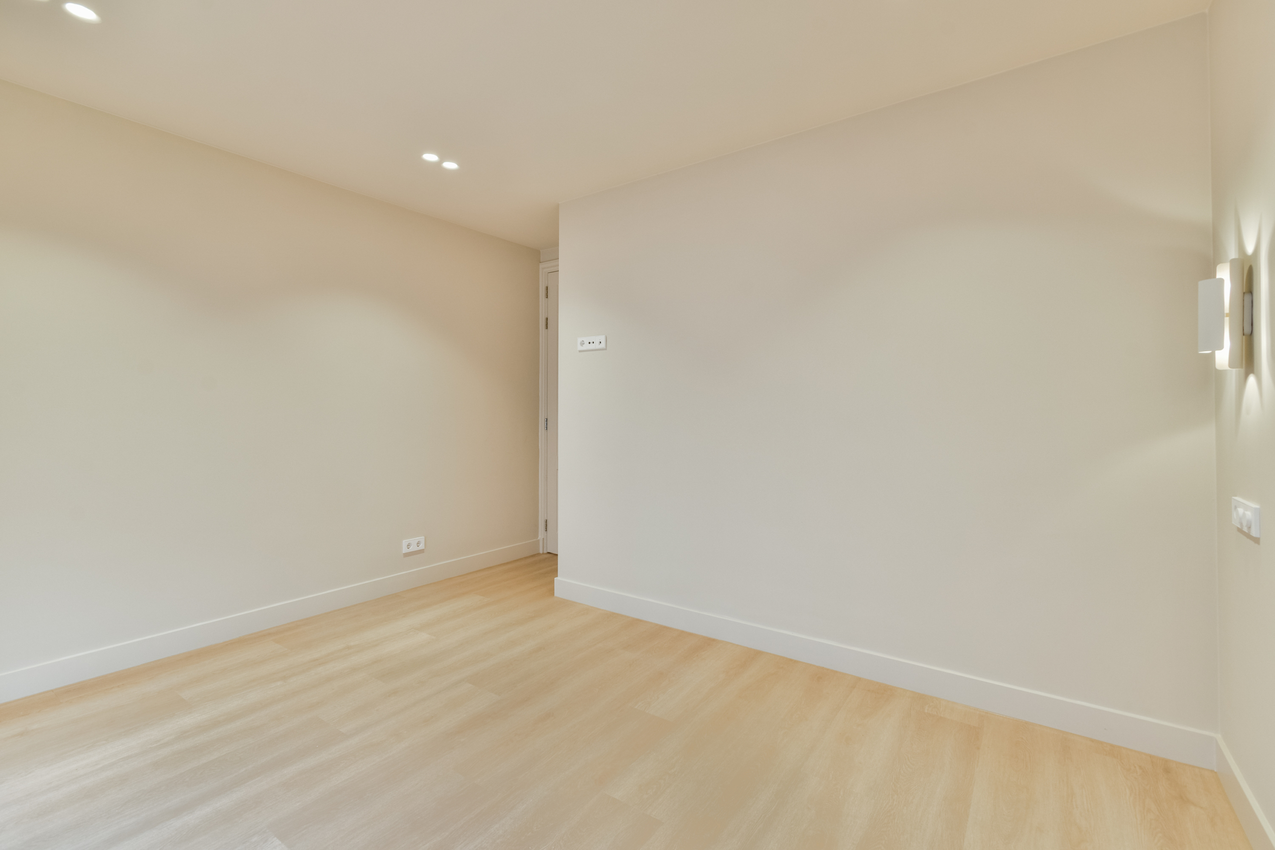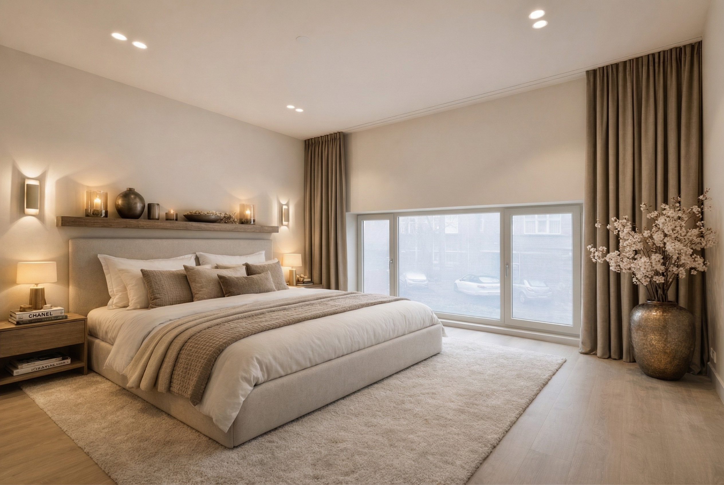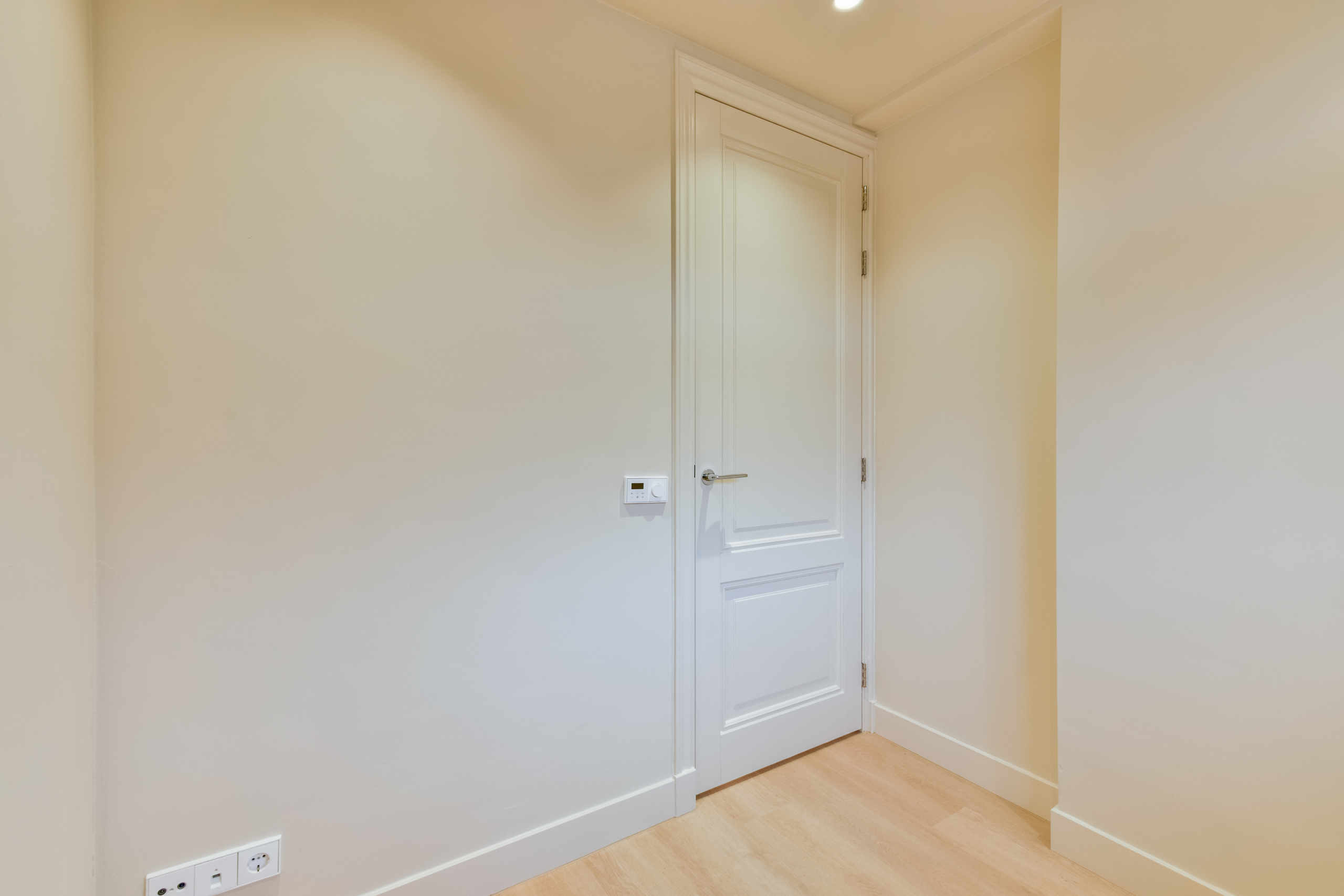 Via de eigen entree bereik je de tussenverdieping waar direct de hoogwaardige afwerking opvalt. De lichte leefruimte is strak gestuukt en voorzien van geïntegreerde spotverlichting en subtiel weggewerkte gordijnrails, verfijnde details die zorgen voor een rustige, luxe uitstraling.