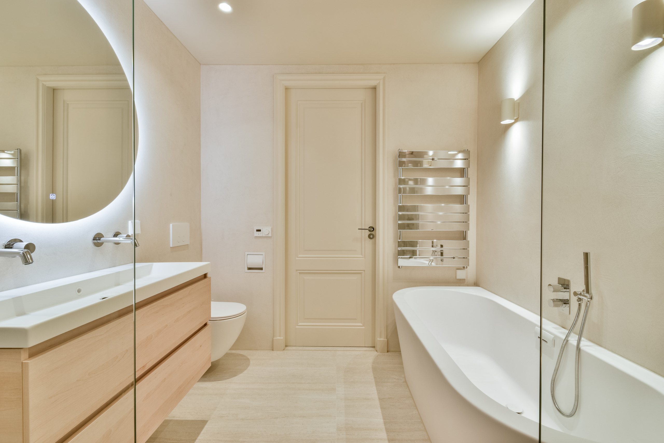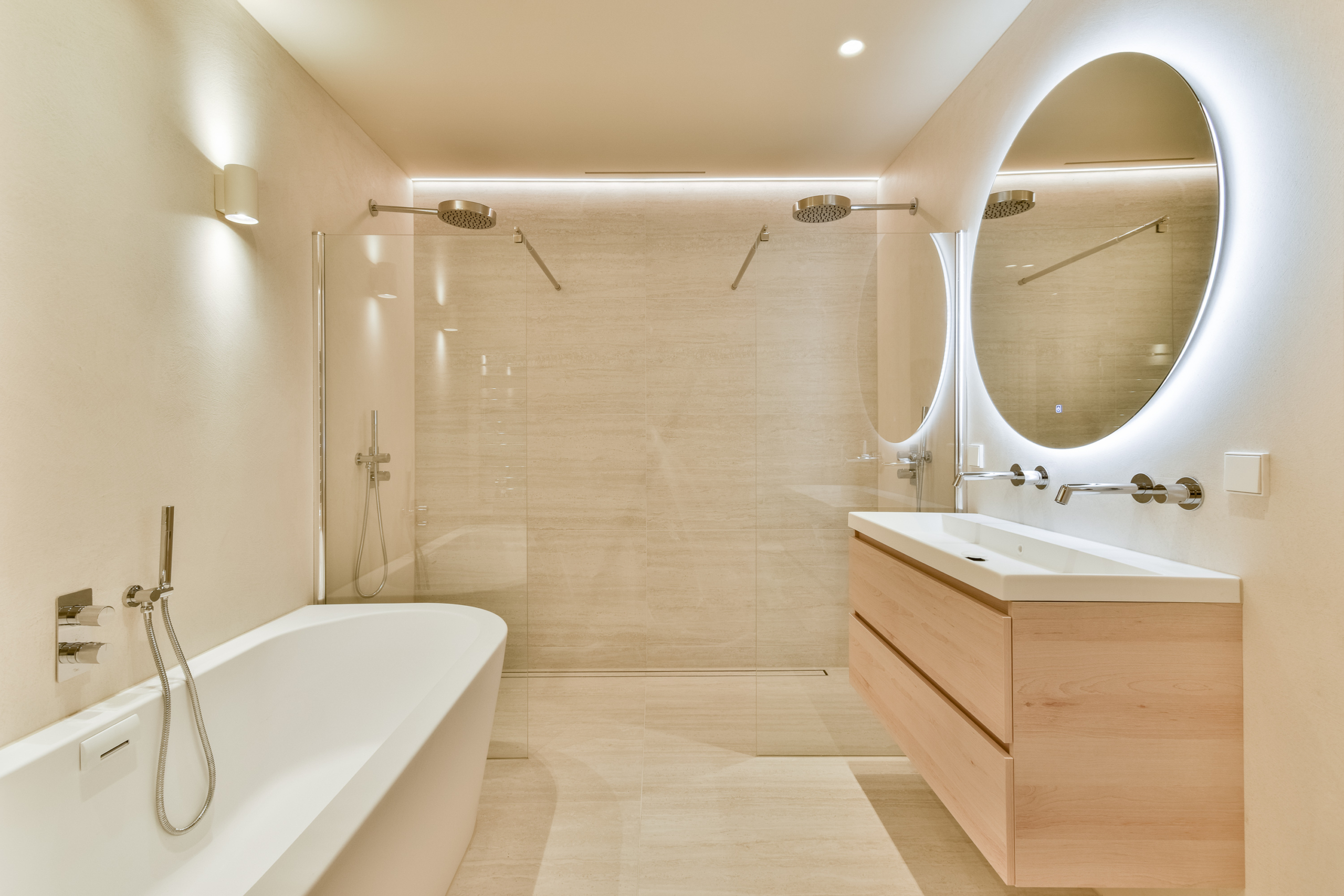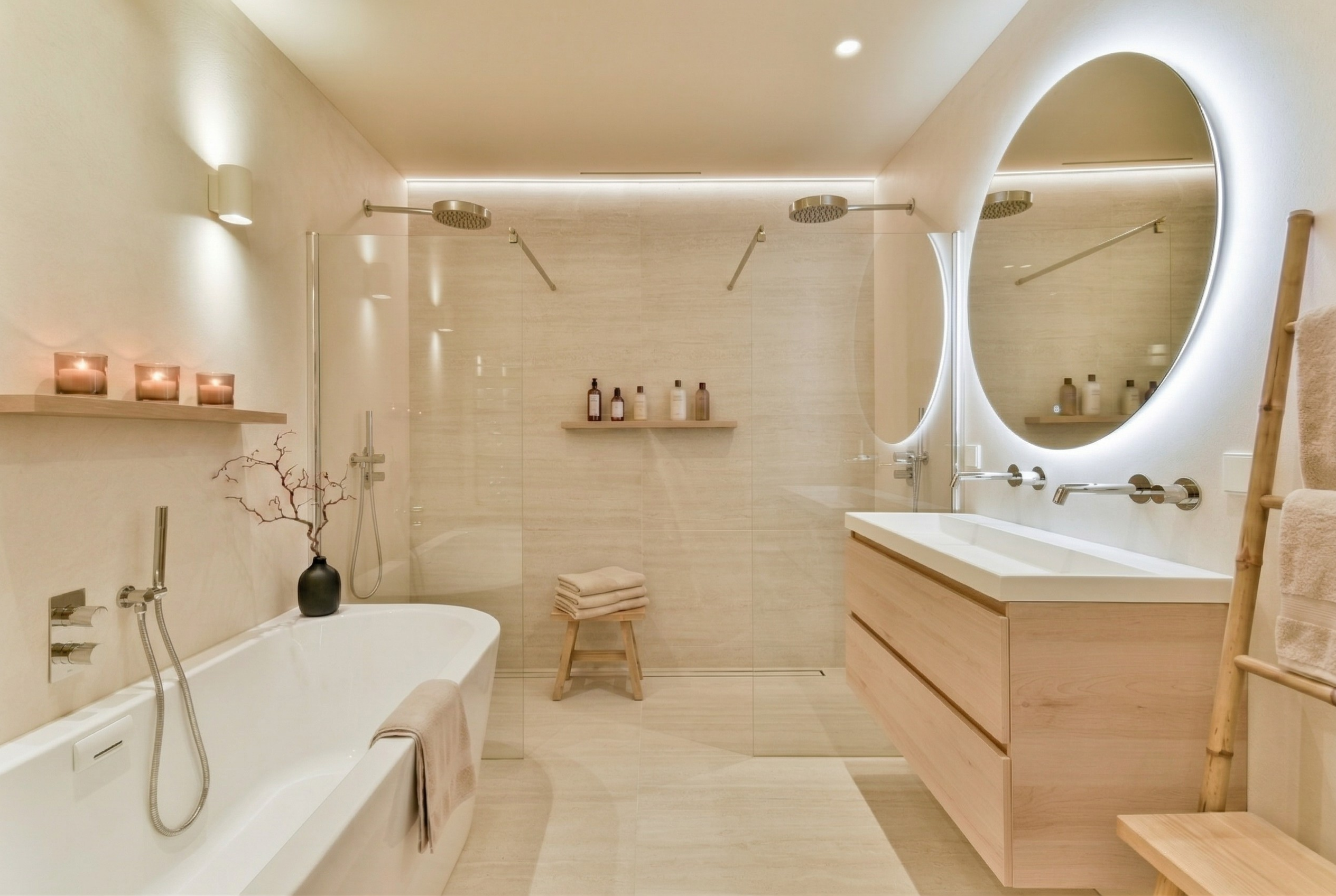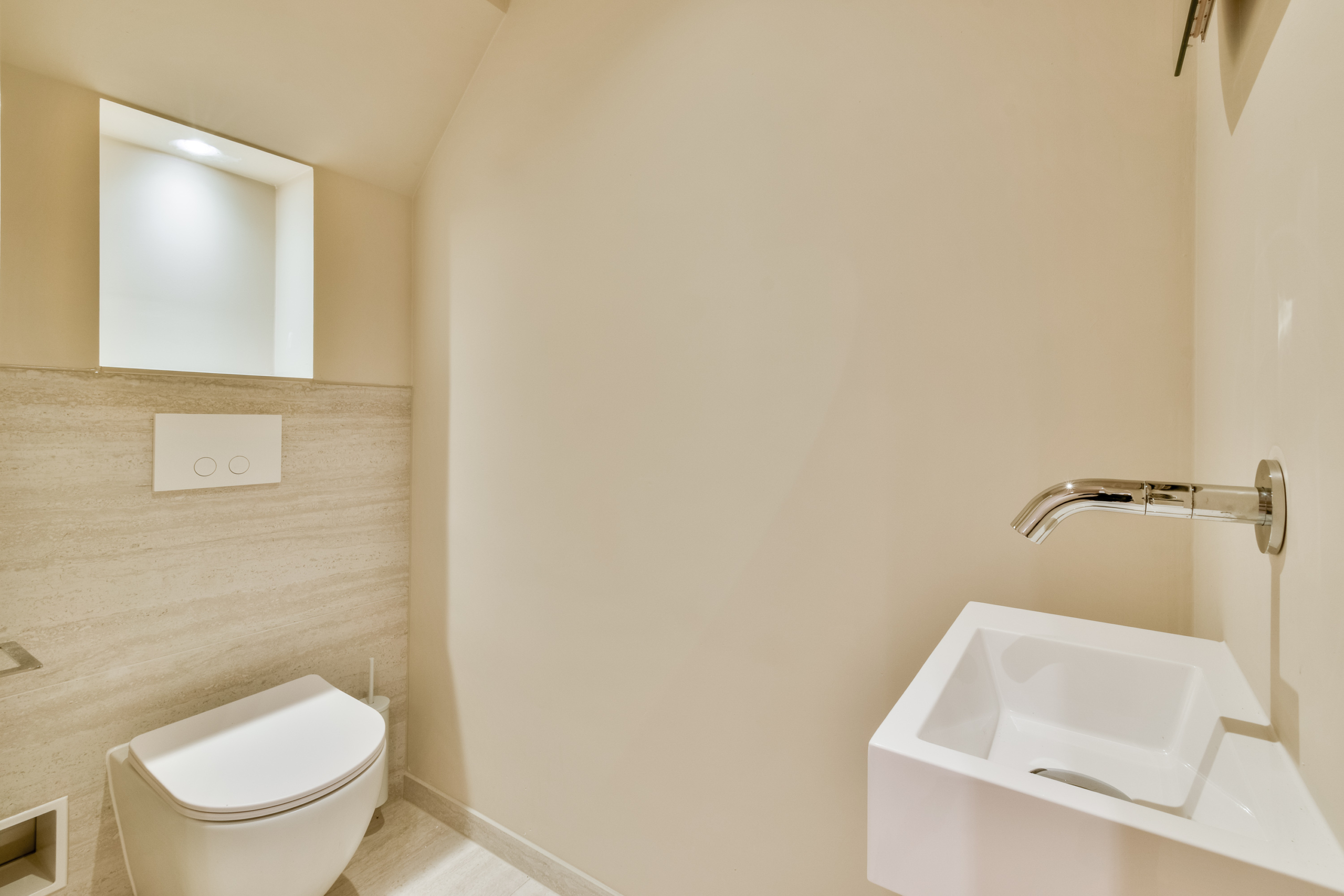 De badkamer straalt pure luxe uit en is uitgevoerd met een semi-vrijstaand ligbad, een royale dubbele inloopdouche en een dubbele wastafel met hoogwaardige designkranen. Daarnaast is er een separaat toilet en een aparte wasruimte.