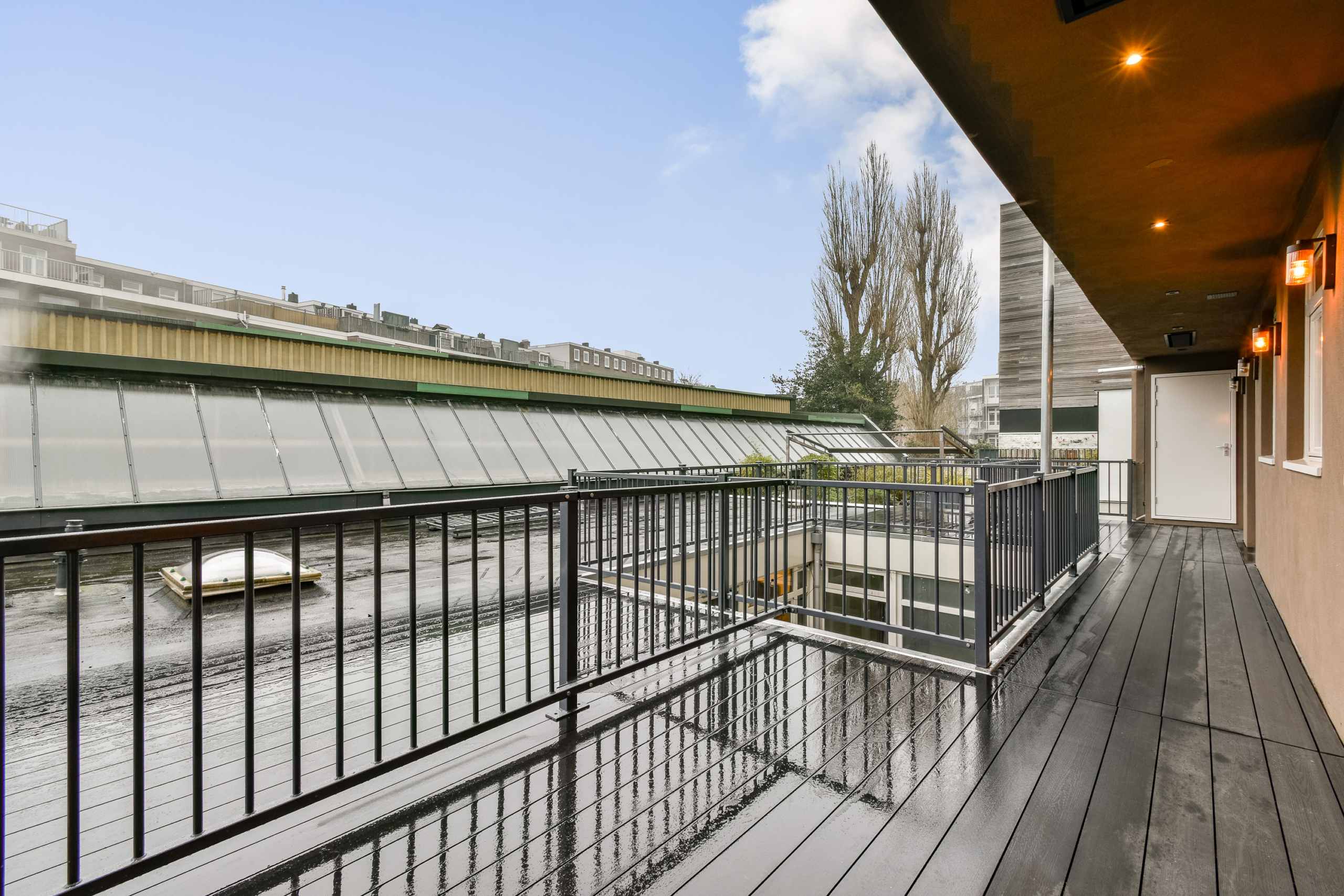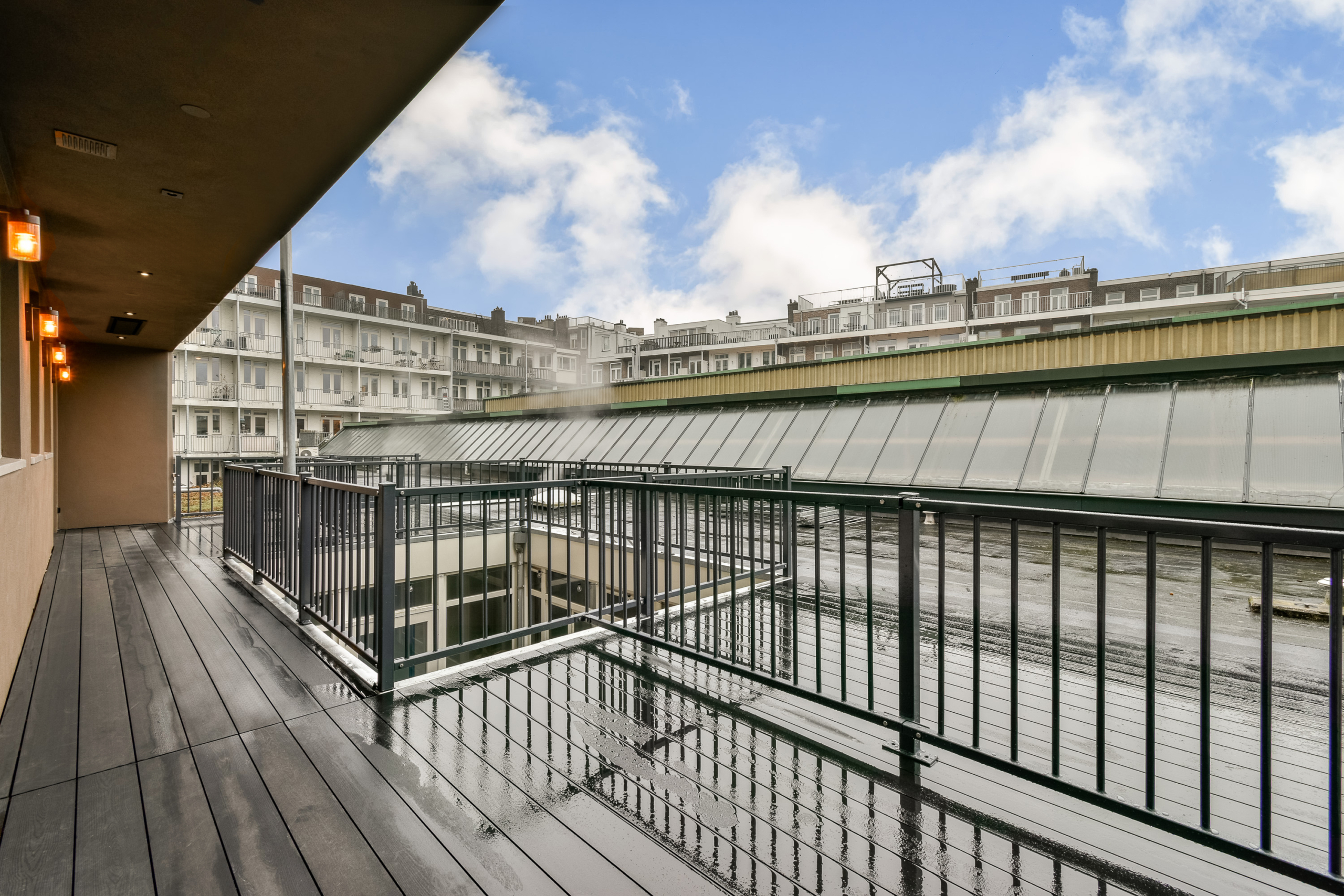 Aan de achterzijde bevindt zich het absolute pronkstuk van de woning: een riant privé dakterras over de volledige breedte van het appartement. Een buitenruimte van dit formaat is in De Pijp uitzonderlijk en biedt volop ruimte voor een royale loungeset, eettafel en groen.