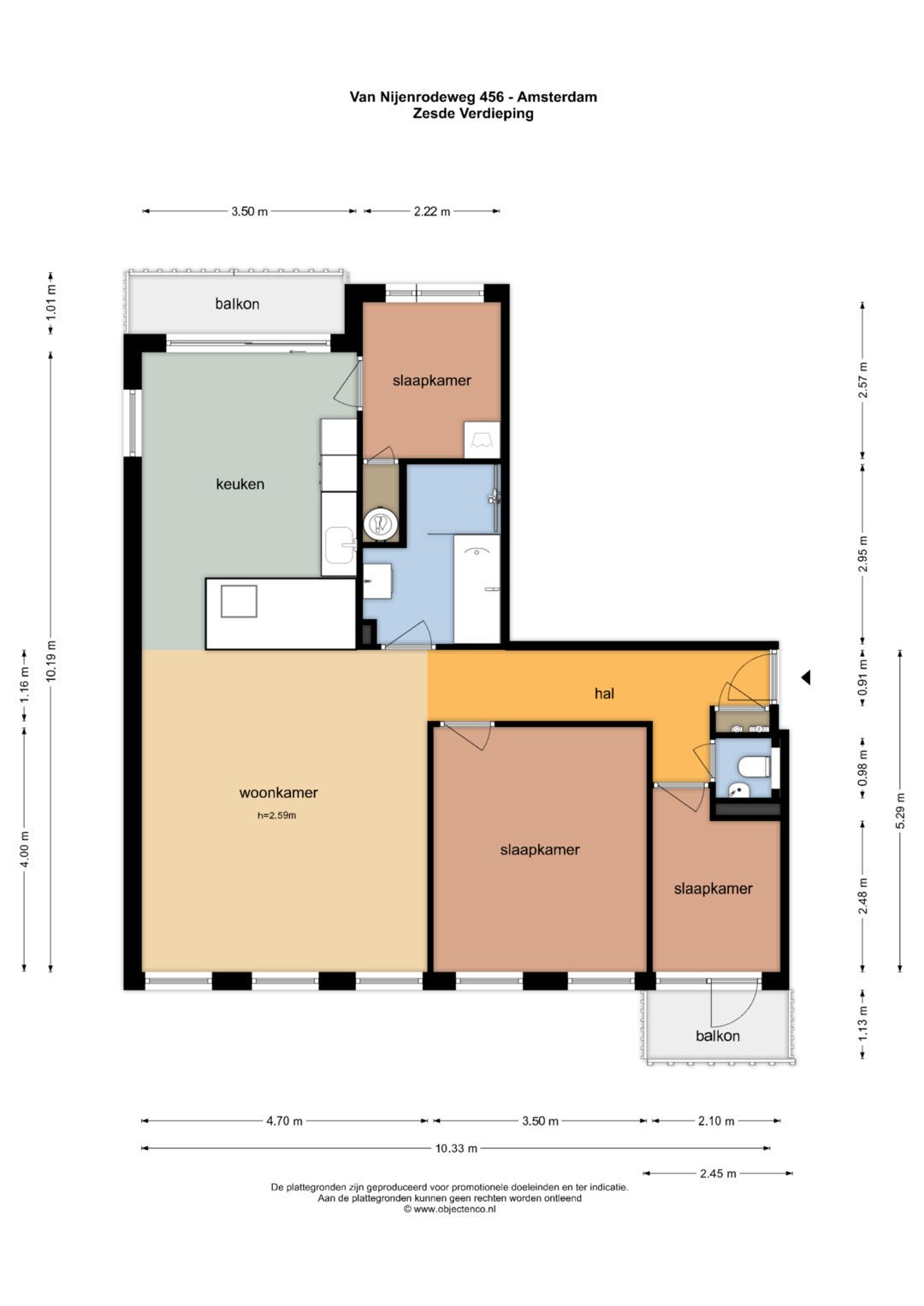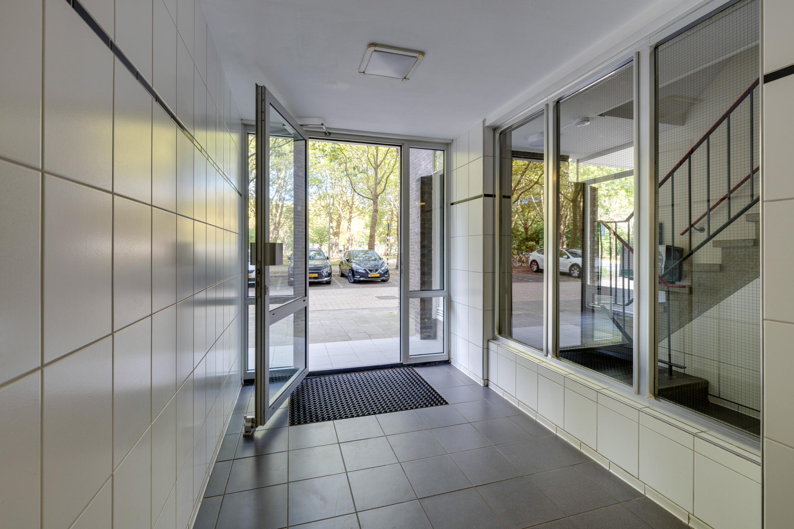 Op de begane grond bevindt zich de gemeenschappelijk entree met bellenbord en de brievenbussen. Met de lift (of voor sportievelingen, met de trap) bereik je de voordeur van Van Nijenrodeweg 456 op de zesde etage.