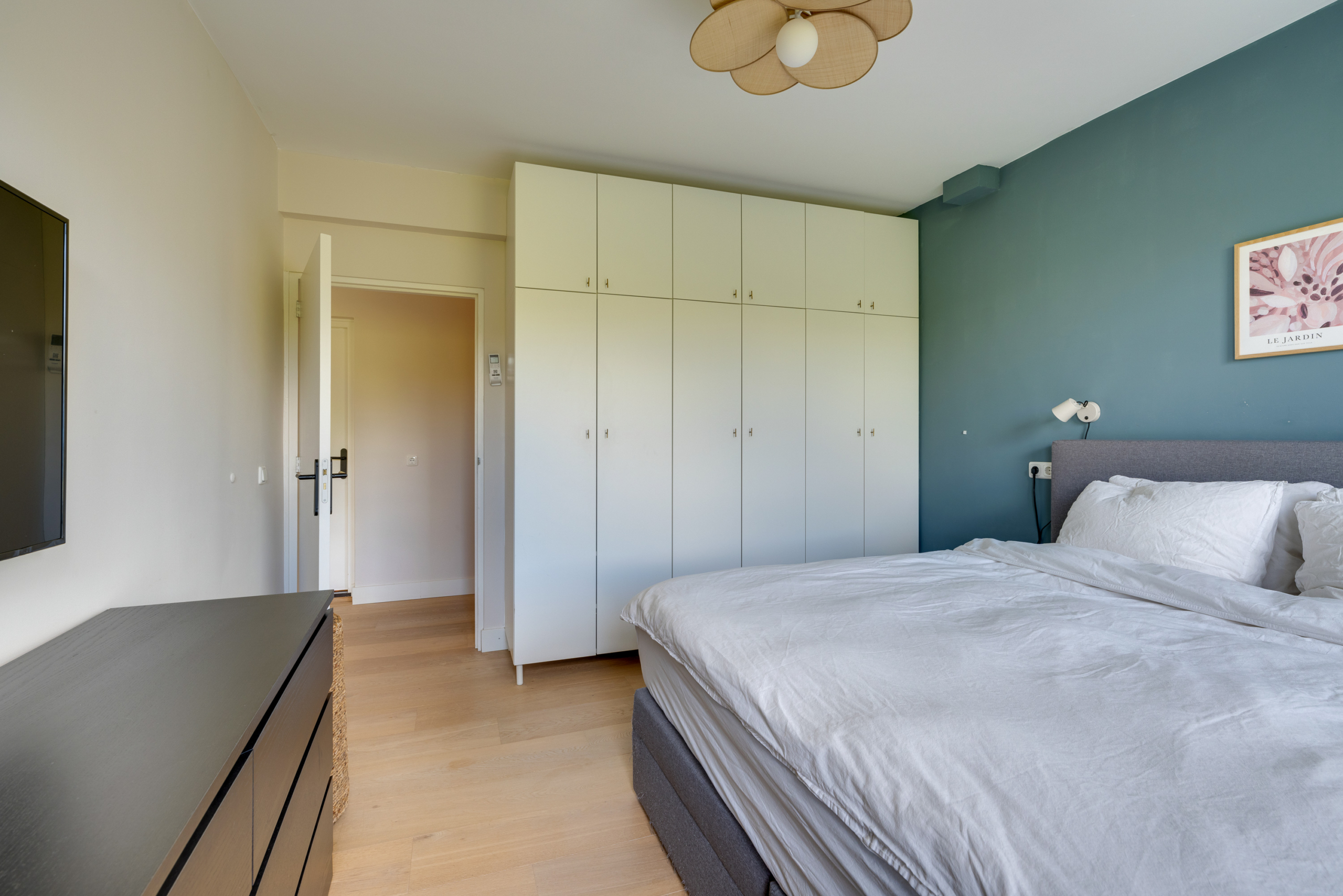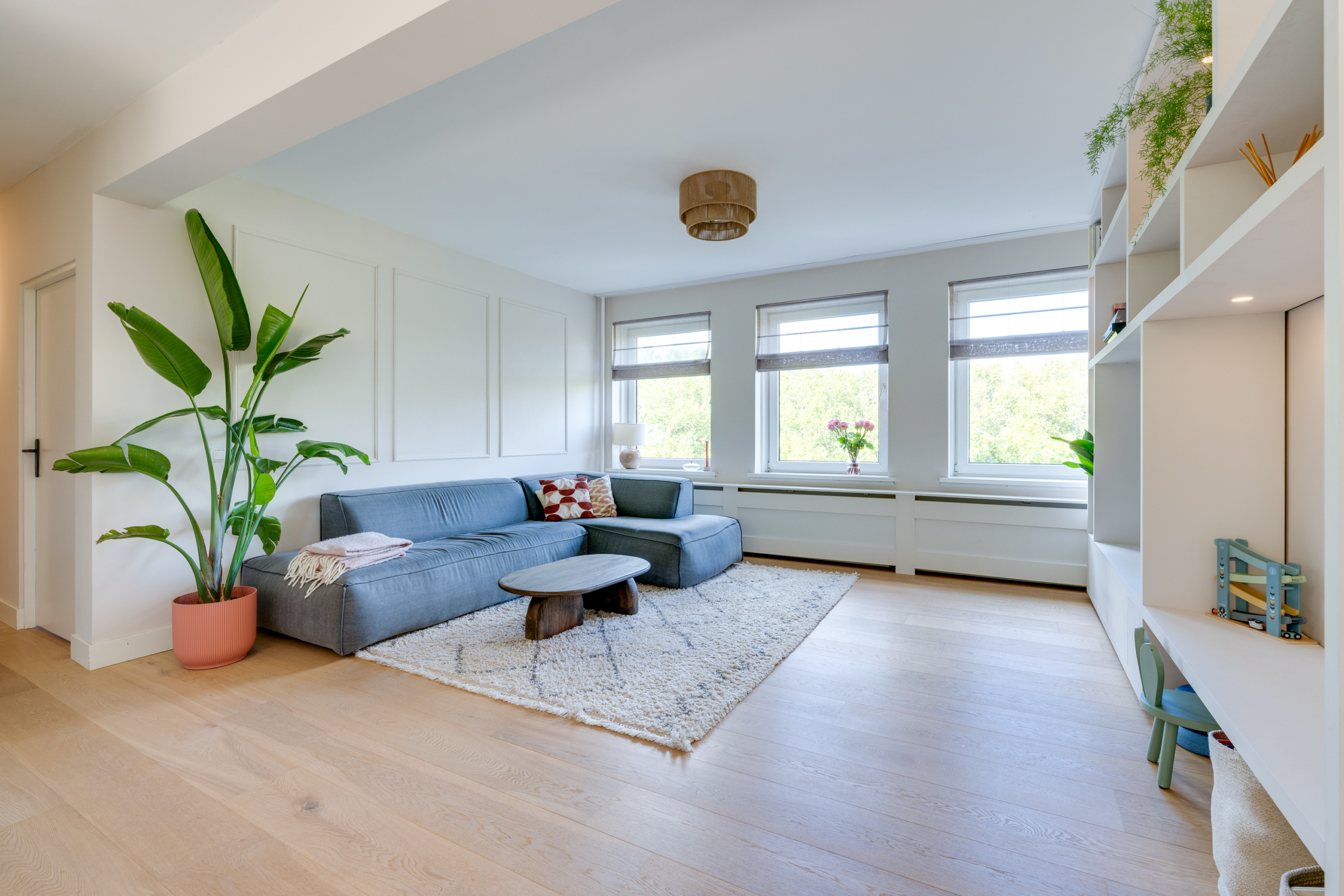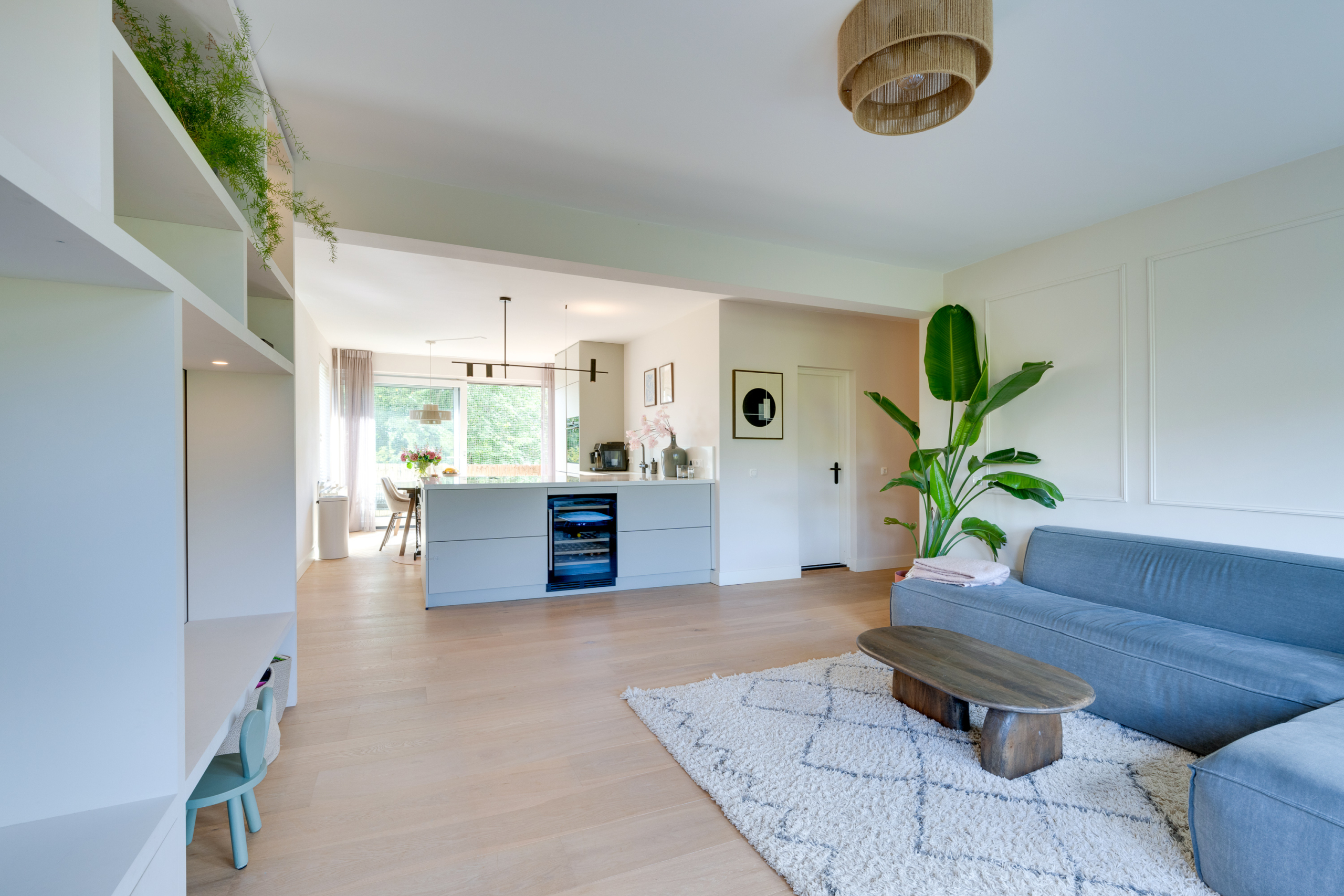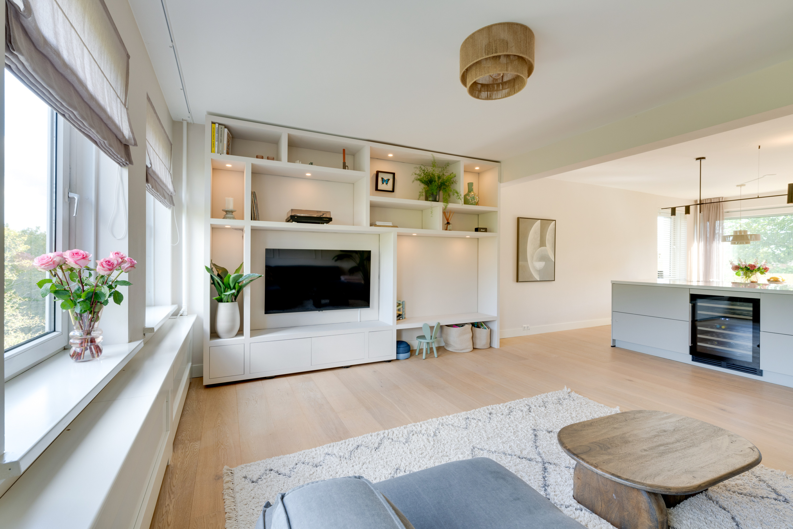 Naast ruimte voor een fijne zithoek, vind je een maatwerk wandkast en een moderne