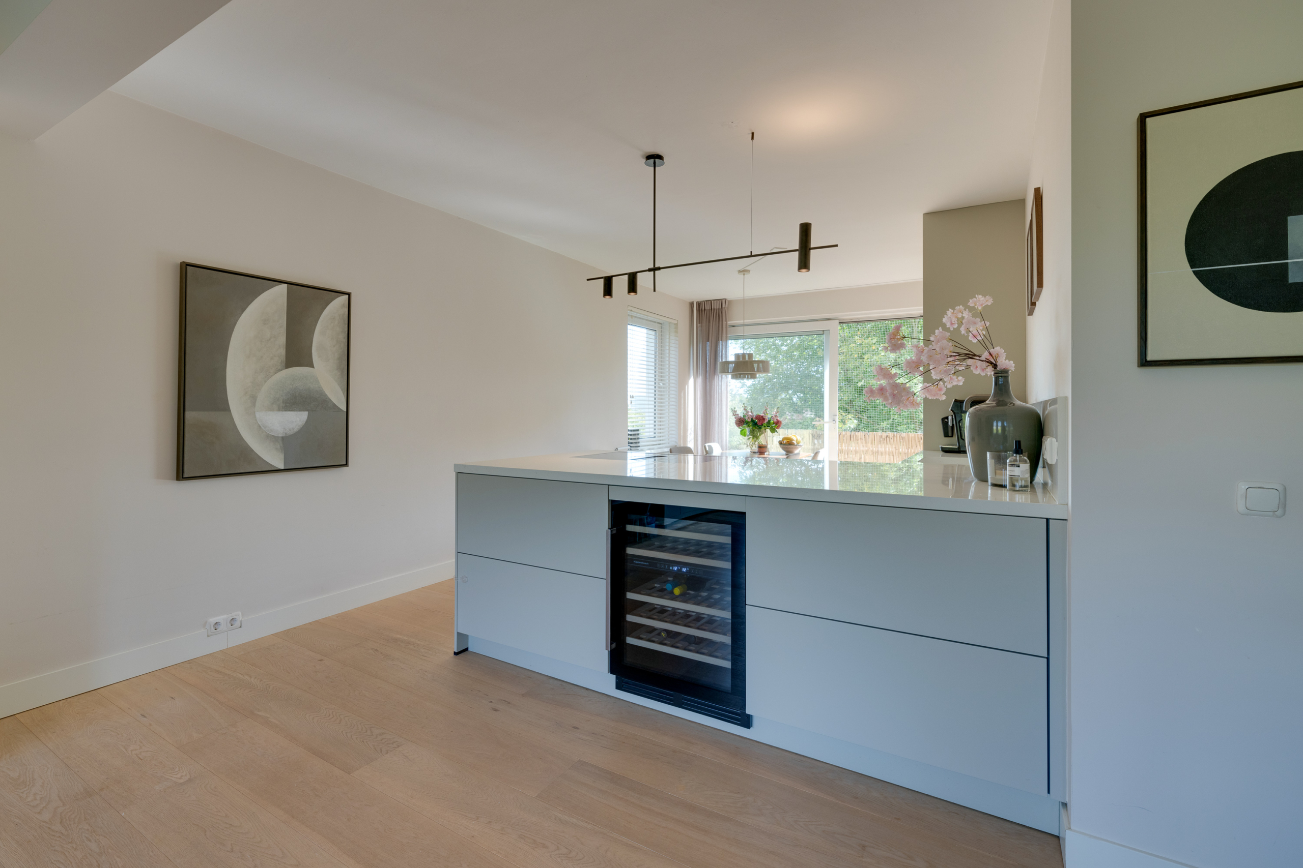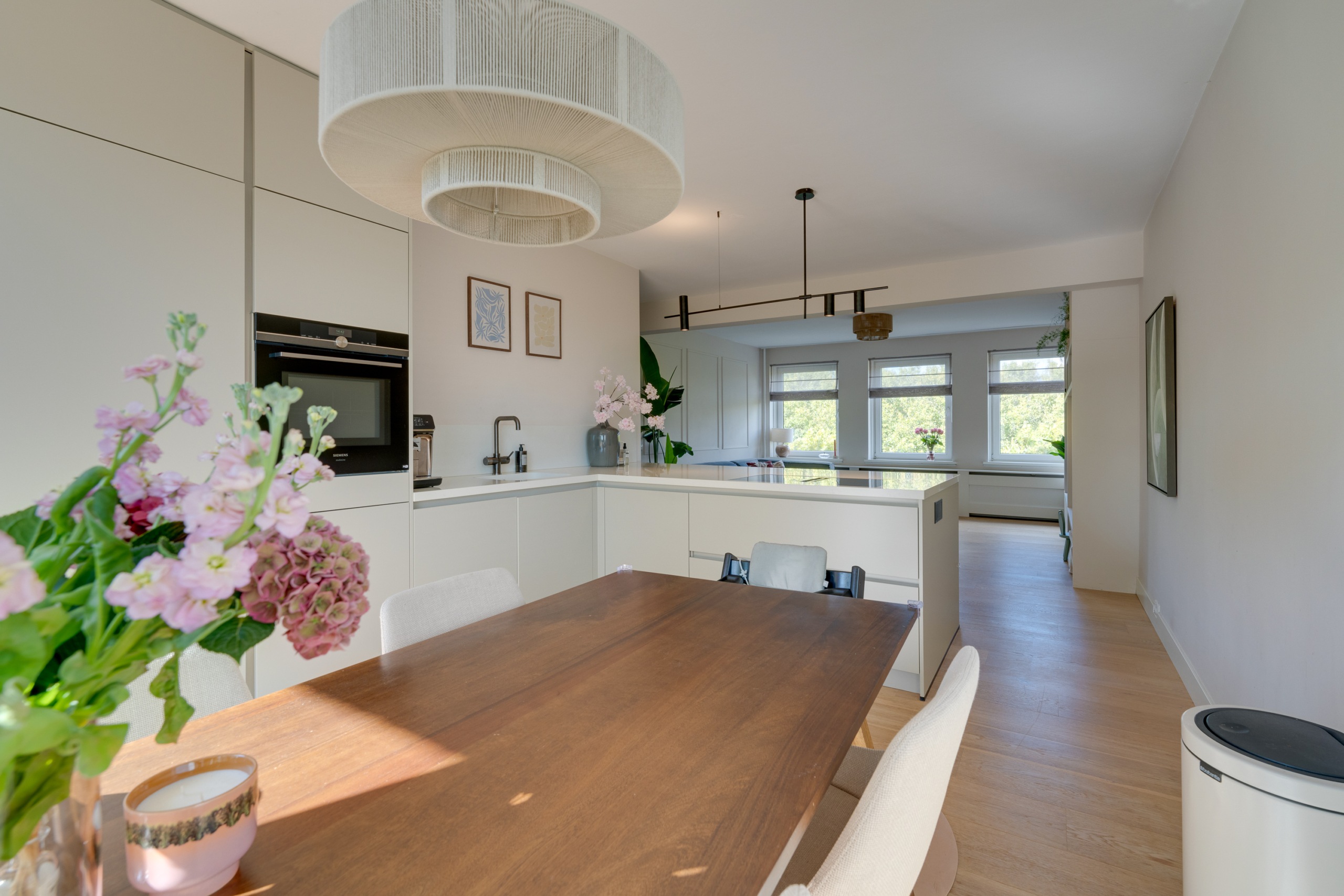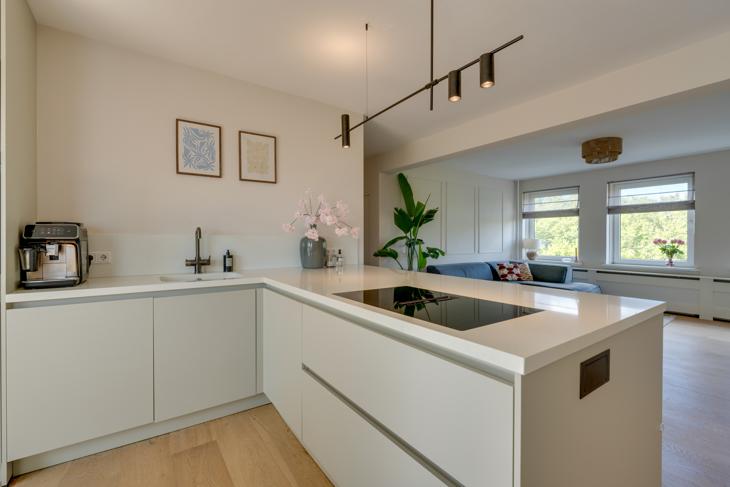 The spacious and bright living room is the heart of this apartment. In addition to space for a cosy sitting area, you will find a custom-made wall cabinet and a modern L-shaped kitchen (2021) with various built-in appliances, including a wide induction hob with worktop extractor, a Quooker and a wine refrigerator.