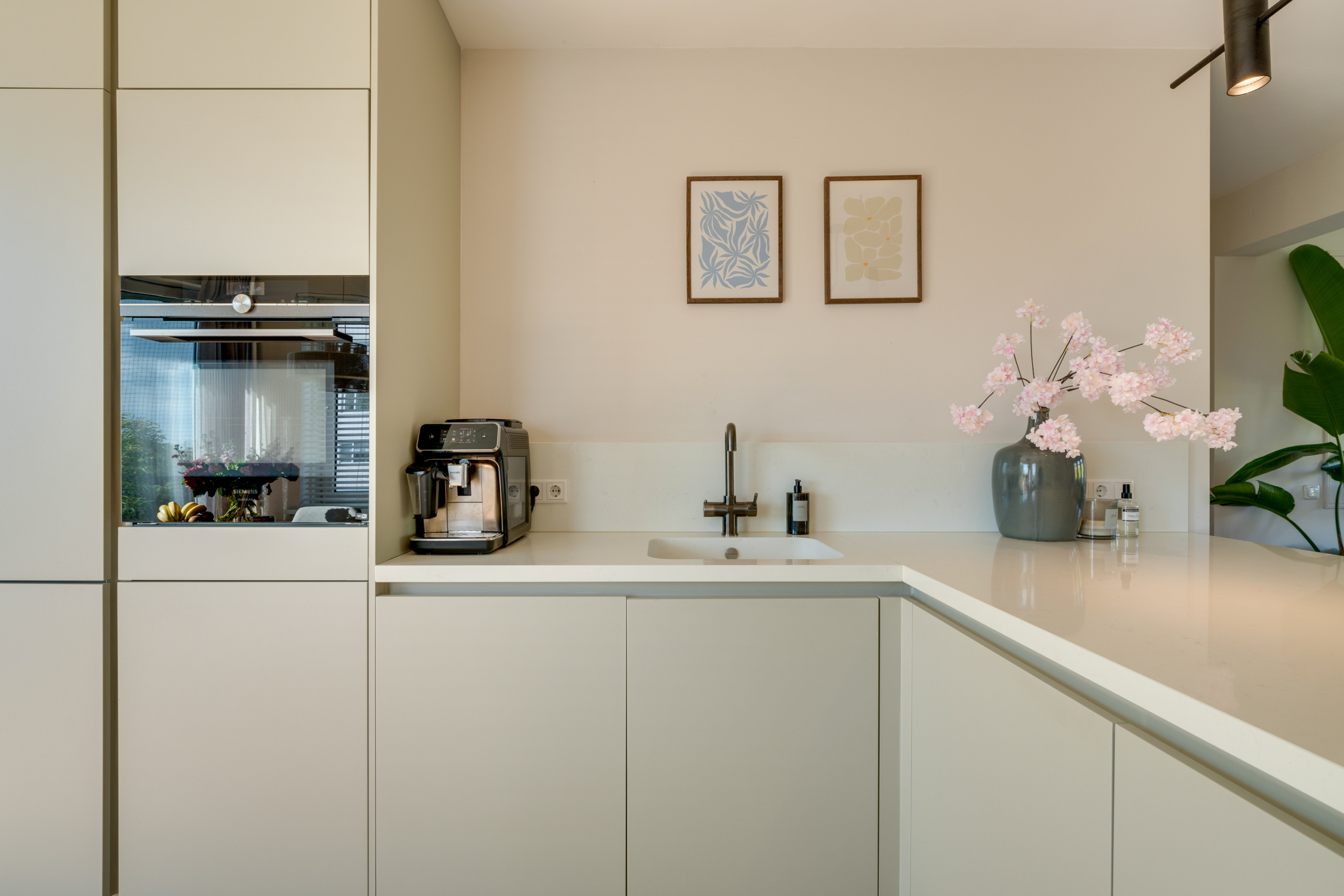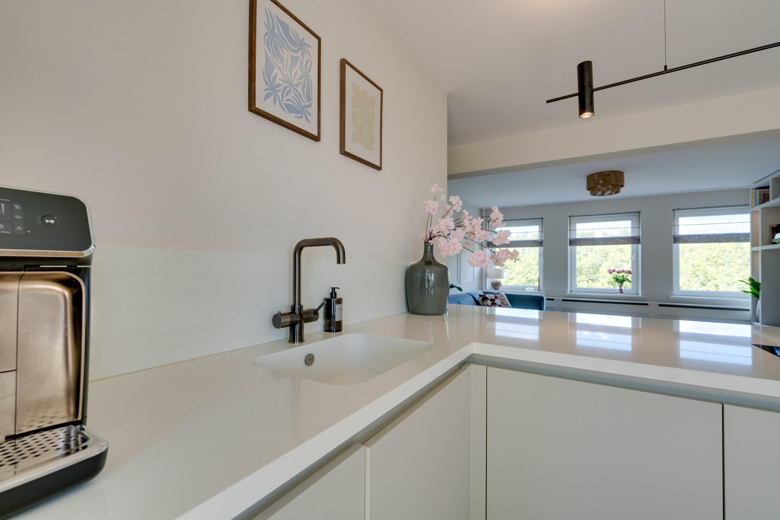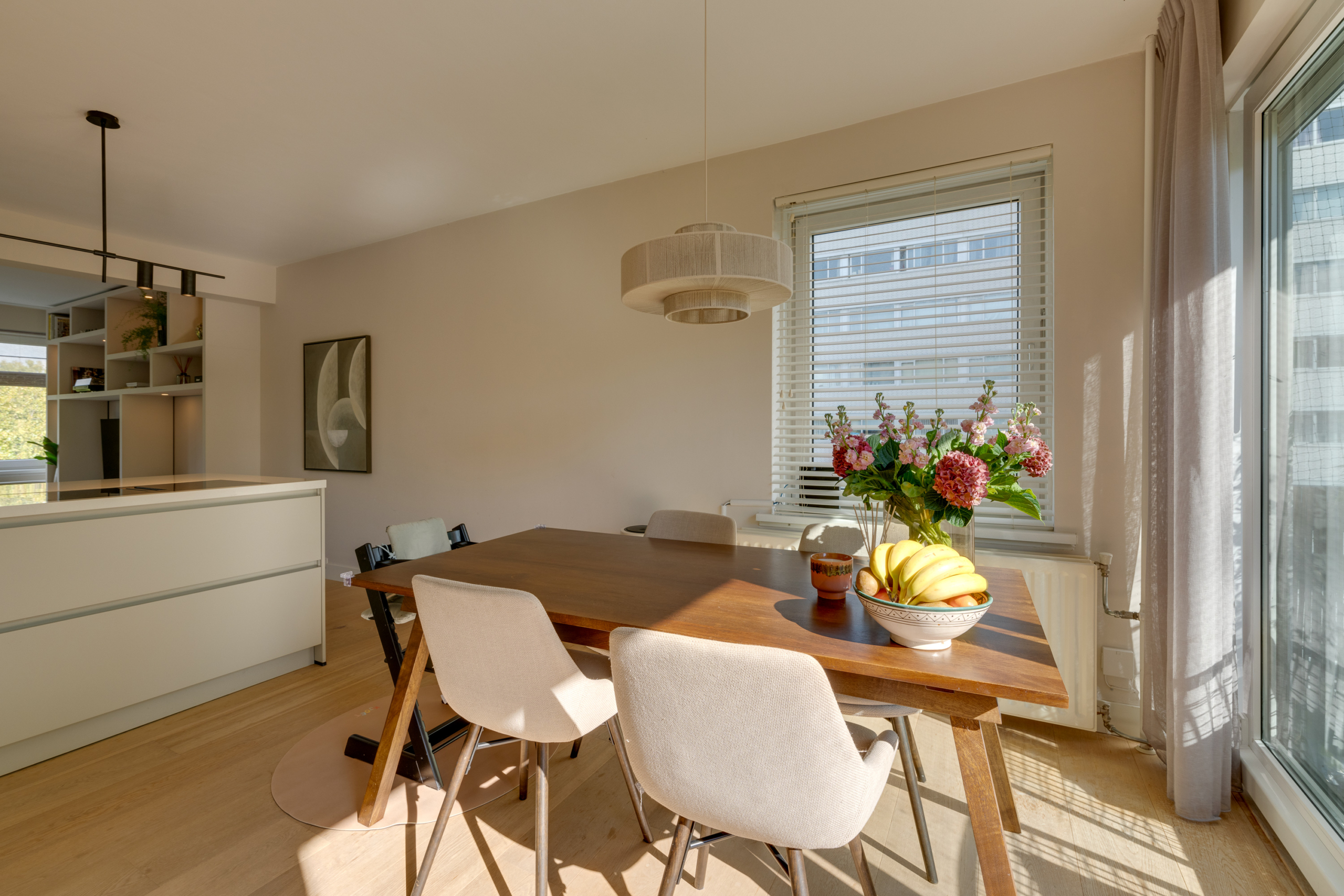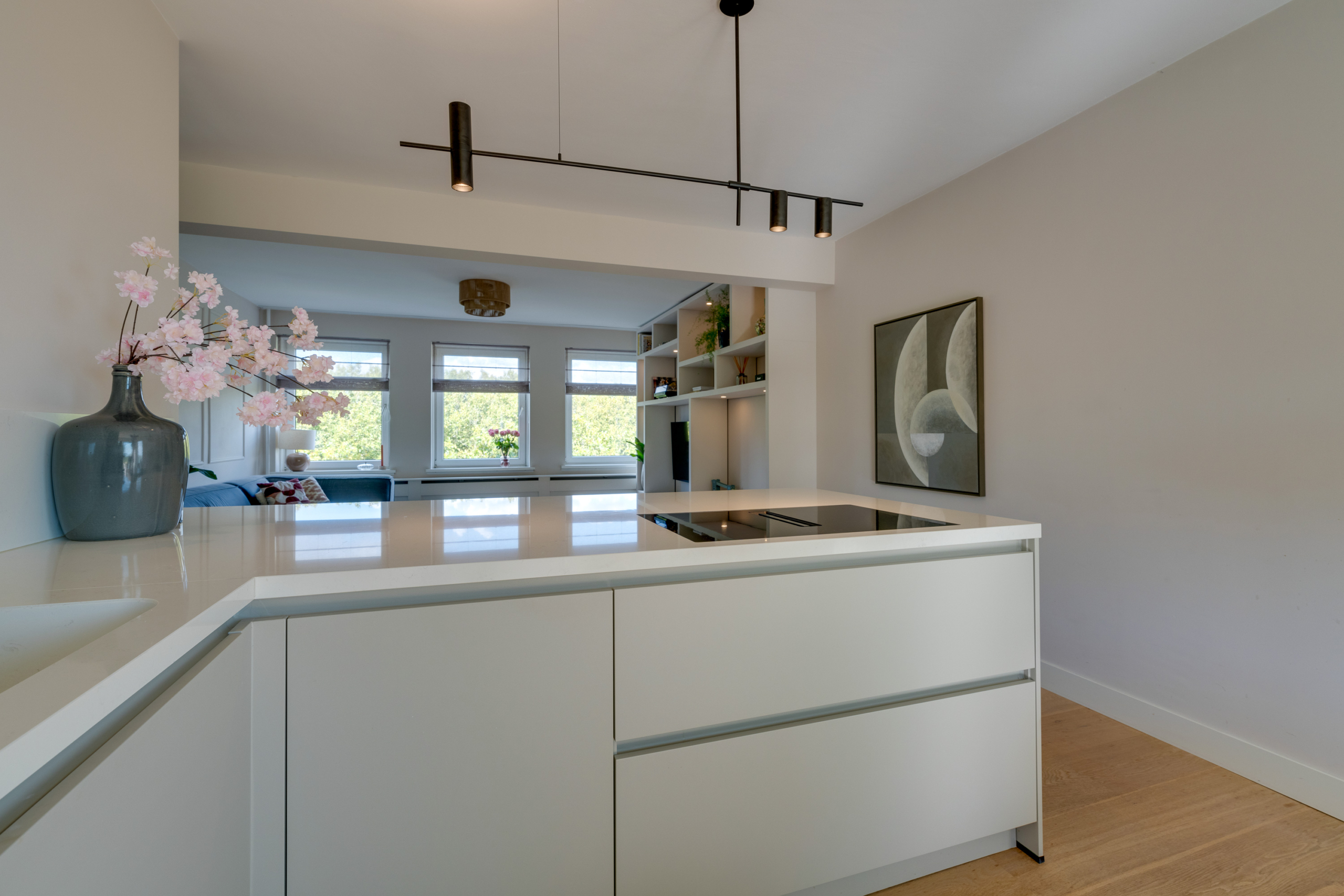 The spacious and bright living room is the heart of this apartment. In addition to space for a cosy sitting area, you will find a custom-made wall cabinet and a modern L-shaped kitchen (2021) with various built-in appliances, including a wide induction hob with worktop extractor, a Quooker and a wine refrigerator.