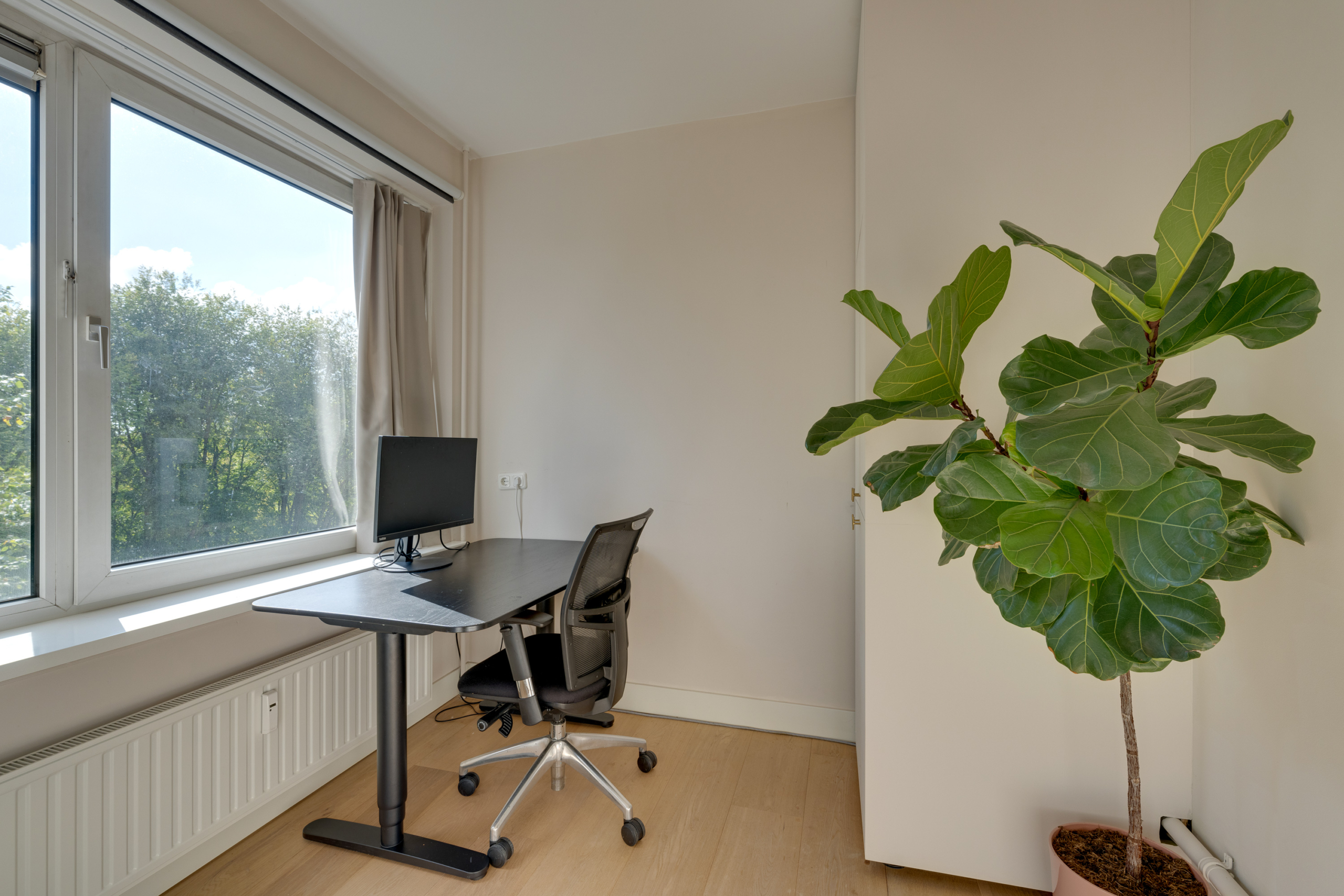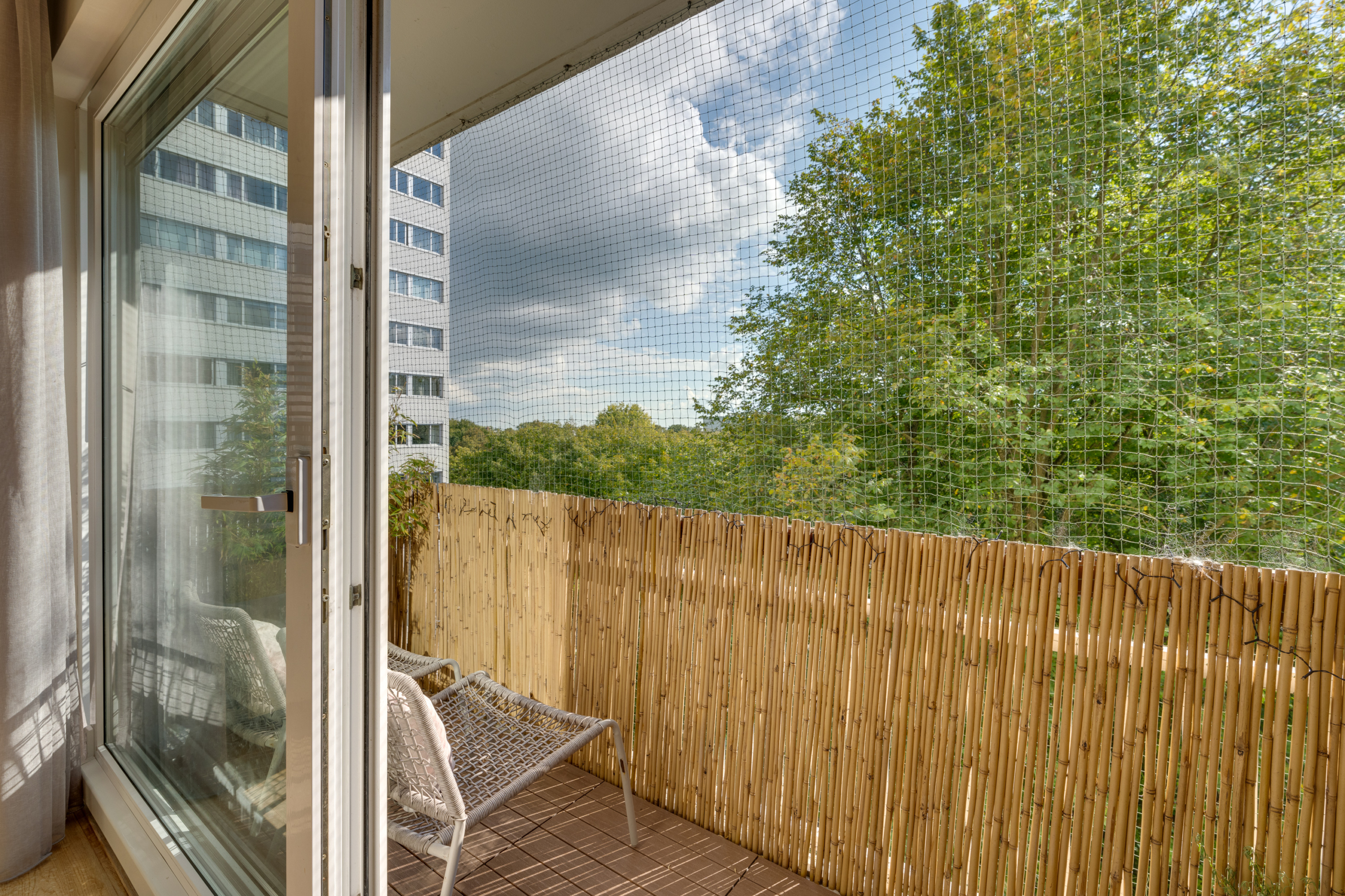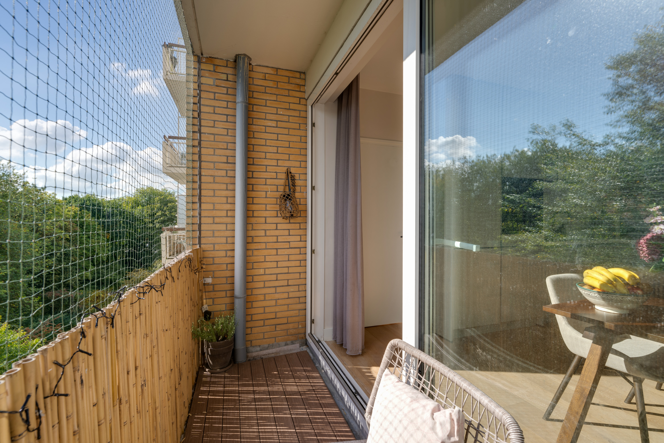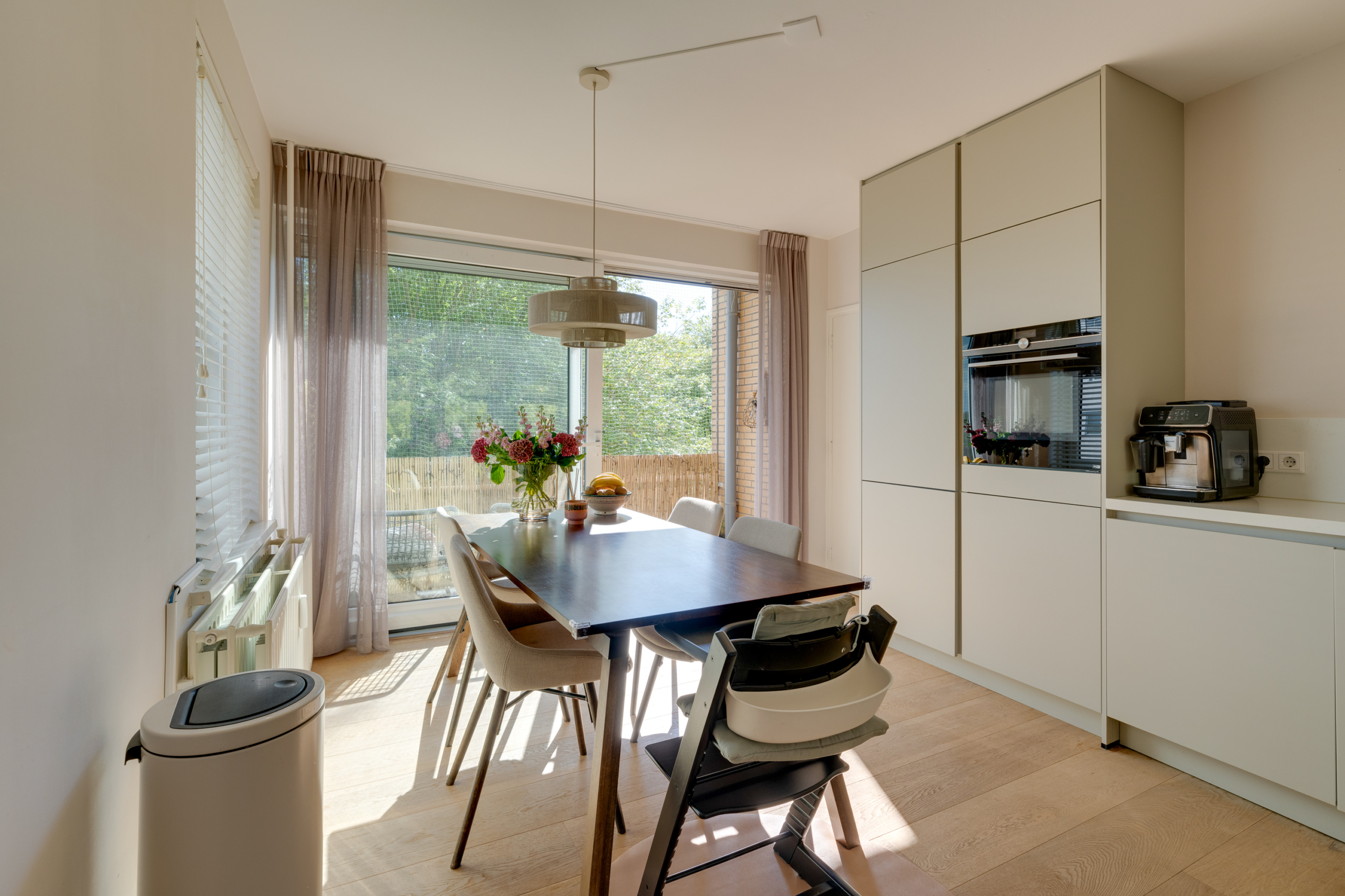 Tevens is er voldoende plaats voor een royale eettafel en geeft de schuifpui toegang tot het tweede balkon (Z); een heerlijke zonnige plek met vrij uitzicht óver de boomtoppen. Een écht feestje om hier te genieten van een kop koffie/thee of een laat middagdrankje!