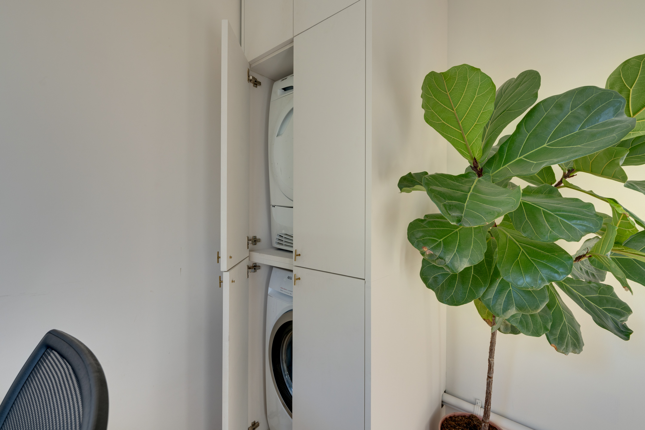 A built-in cupboard houses the electric boiler, while the washing machine and dryer are neatly concealed in a custom-made cupboard.