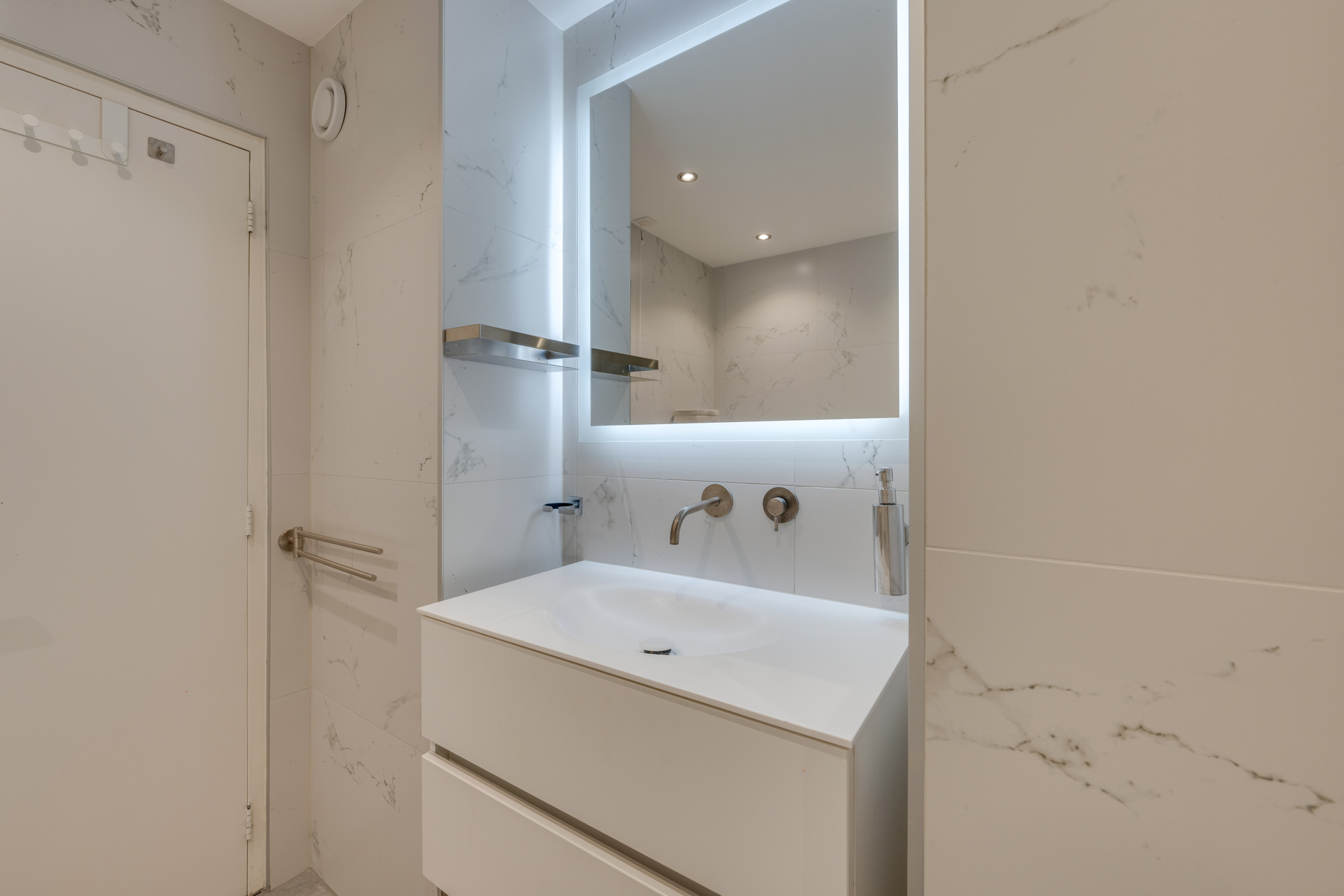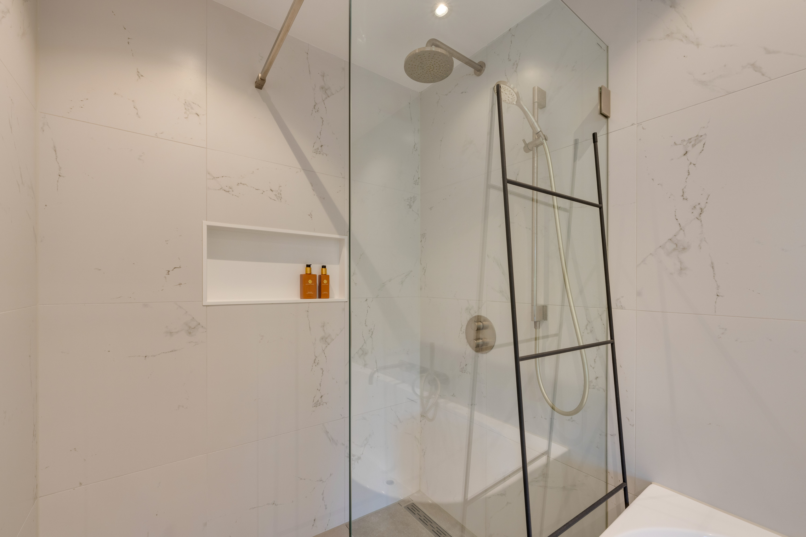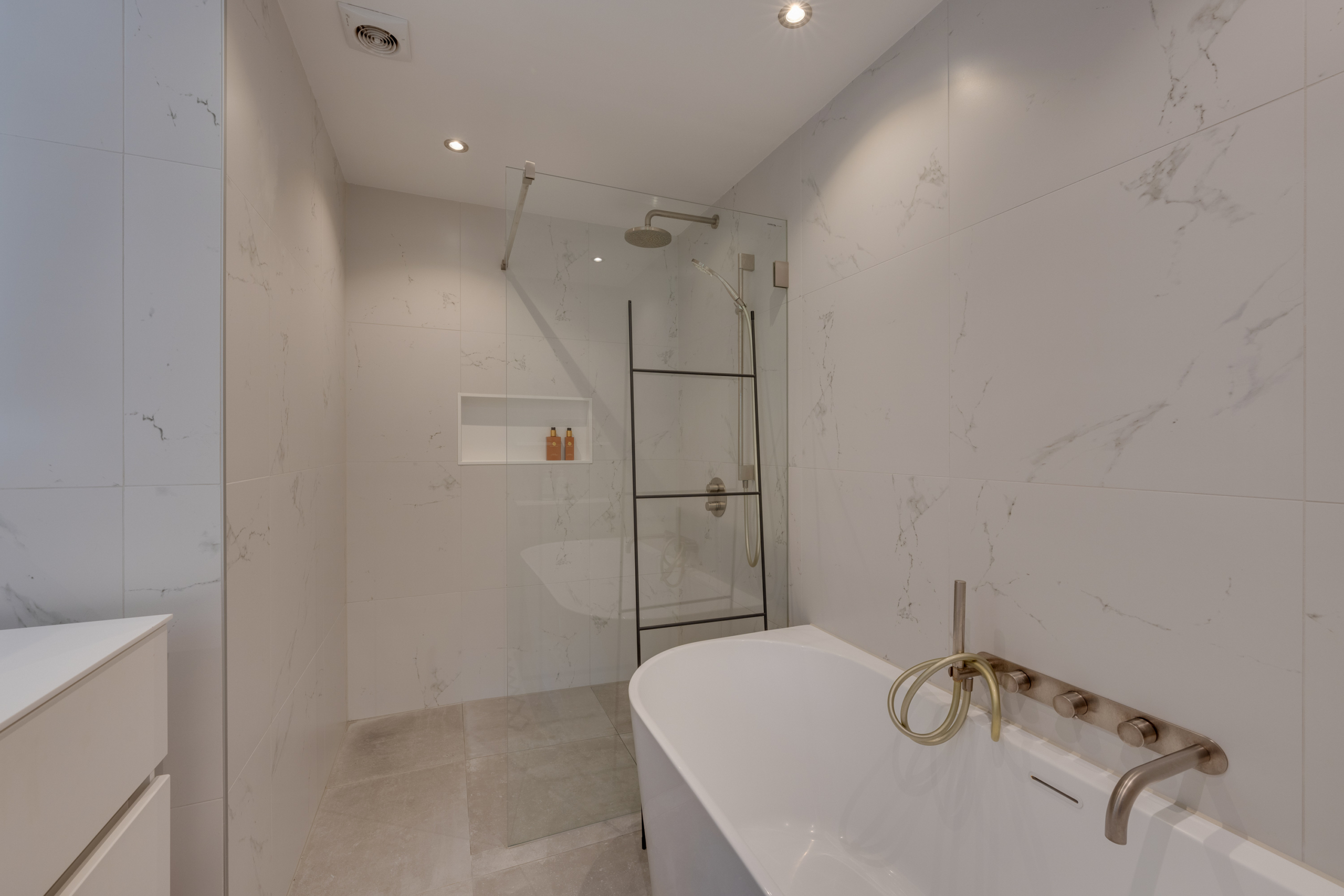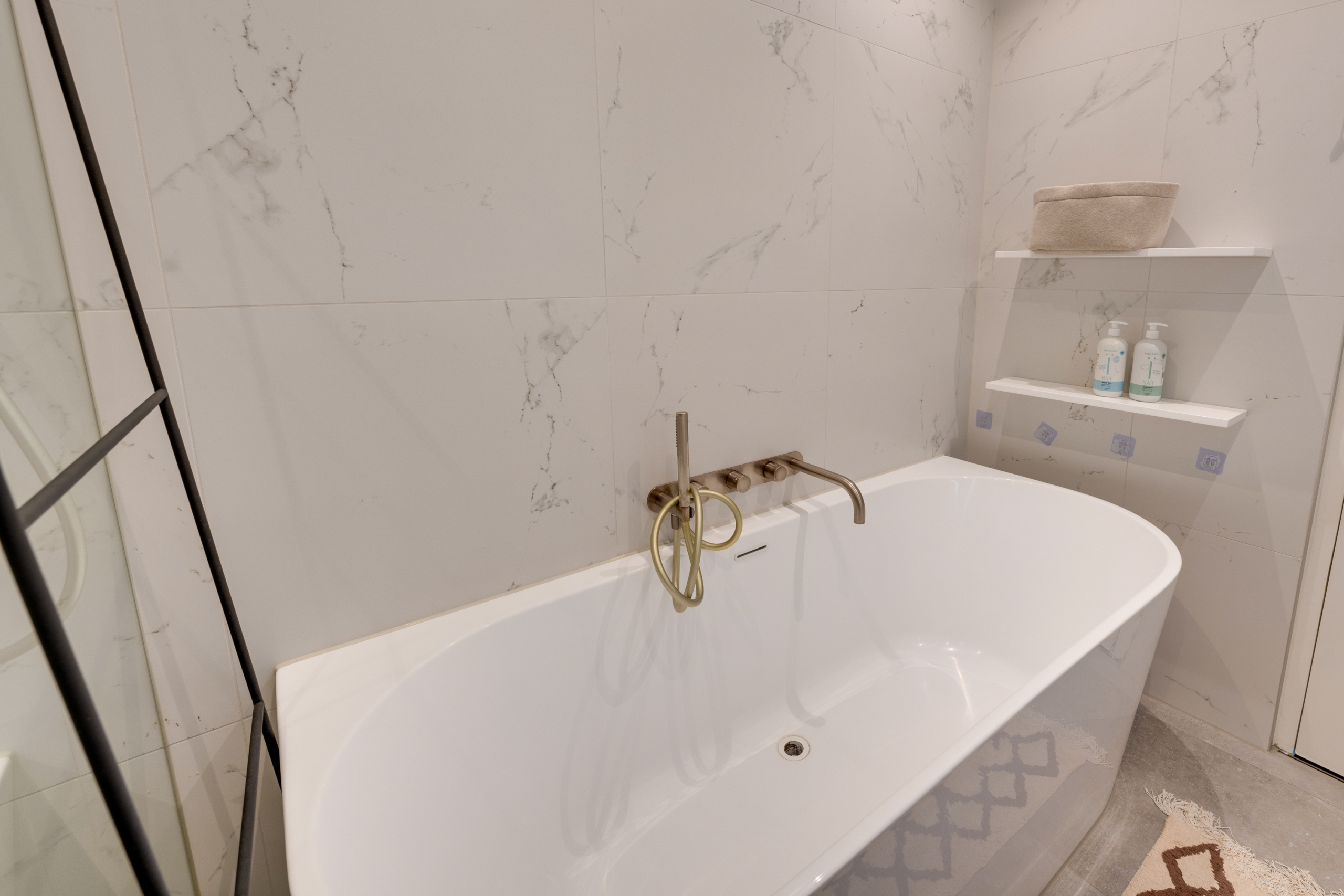 De moderne badkamer, tegenover de masterbedroom gelegen, biedt een comfortabel ligbad, een afzonderlijke inloopdouche en een extra breed wastafelmeubel. De vloer is voorzien van comfortabele vloerverwarming. De badkamer werd vernieuwd in 2021.