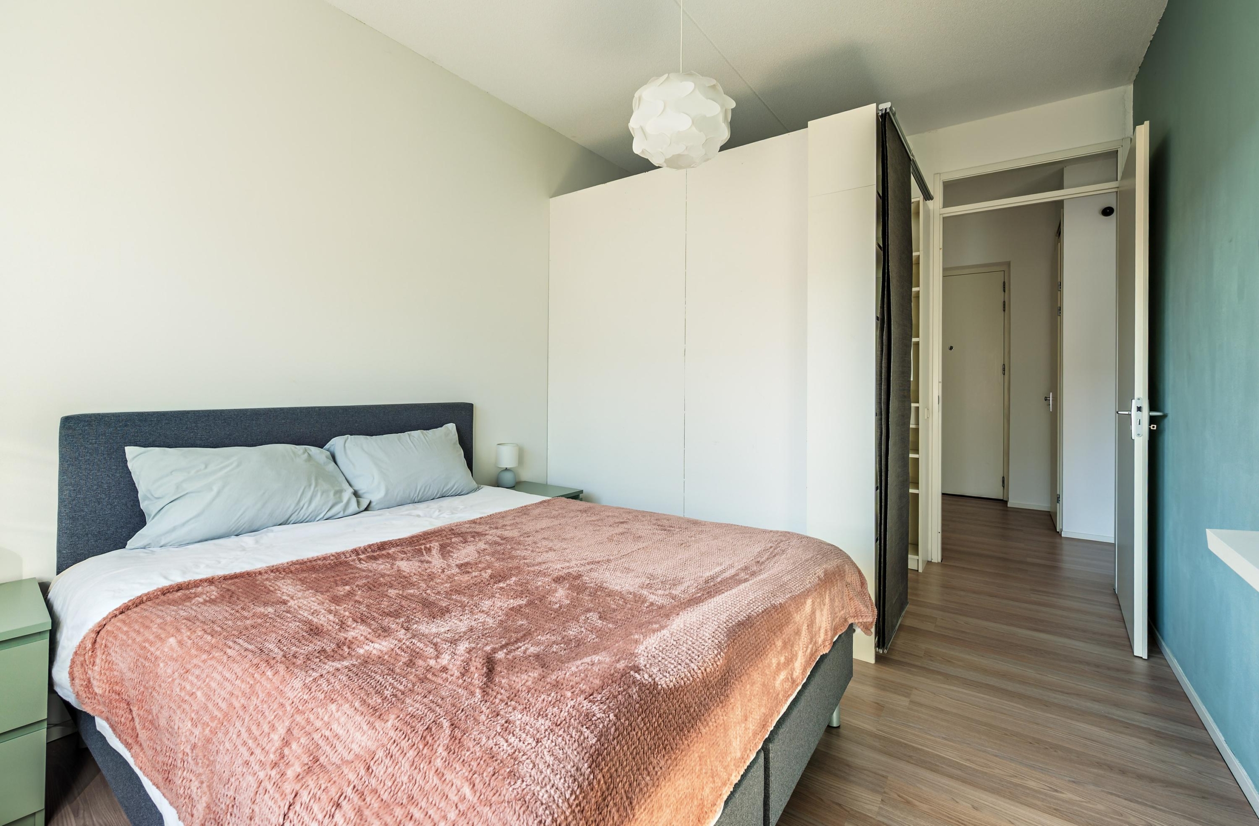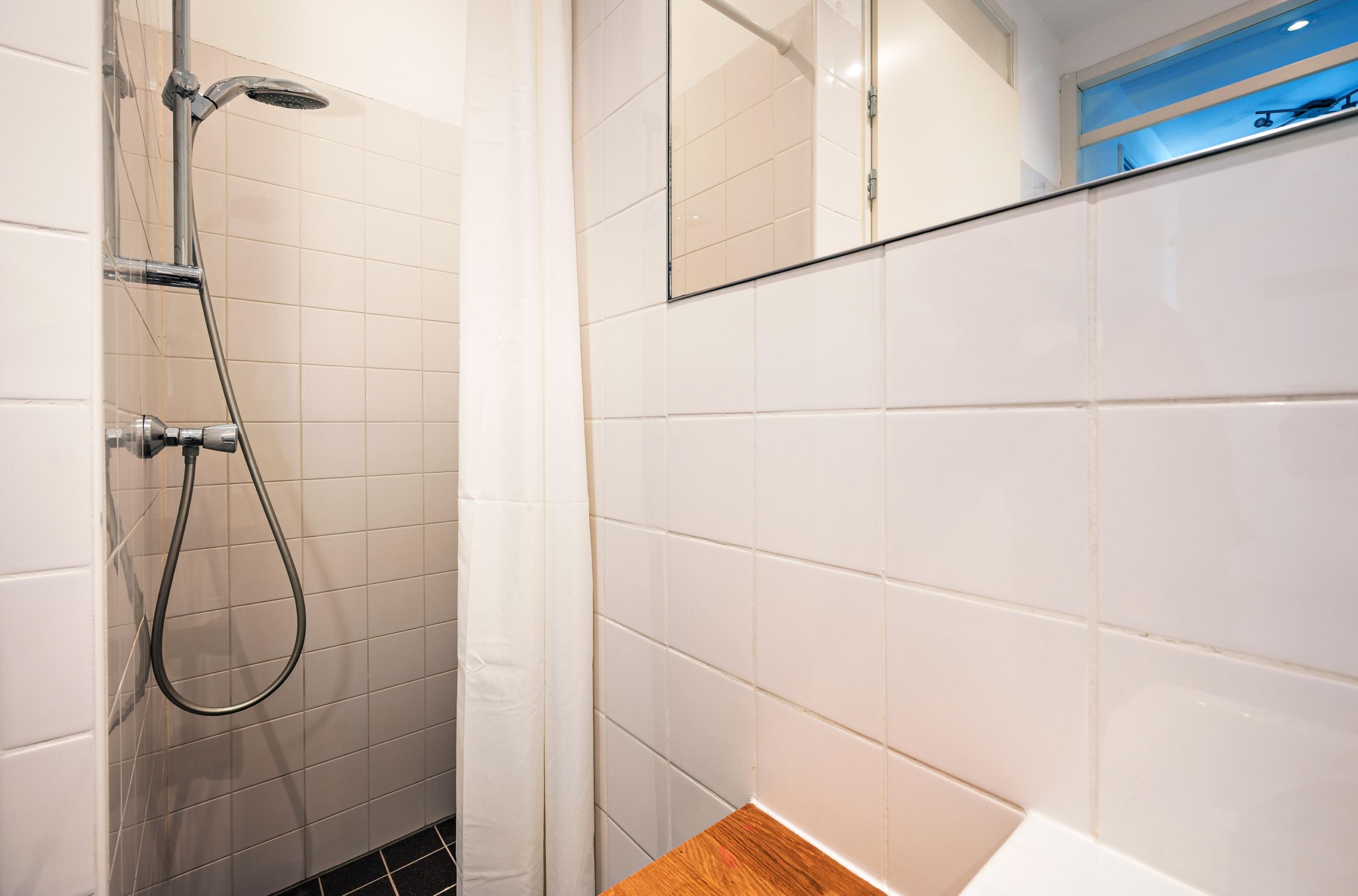 The generous bedroom features a comfortable walk-in closet and an extra television. The modern bathroom includes a sink, shower, and a separate area for the washing machine and dryer. There is also a separate toilet and a very practical additional storage space — ideal for coats, an extra fridge, etc.