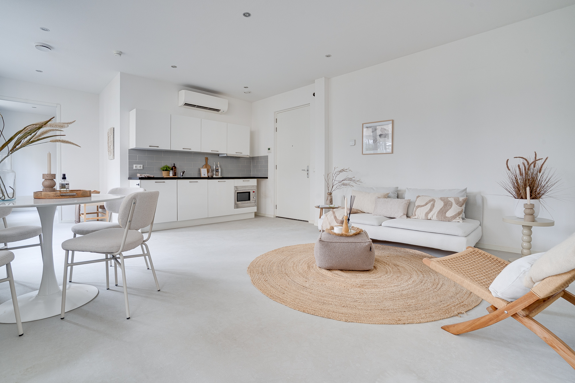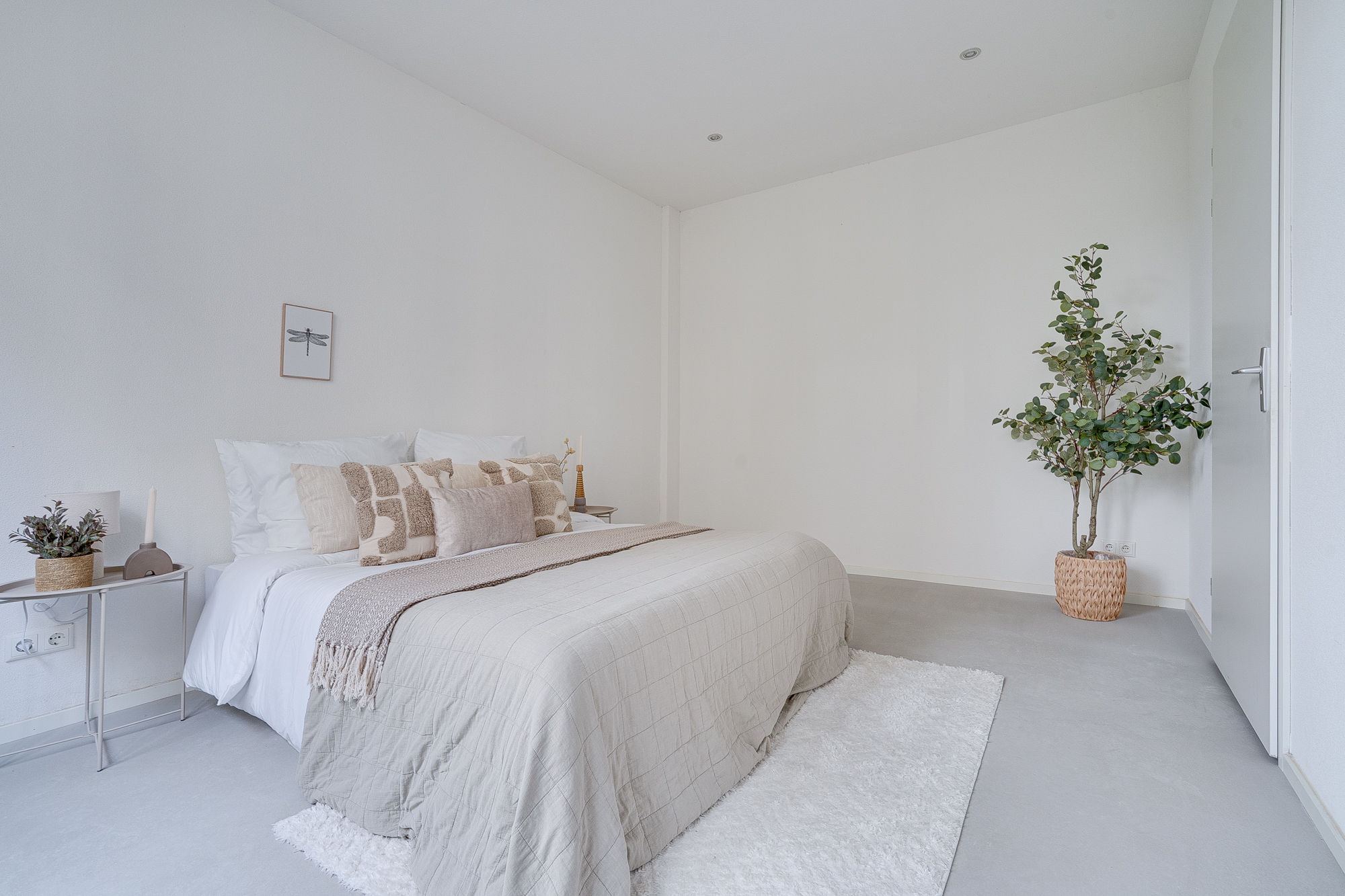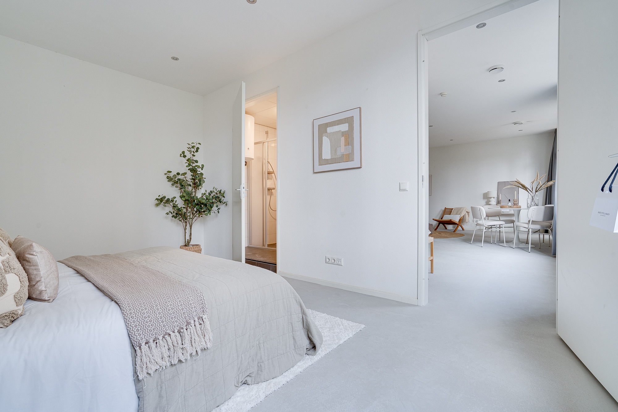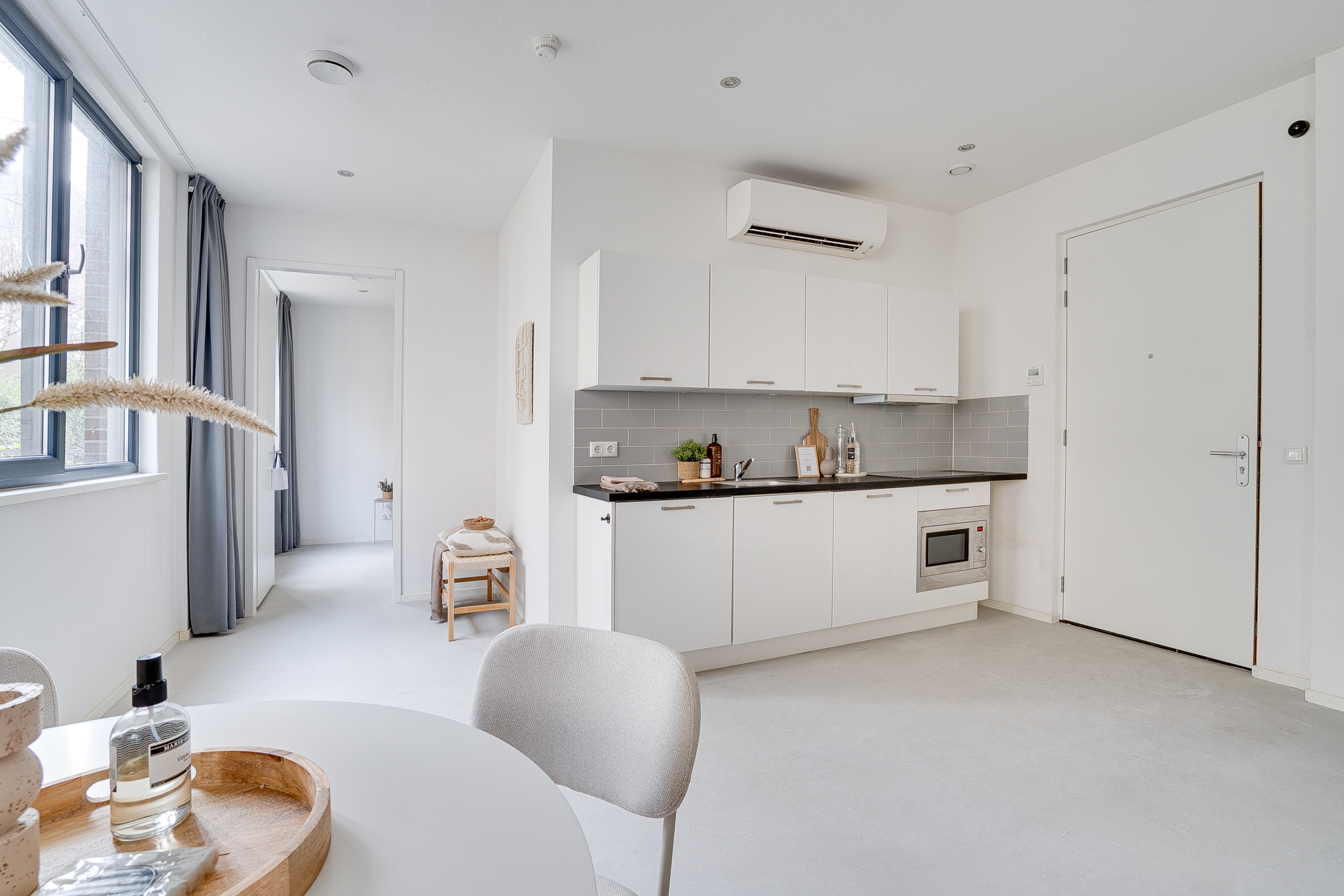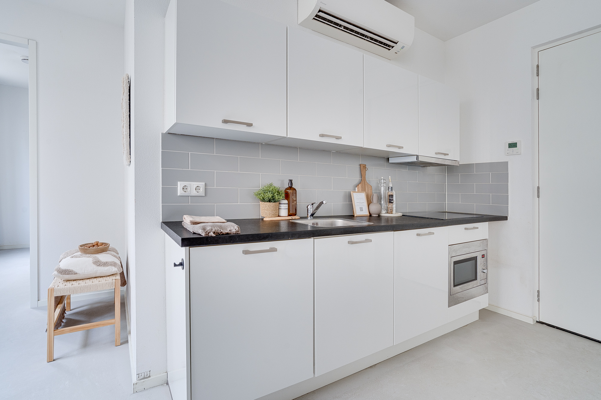 Het appartement is vrijwel over de gehele breedte voorzien van grote raampartijen. Het beschikt over een nette badkamer, open keuken met woongedeelte, 1 slaapkamer en een groot terras van 26 vierkante meter op het oosten. De keuken is voorzien van een inductiekookplaat, koelkast, combi-oven en vaatwasser. De gehele woning is afgewerkt met spuitwerk wandafwerking en ingebouwde, dimbare spots. De vloeren zijn recent geëgaliseerd waardoor je direct een vloerafwerking naar smaak kan aanbrengen. De moderne badkamer is volledig betegeld en beschikt over een douche, wastafelmeubel, hangend toilet en een elektrische boiler. Hier is ook de aansluiting voor wasapparatuur aanwezig.