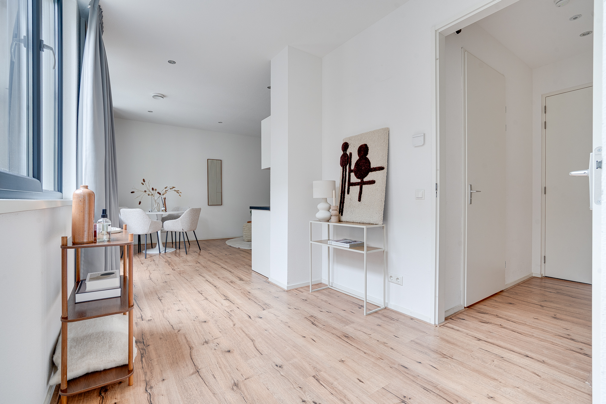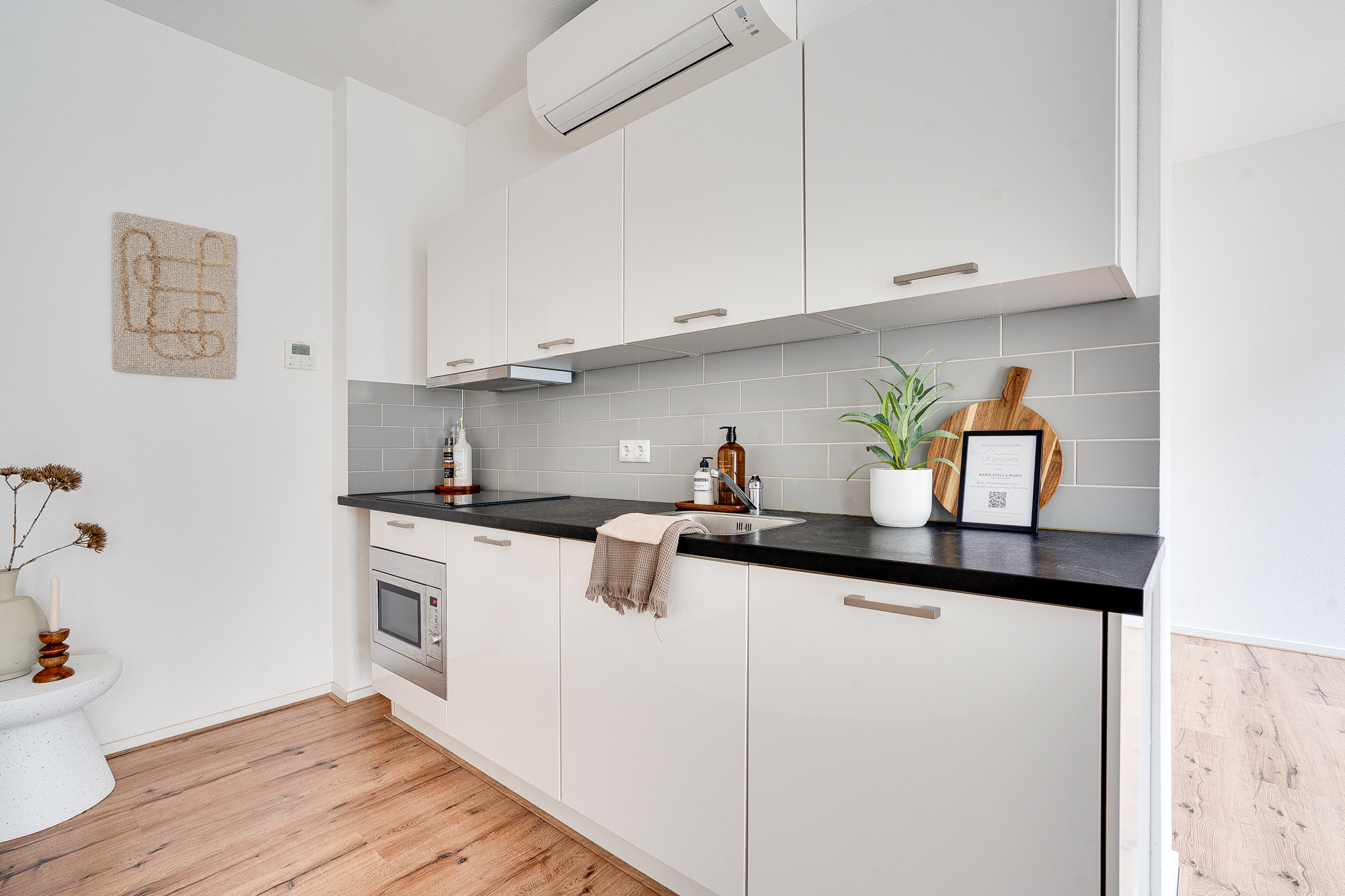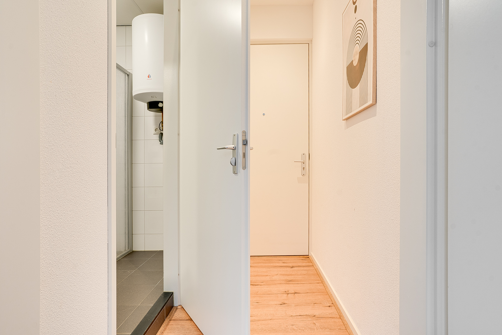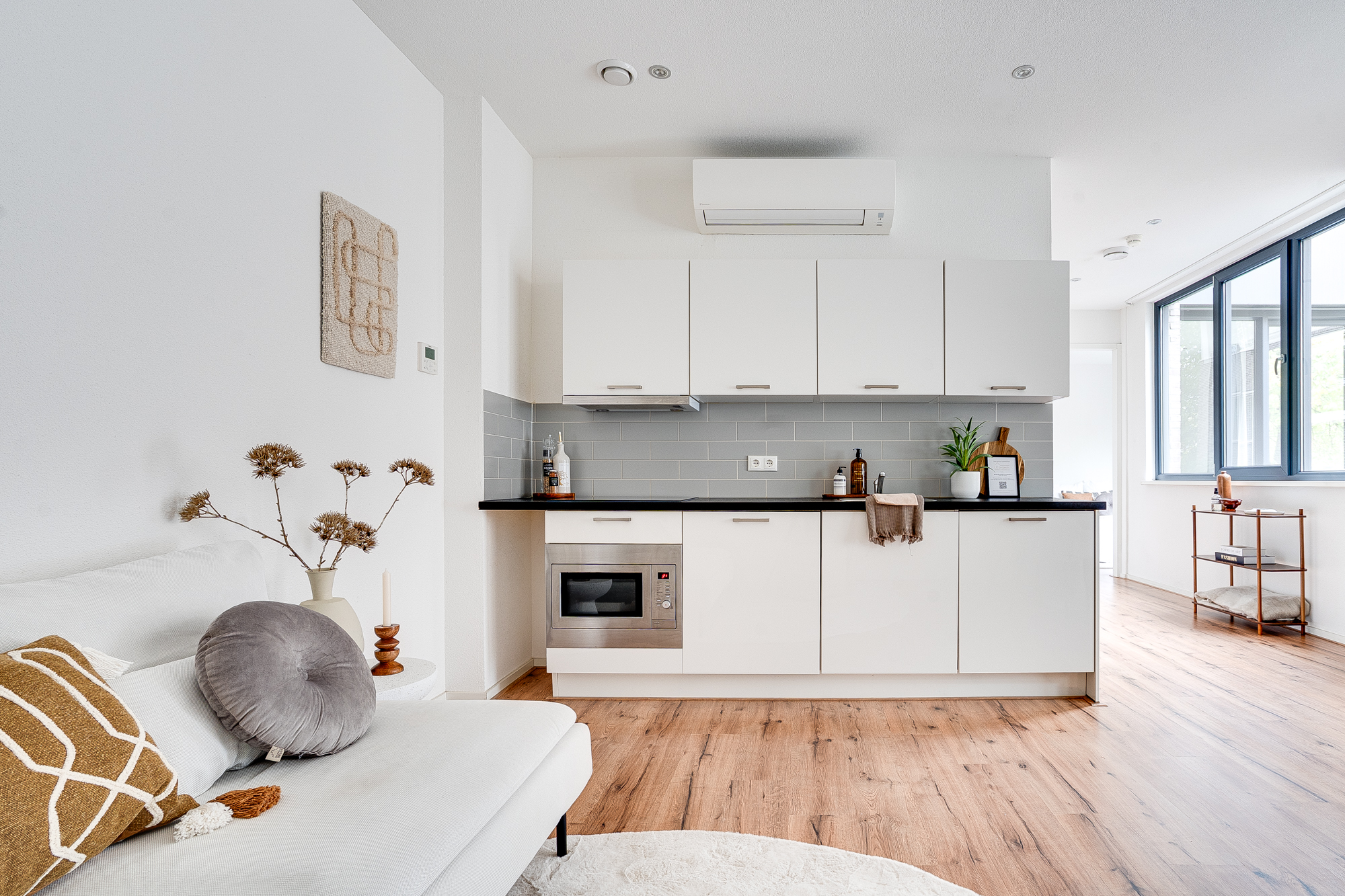 Het appartement is vrijwel over de gehele breedte voorzien van grote raampartijen. Het beschikt over een nette badkamer, open keuken met woongedeelte, 1 slaapkamer en een ruim balkon op het oosten. De keuken is voorzien van een inductiekookplaat, koelkast, combi-oven en vaatwasser. De gehele woning is afgewerkt met een nette laminaatvloer, spuitwerk wandafwerking en ingebouwde, dimbare spots. De moderne badkamer is volledig betegeld en beschikt over een douche, wastafelmeubel, hangend toilet en een elektrische boiler. Hier is ook de aansluiting voor wasapparatuur aanwezig.