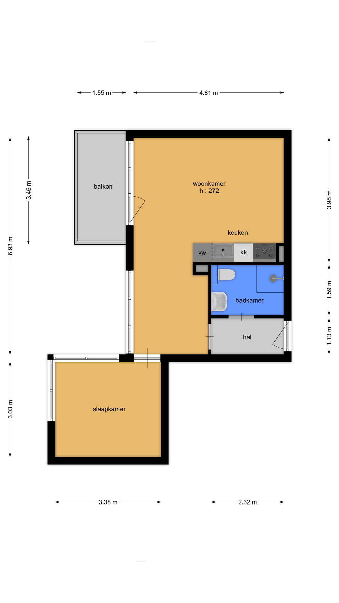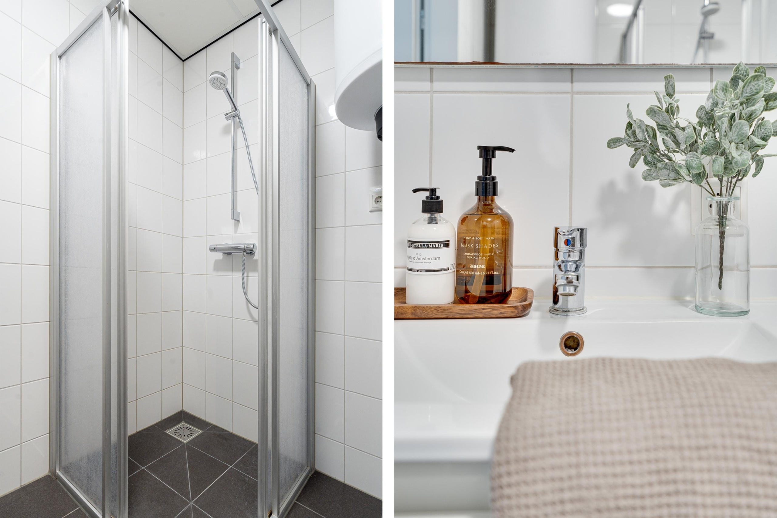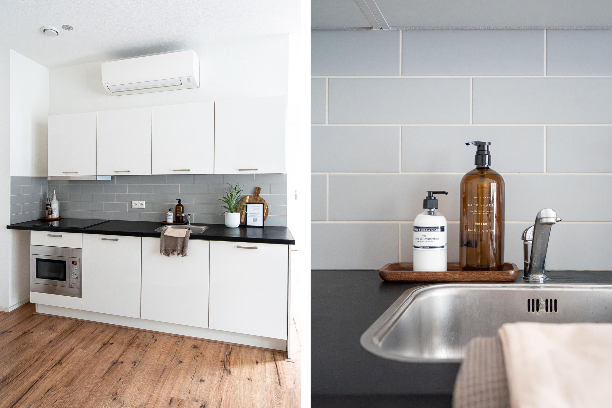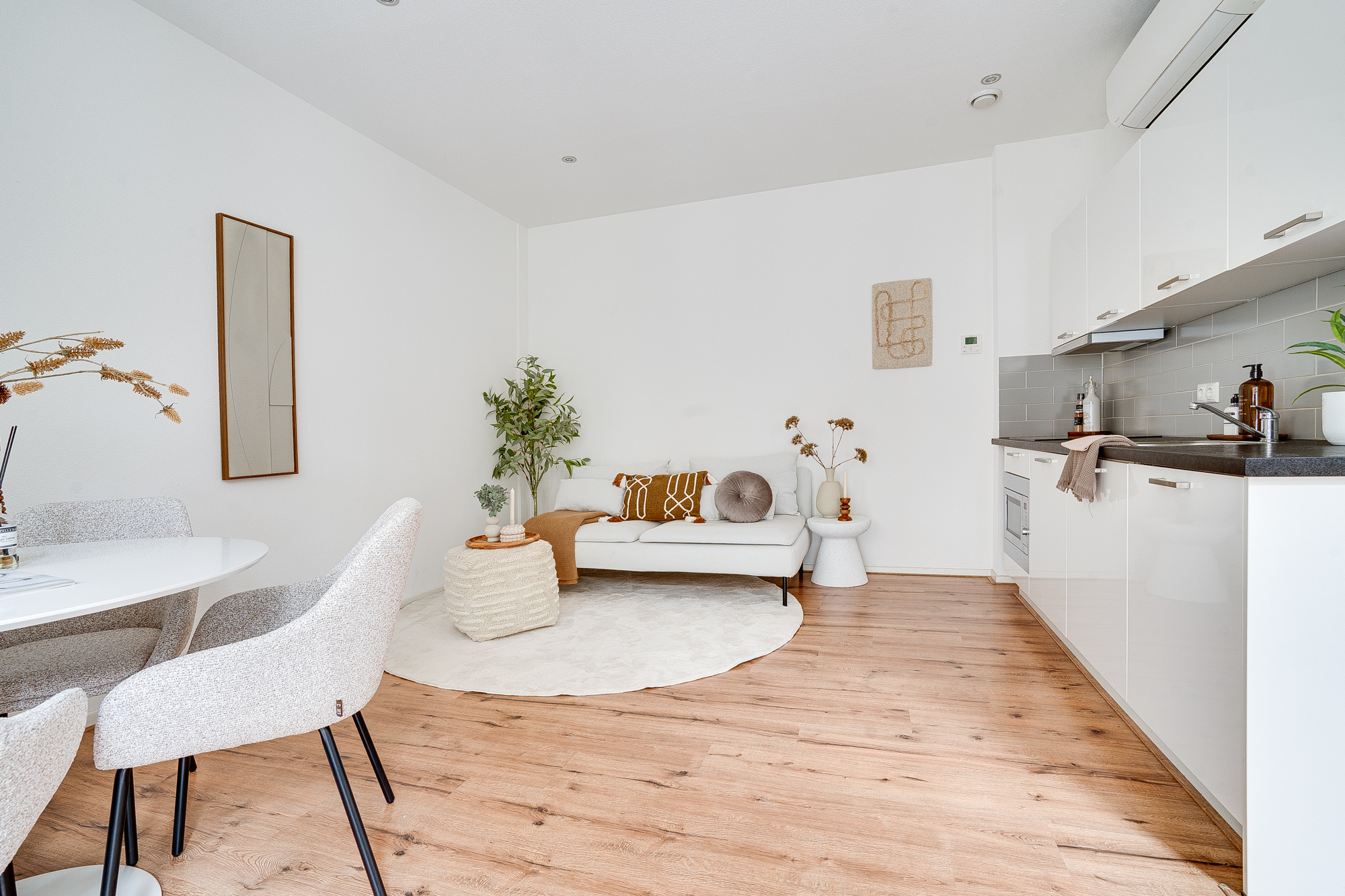 Het appartement is vrijwel over de gehele breedte voorzien van grote raampartijen. Het beschikt over een nette badkamer, open keuken met woongedeelte, 1 slaapkamer en een ruim balkon op het oosten. De keuken is voorzien van een inductiekookplaat, koelkast, combi-oven en vaatwasser. De gehele woning is afgewerkt met een nette laminaatvloer, spuitwerk wandafwerking en ingebouwde, dimbare spots. De moderne badkamer is volledig betegeld en beschikt over een douche, wastafelmeubel, hangend toilet en een elektrische boiler. Hier is ook de aansluiting voor wasapparatuur aanwezig.