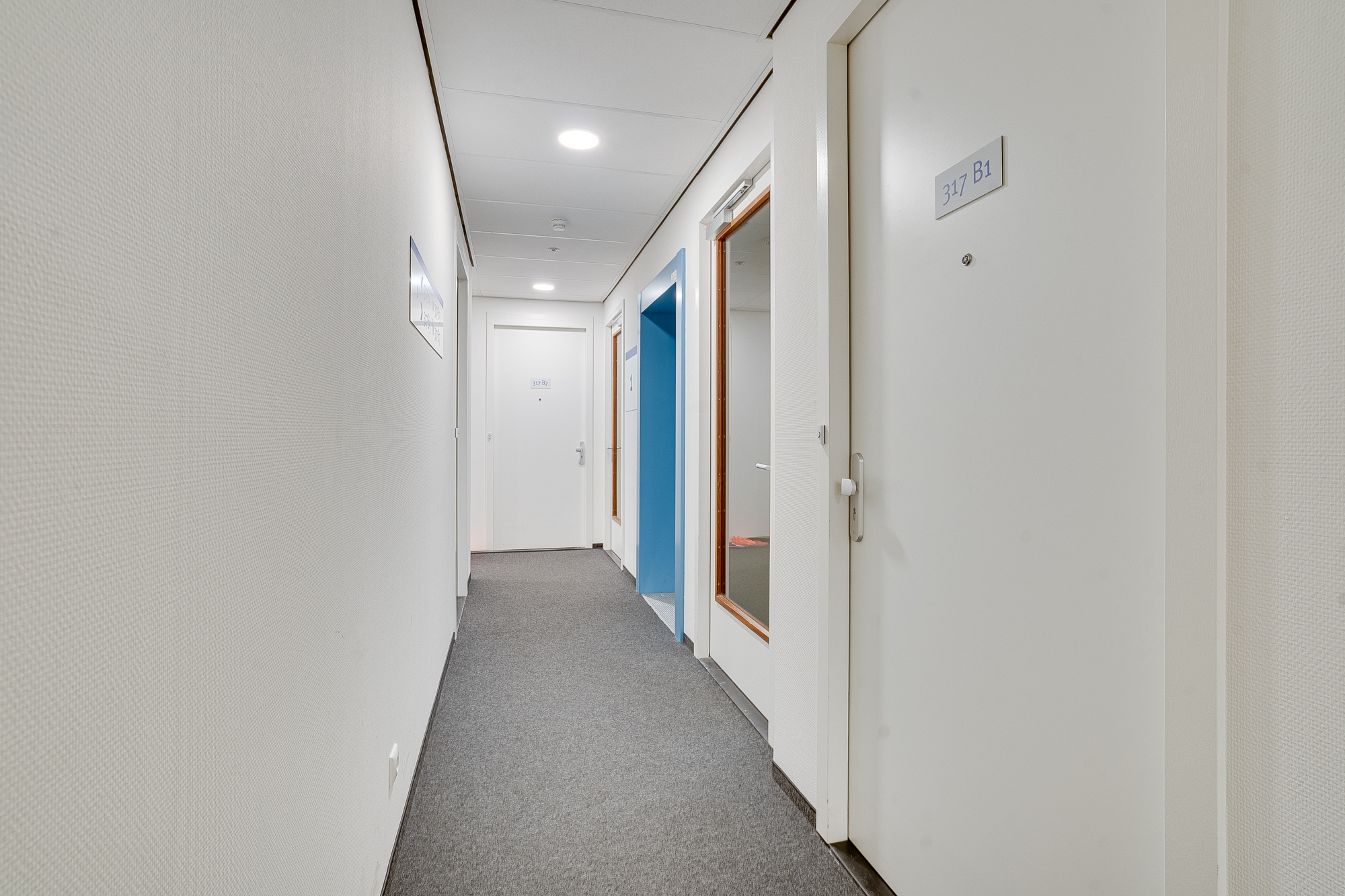 Via de centrale entree met bellentableau, brievenbussen en afgesloten toegang bereik je de nette hal met trappenhuis en lift.