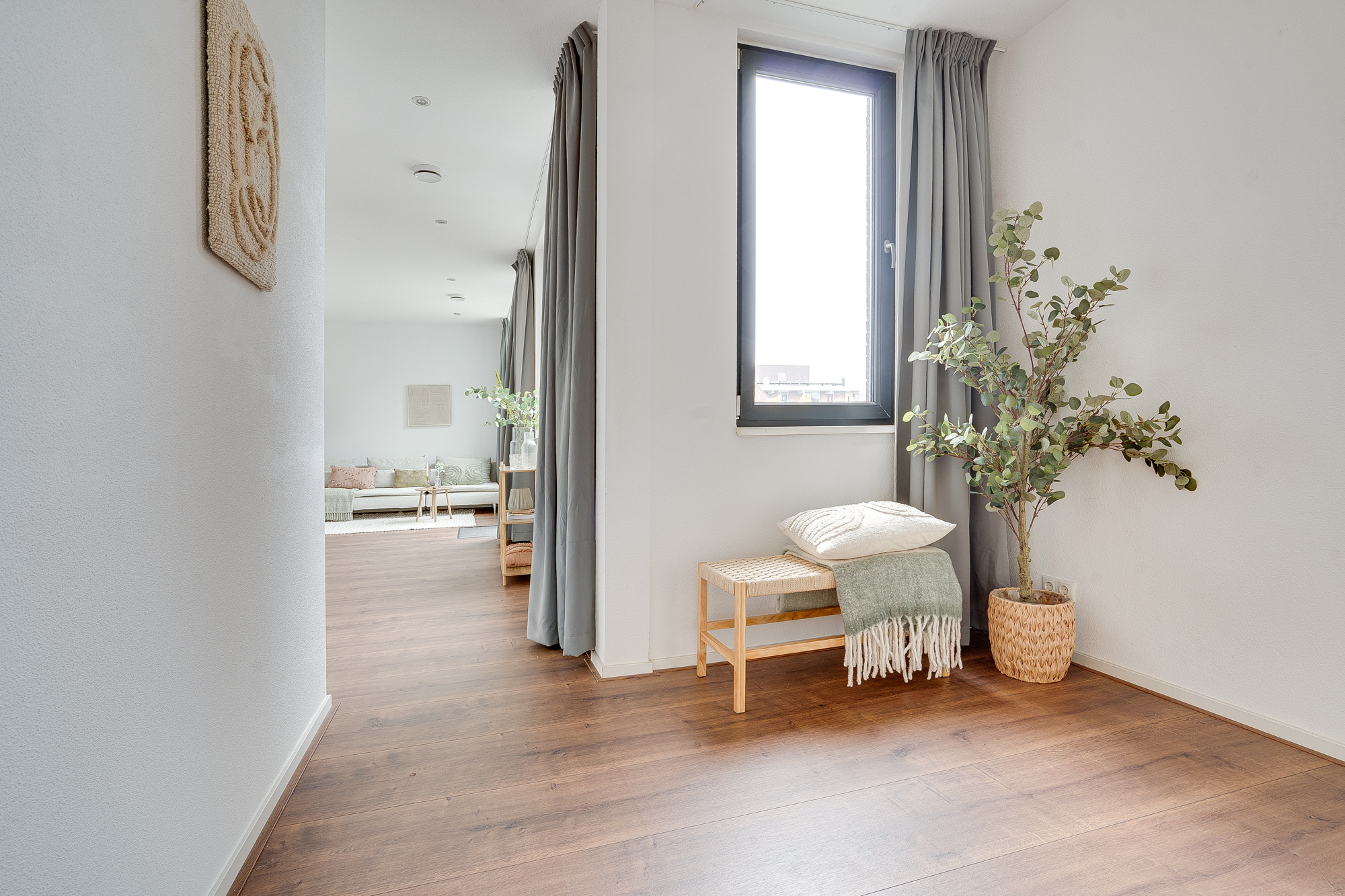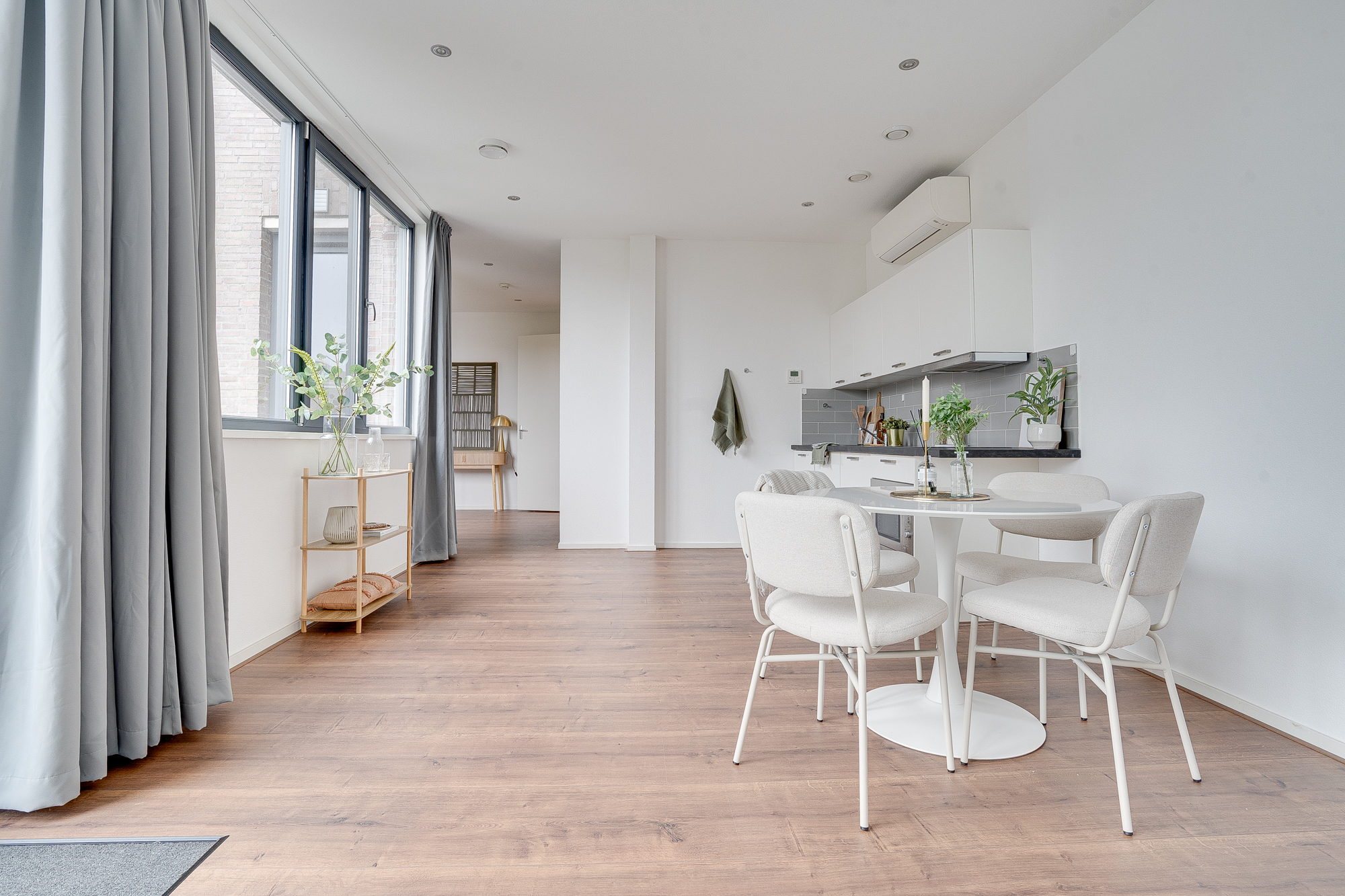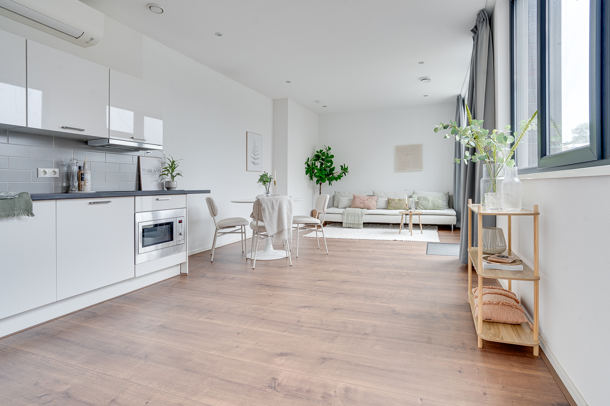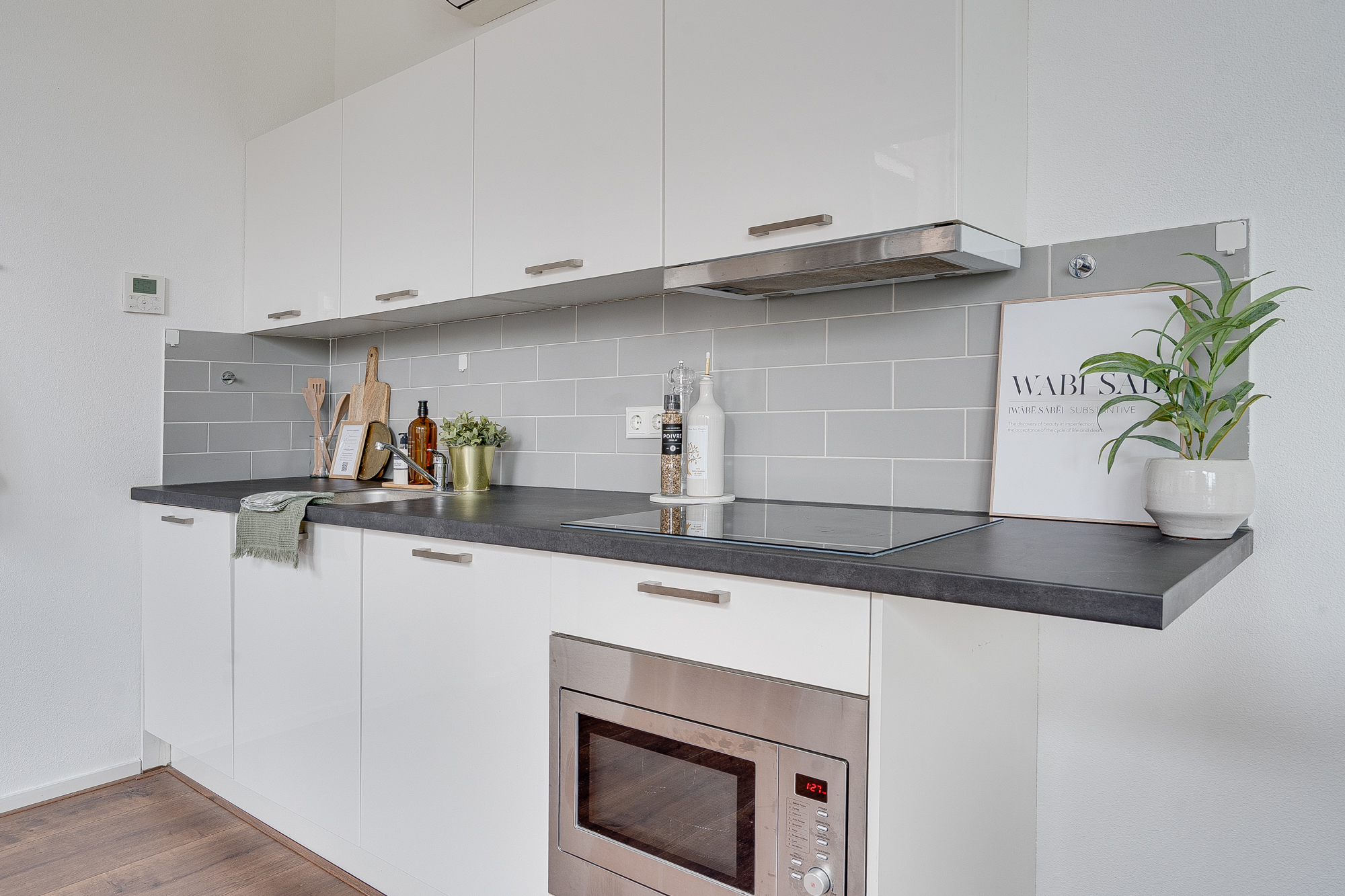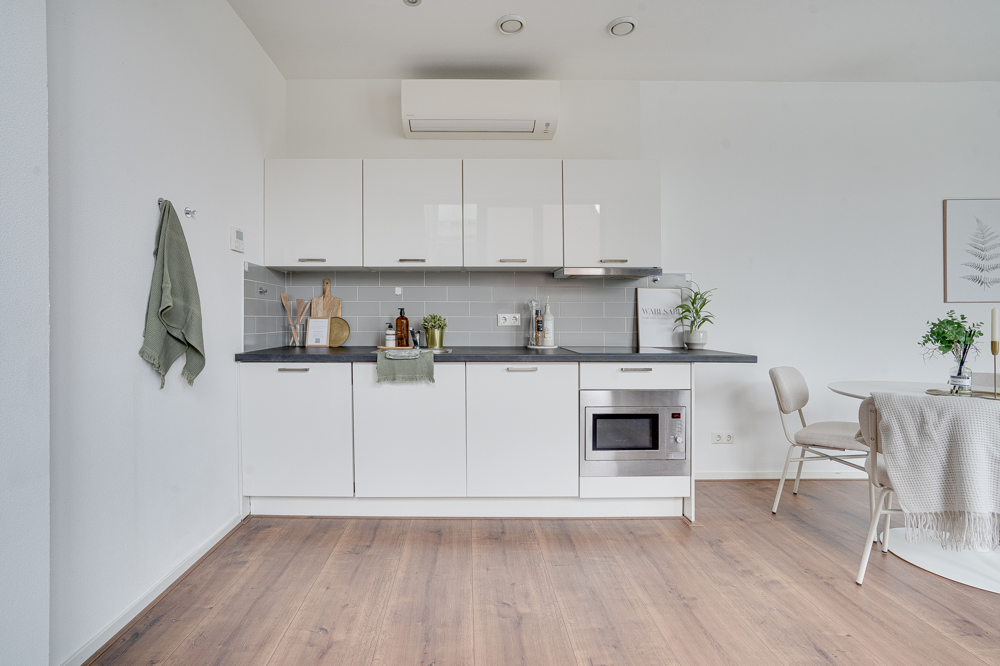 Het appartement zelf heeft een ruimtelijke indeling met veel lichtinval. De woonkamer met open keuken is royaal van opzet en biedt voldoende ruimte voor een zithoek én een eettafel. De keuken is voorzien van een inductiekookplaat, koelkast, combi-oven en vaatwasser. De gehele woning is afgewerkt met een nette laminaatvloer, spuitwerk wandafwerking en ingebouwde, dimbare spots. Centraal gesitueerd tussen de hal, slaapkamer en woonkamer bevindt zich een ruimte die zeer geschikt is voor gebruik als thuiskantoor of gewoonweg om kasten neer te zetten.