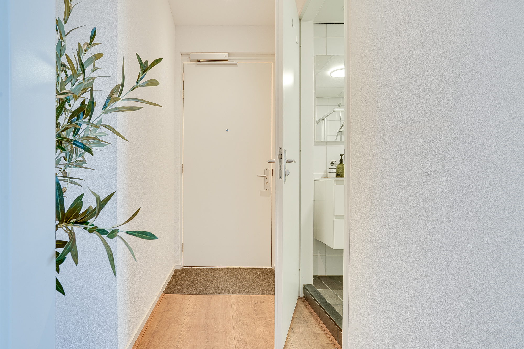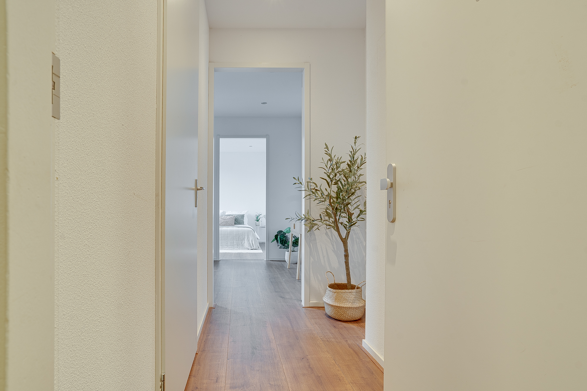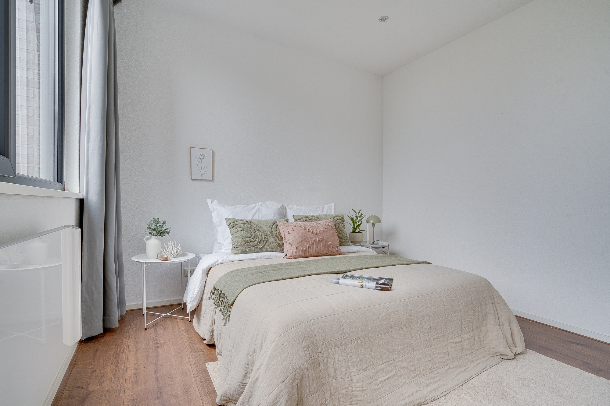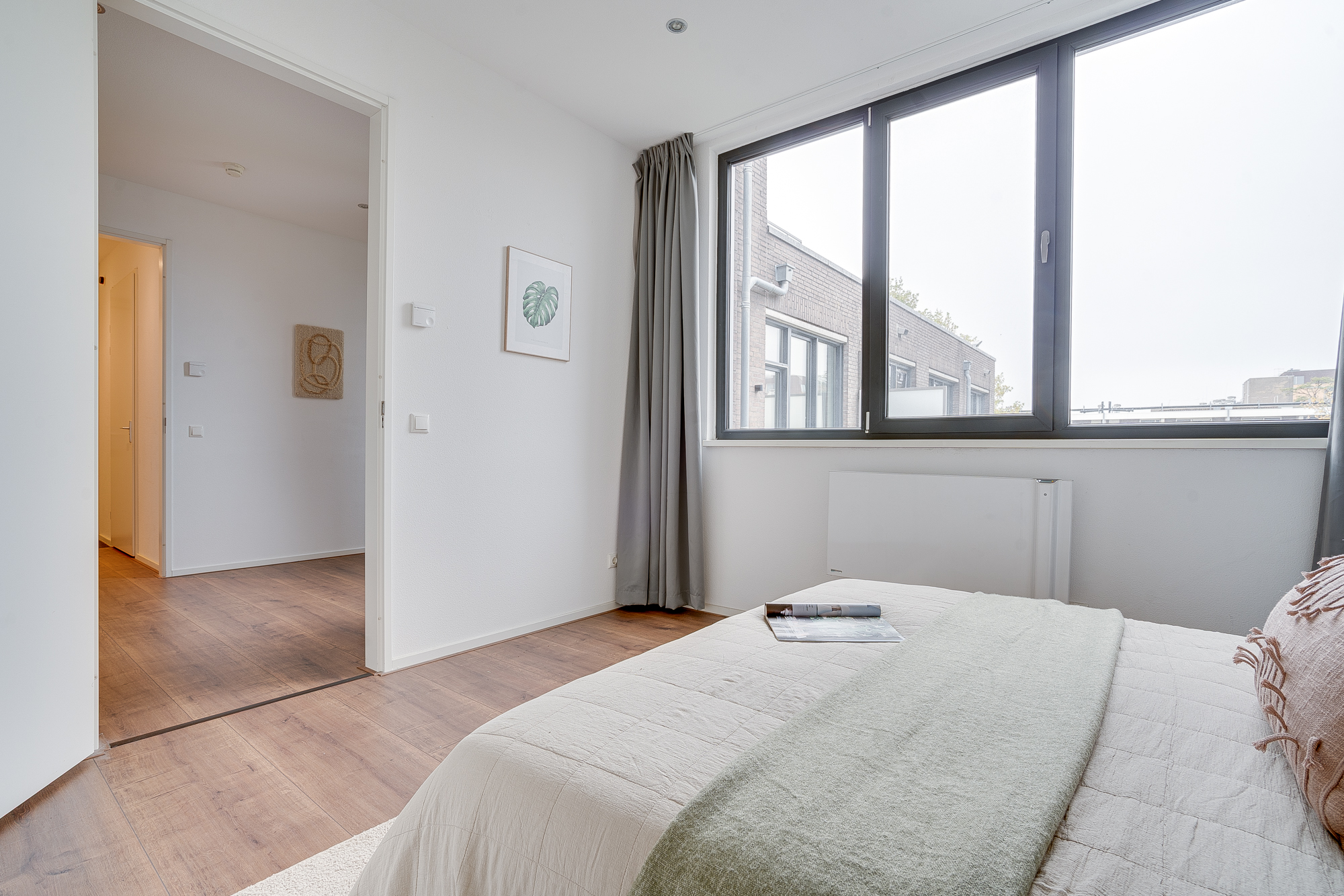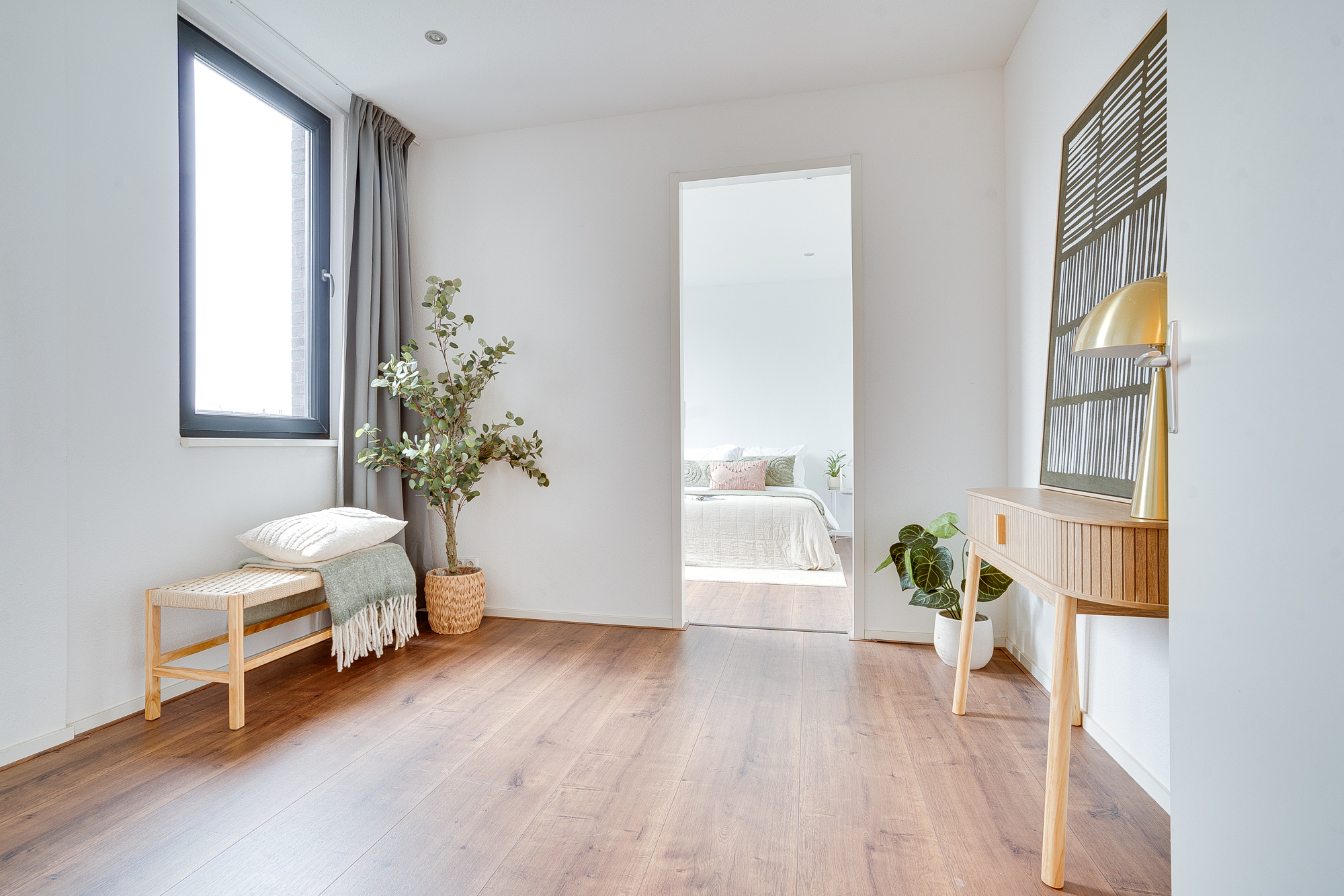Het appartement zelf heeft een ruimtelijke indeling met veel lichtinval. De woonkamer met open keuken is royaal van opzet en biedt voldoende ruimte voor een zithoek én een eettafel. De keuken is voorzien van een inductiekookplaat, koelkast, combi-oven en vaatwasser. De gehele woning is afgewerkt met een nette laminaatvloer, spuitwerk wandafwerking en ingebouwde, dimbare spots. Centraal gesitueerd tussen de hal, slaapkamer en woonkamer bevindt zich een ruimte die zeer geschikt is voor gebruik als thuiskantoor of gewoonweg om kasten neer te zetten.