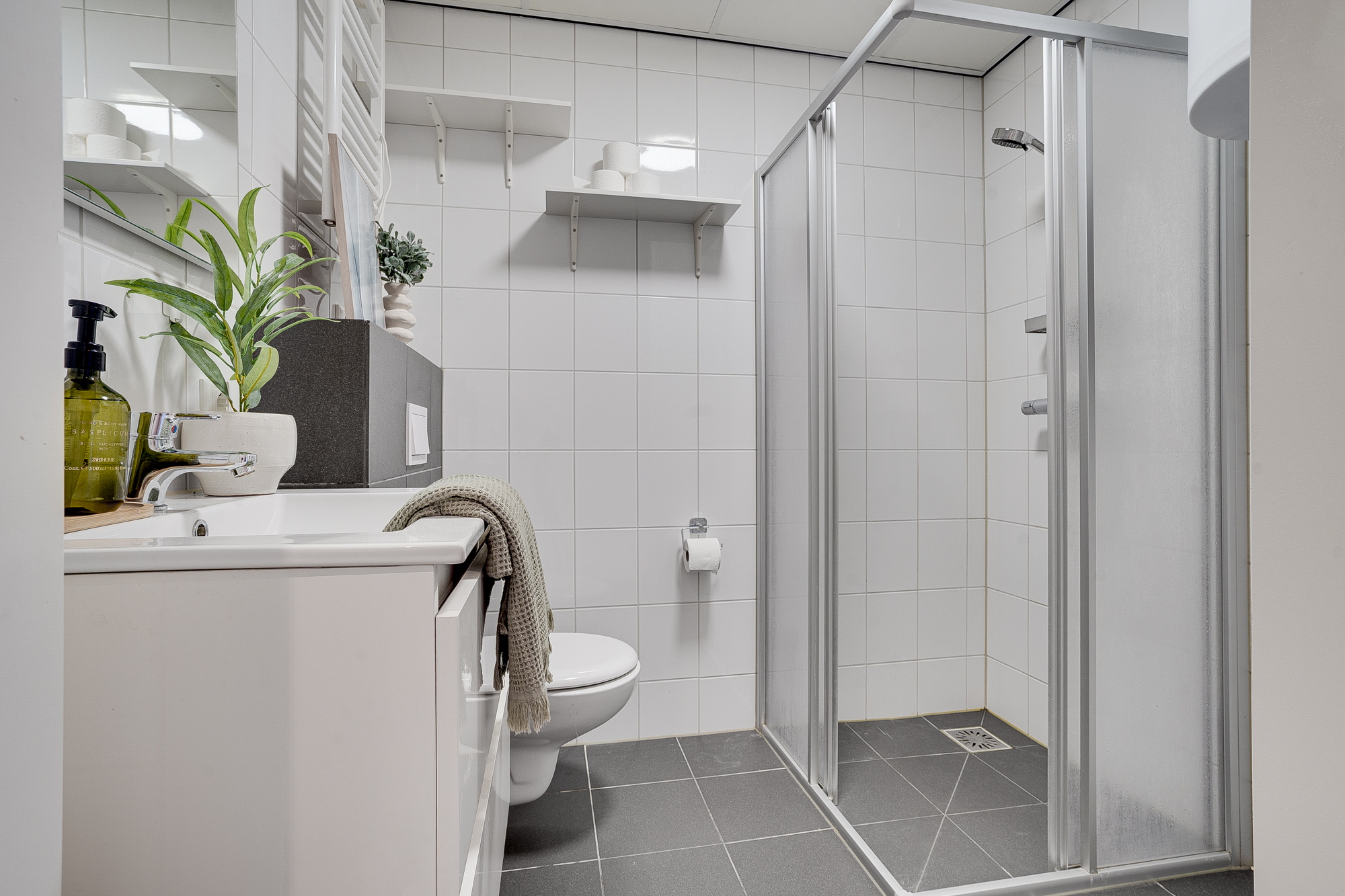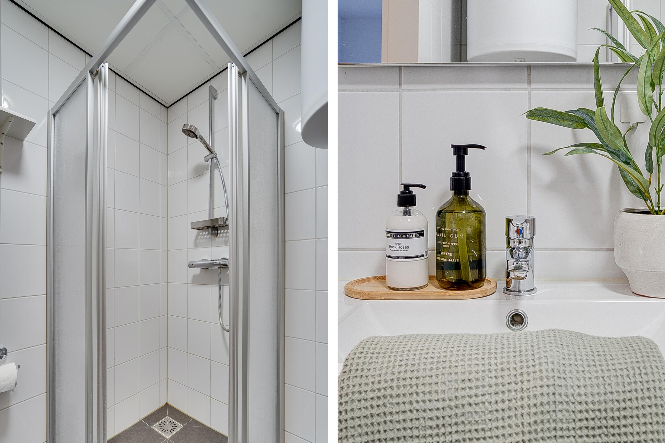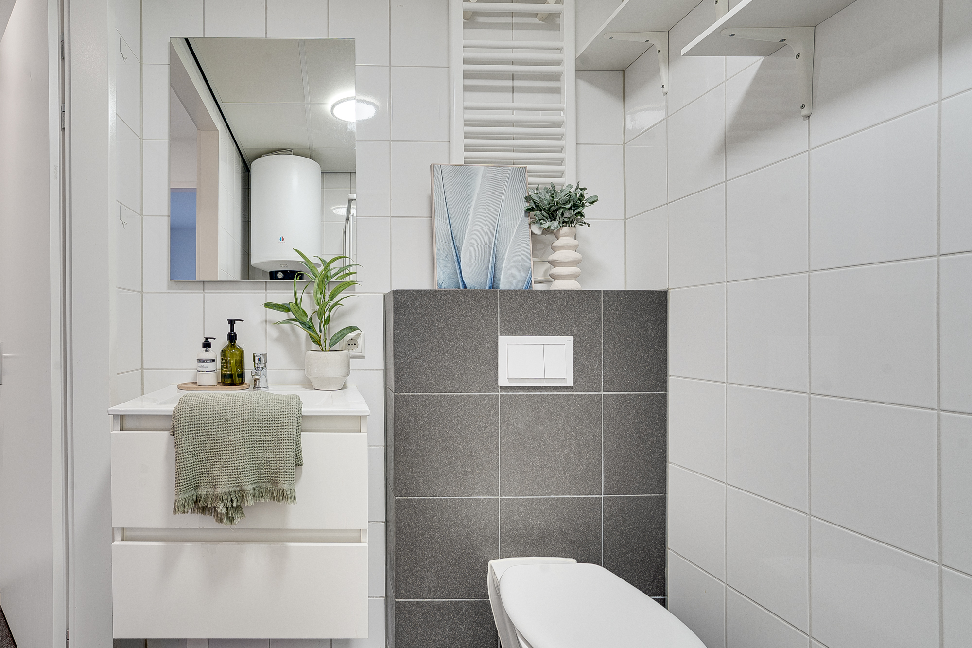 De slaapkamer is ruim bemeten en de moderne badkamer is volledig betegeld en beschikt over een douche, wastafelmeubel, hangend toilet en een elektrische boiler. Hier is ook de aansluiting voor wasapparatuur aanwezig.