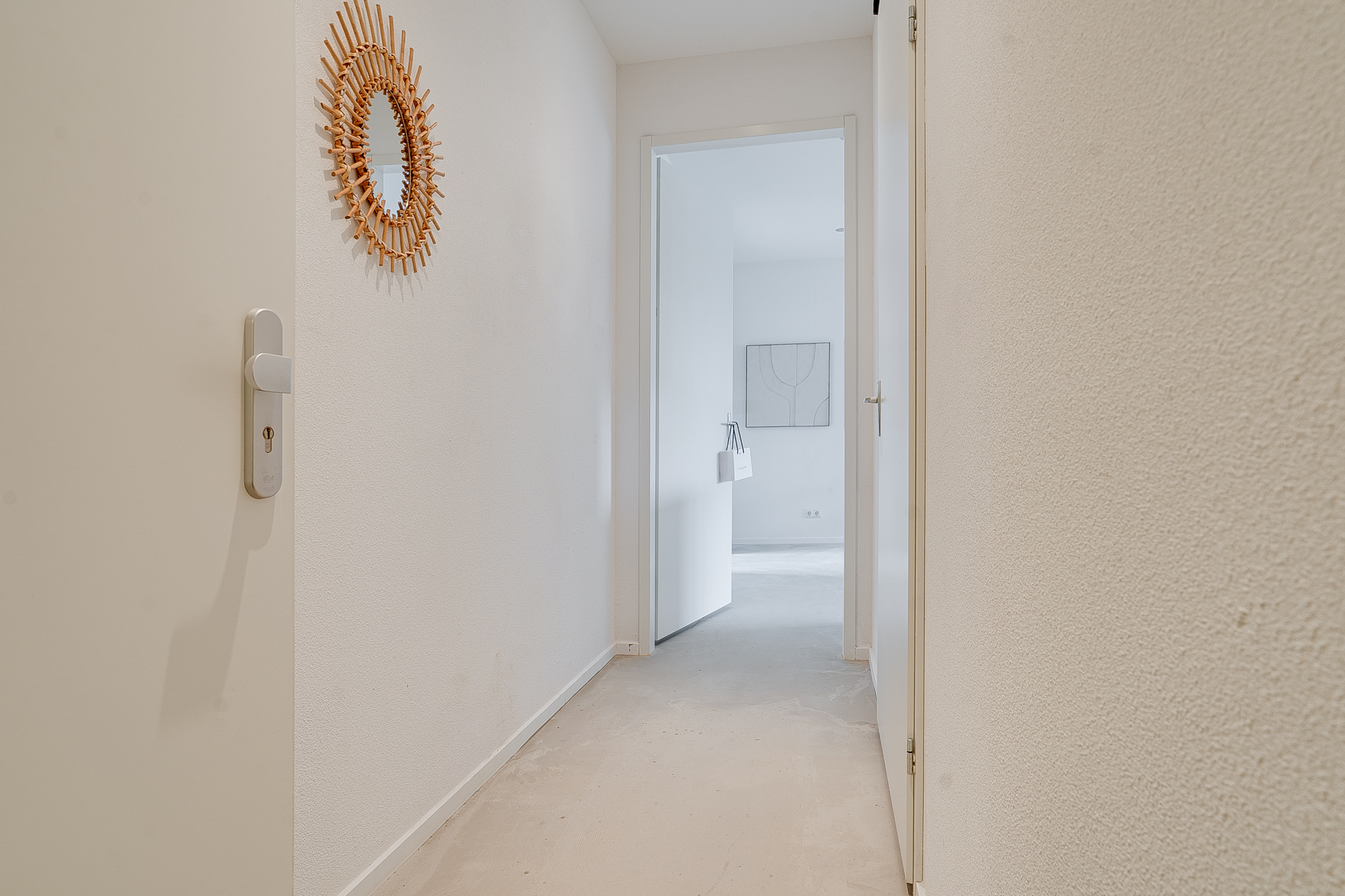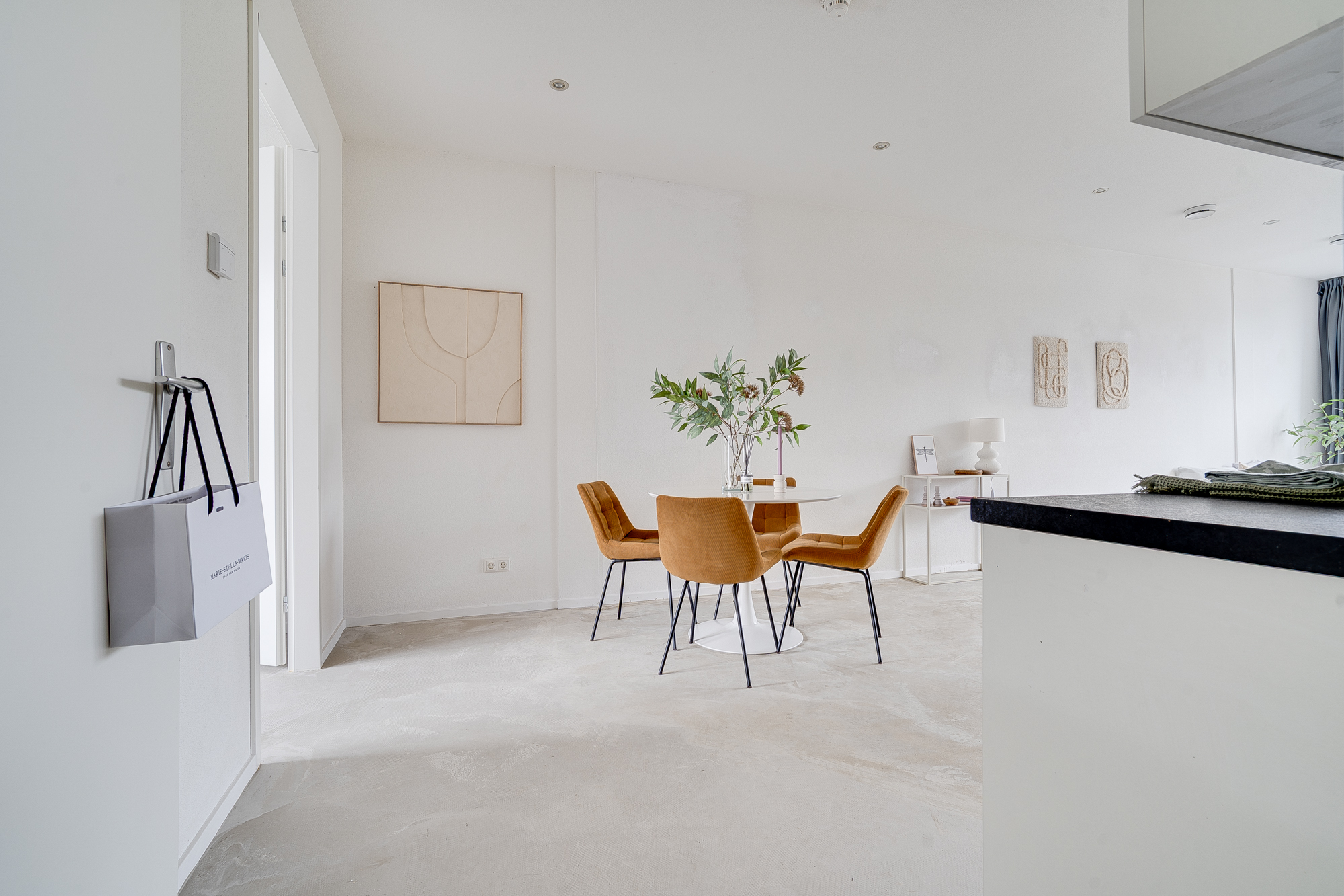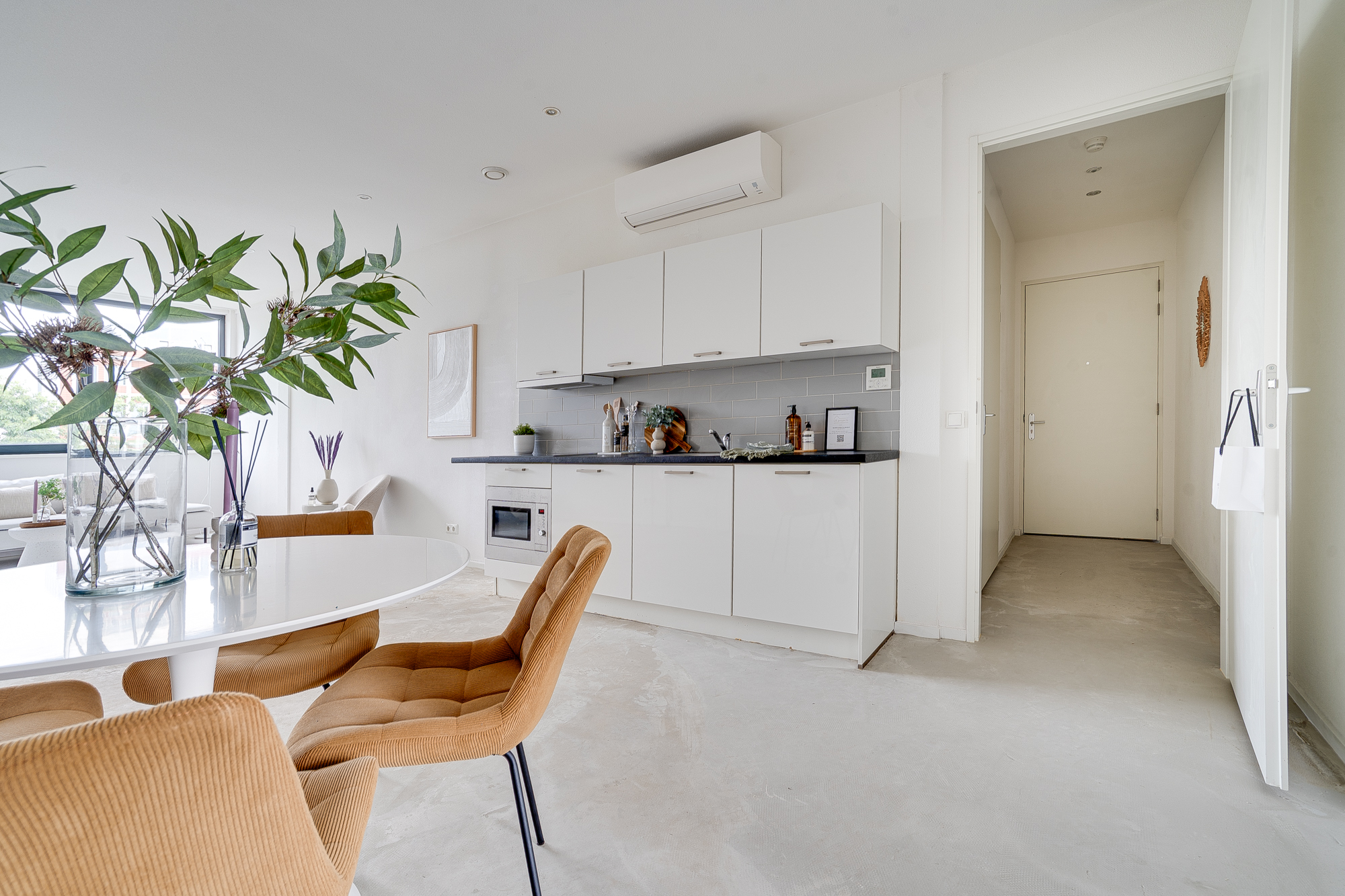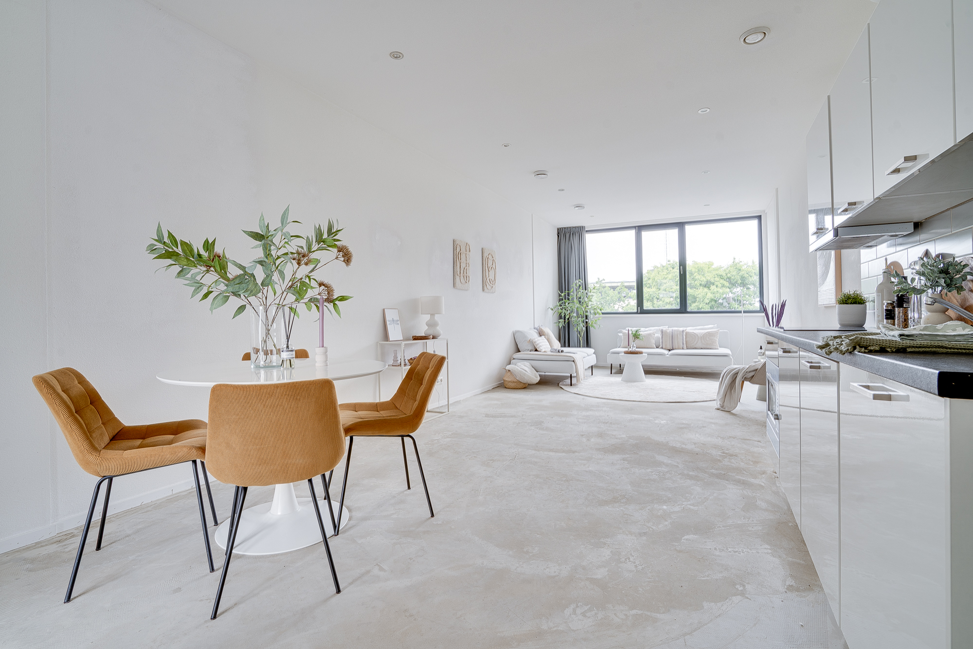 Het appartement zelf heeft een praktische en ruimtelijke indeling met veel lichtinval. De woonkamer met open keuken is royaal van opzet en biedt voldoende ruimte voor een ruime zithoek én een grote eettafel. De keuken is voorzien van een inductiekookplaat, koelkast, combi-oven en vaatwasser. De gehele woning is afgewerkt met een recent geëgaliseerde vloer (klaar om direct een vloer naar wens op aan te brengen), spuitwerk wandafwerking en ingebouwde, dimbare spots.