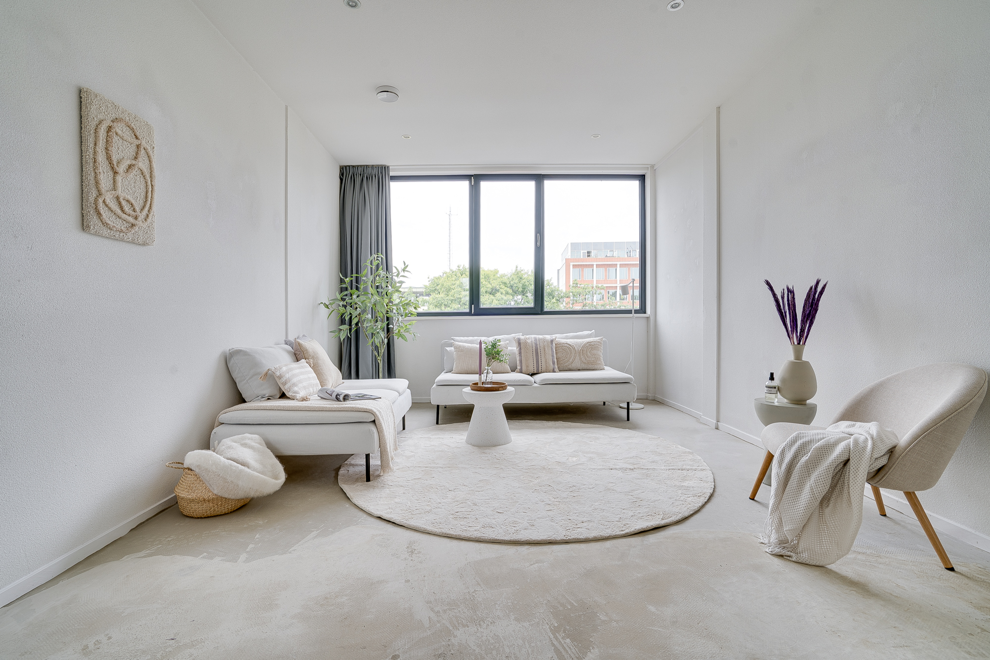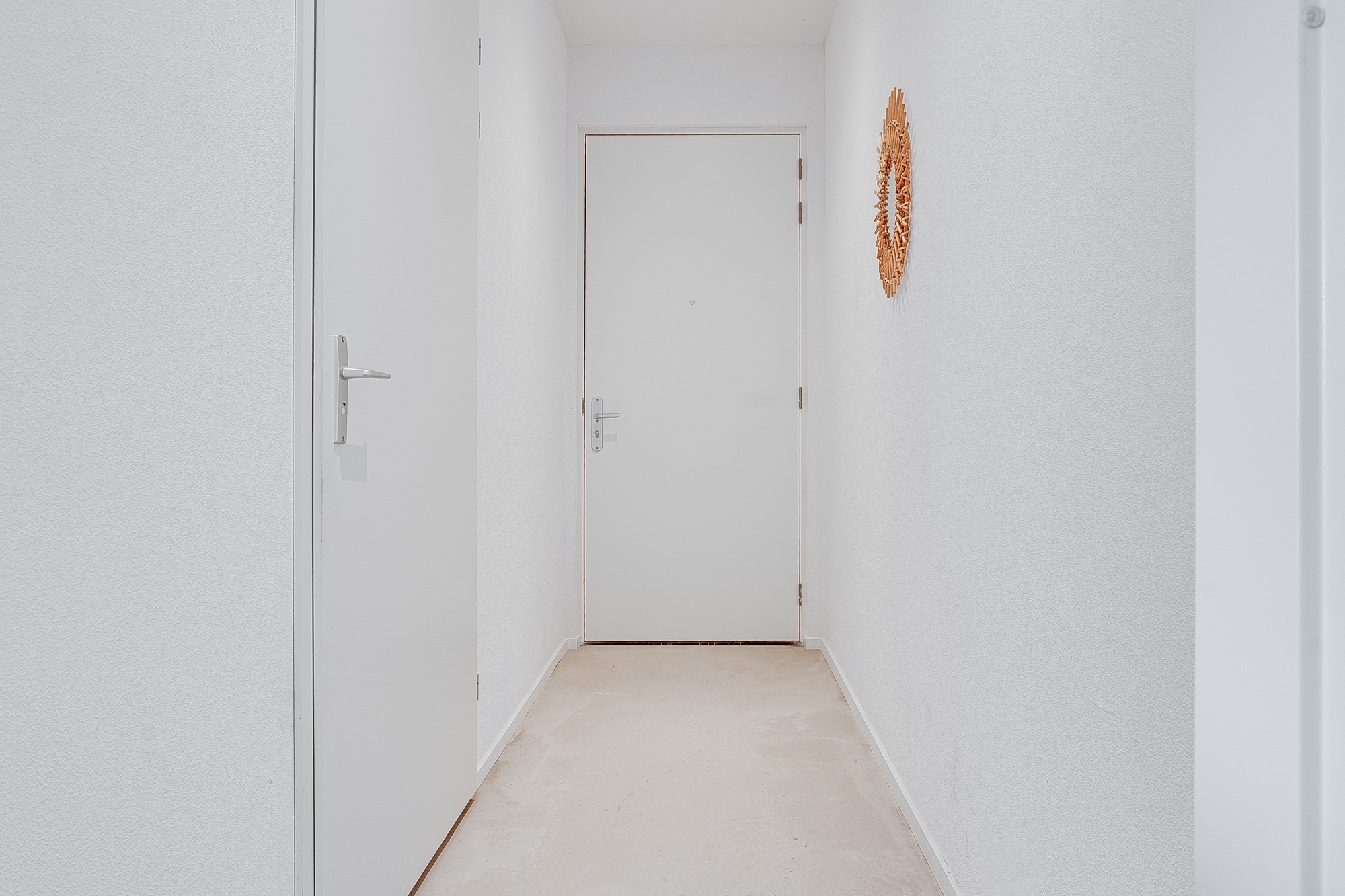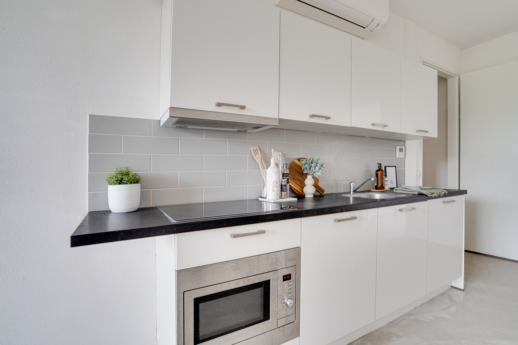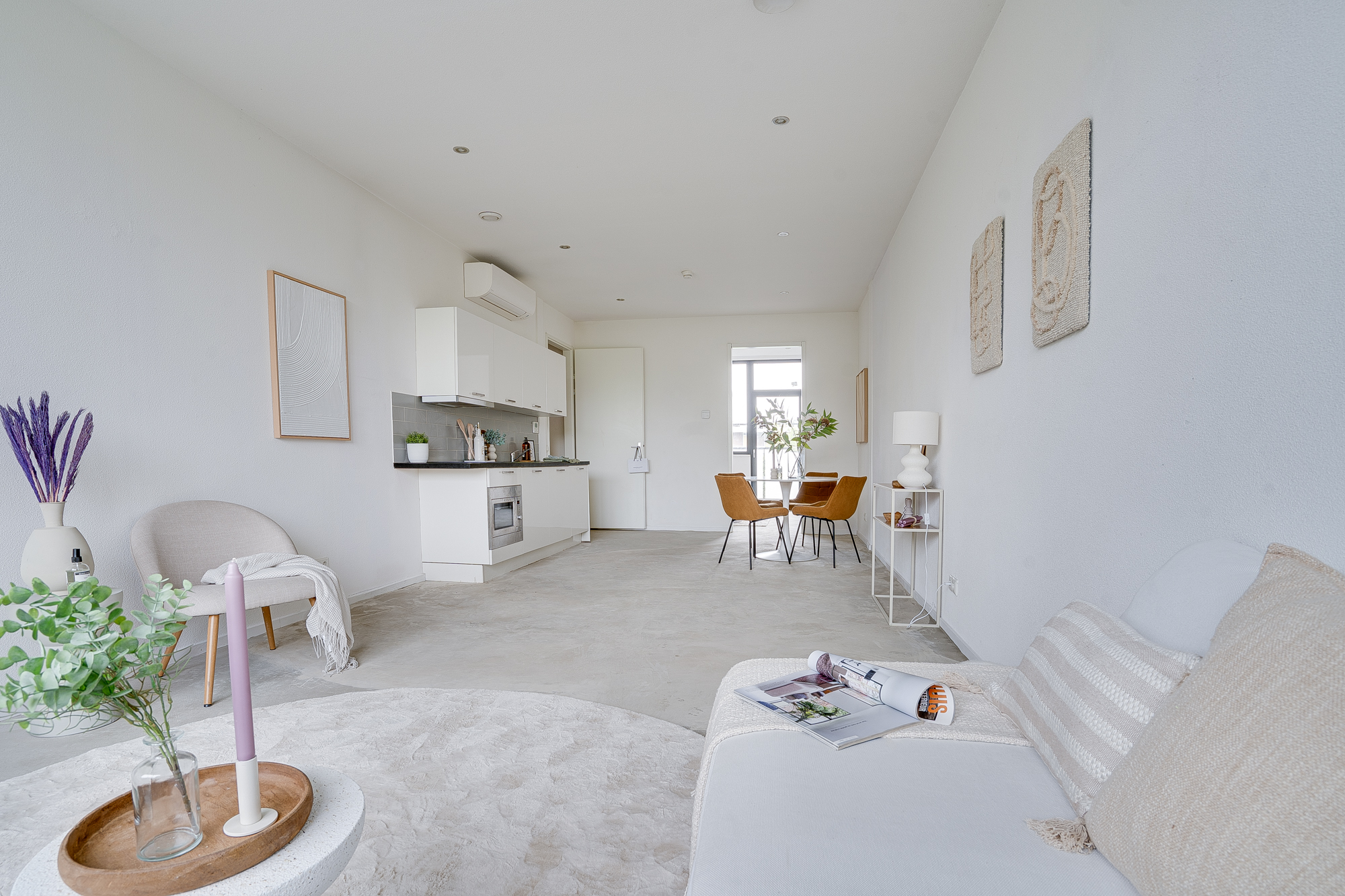 Het appartement zelf heeft een praktische en ruimtelijke indeling met veel lichtinval. De woonkamer met open keuken is royaal van opzet en biedt voldoende ruimte voor een ruime zithoek én een grote eettafel. De keuken is voorzien van een inductiekookplaat, koelkast, combi-oven en vaatwasser. De gehele woning is afgewerkt met een recent geëgaliseerde vloer (klaar om direct een vloer naar wens op aan te brengen), spuitwerk wandafwerking en ingebouwde, dimbare spots.