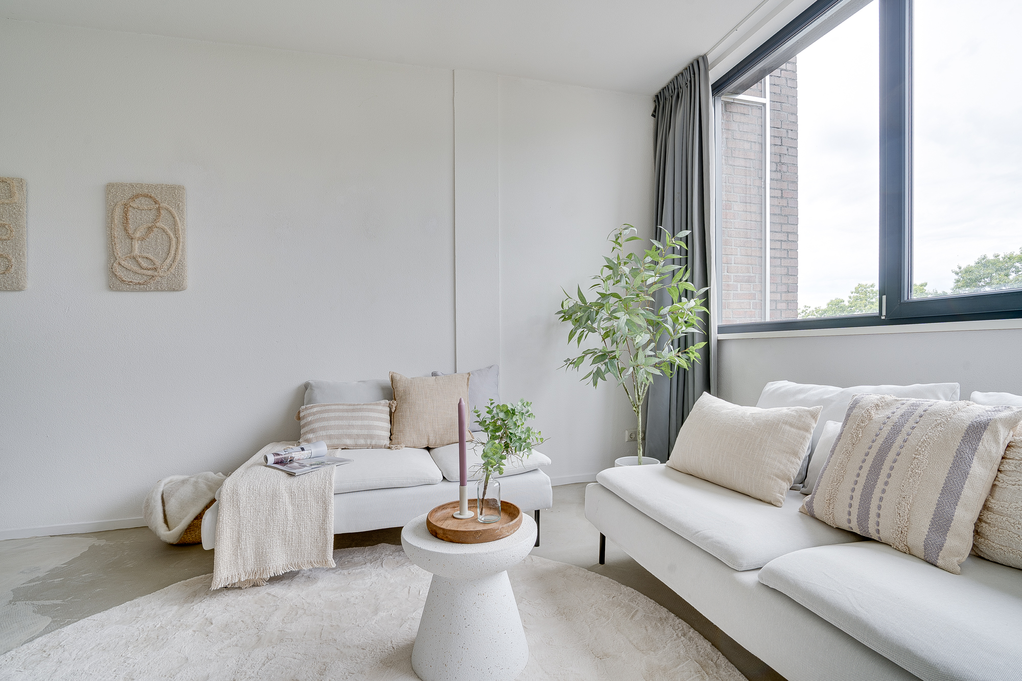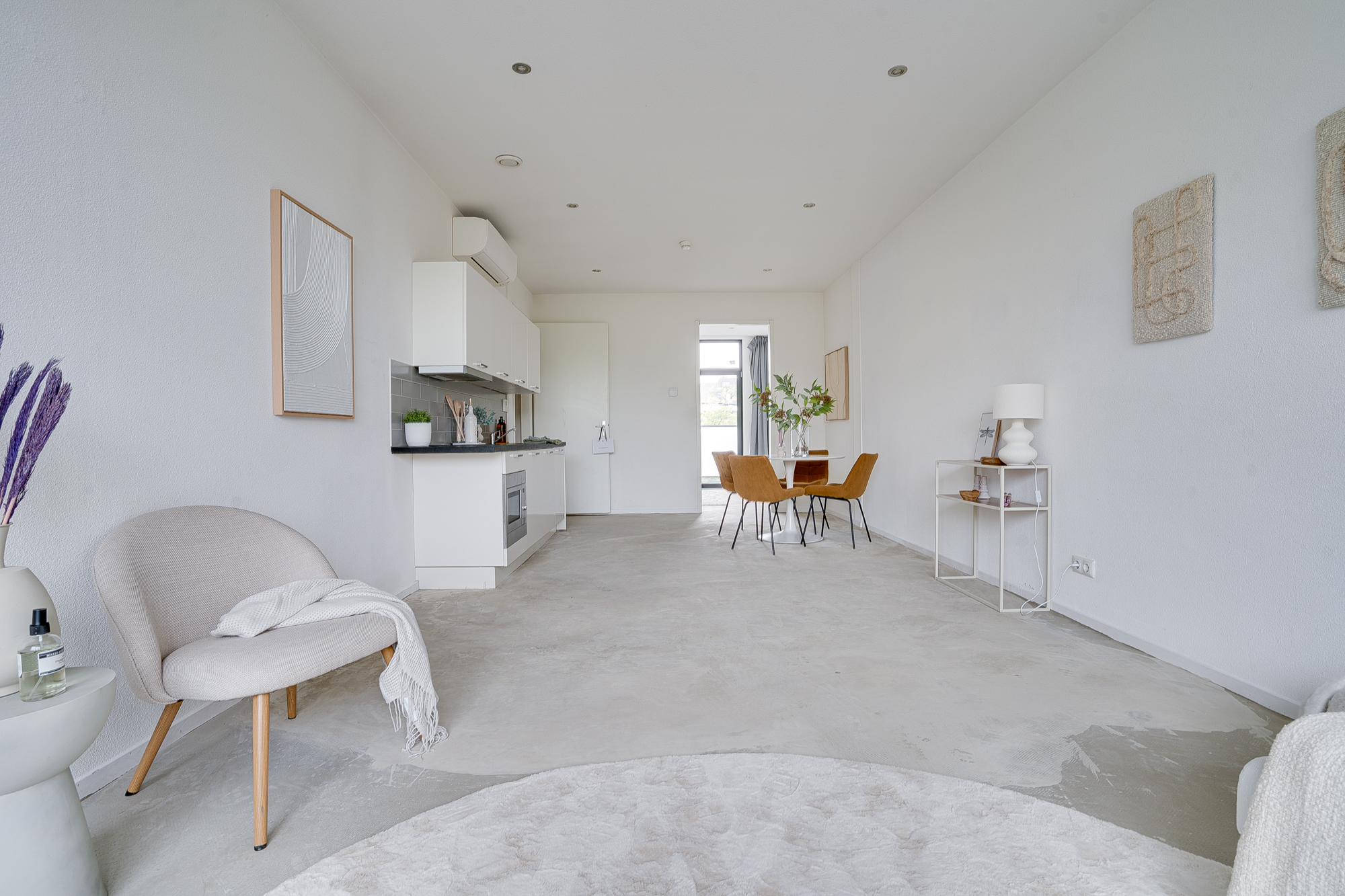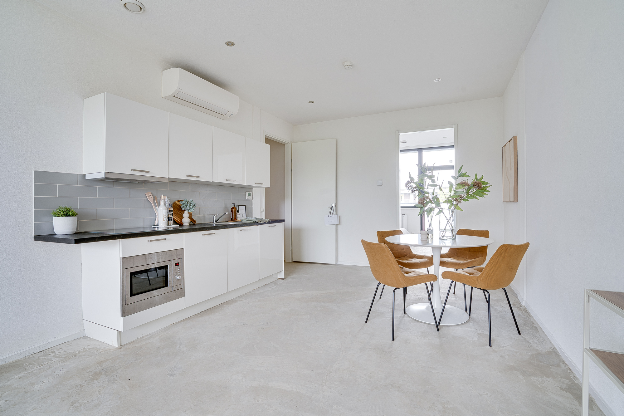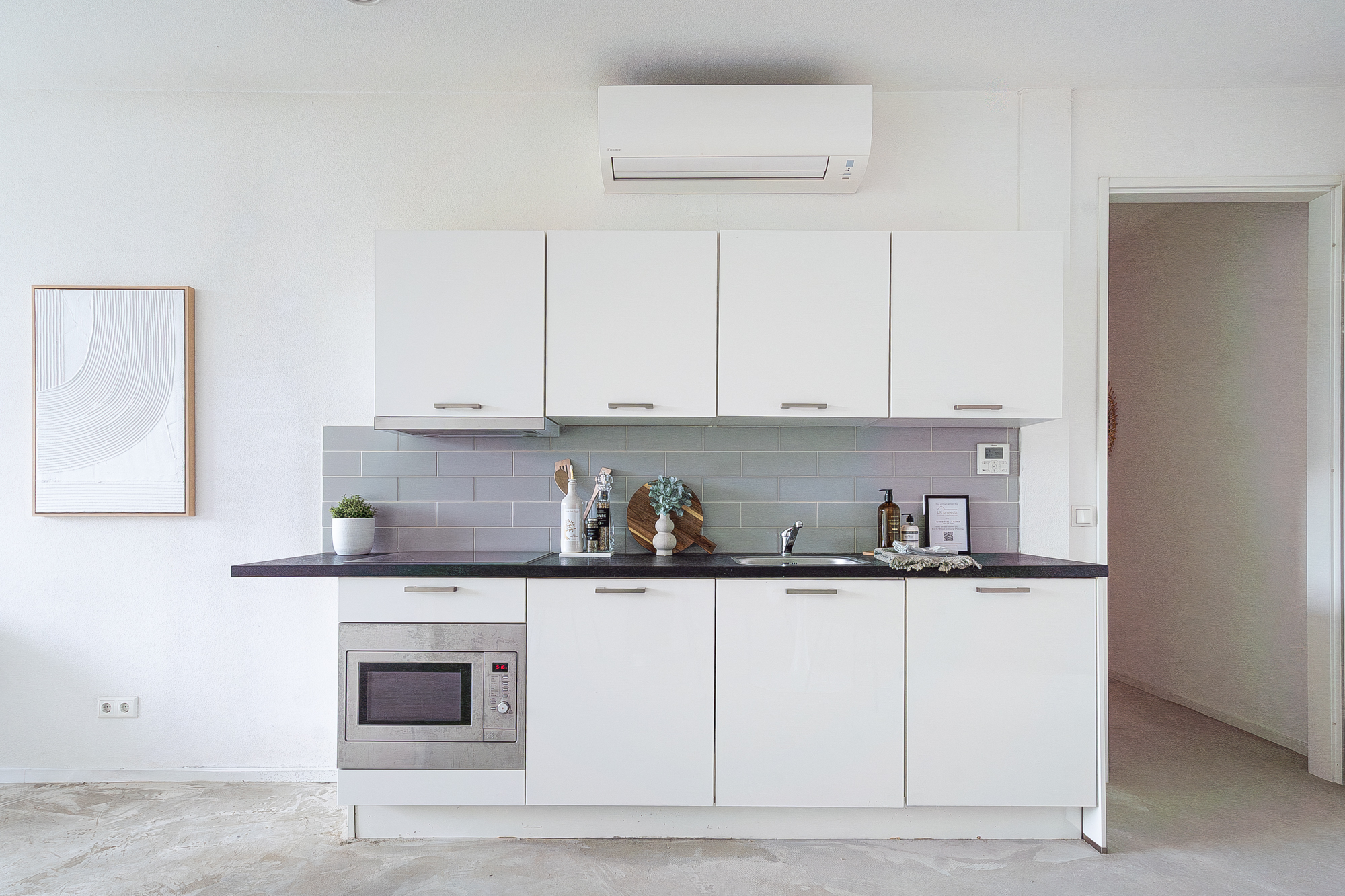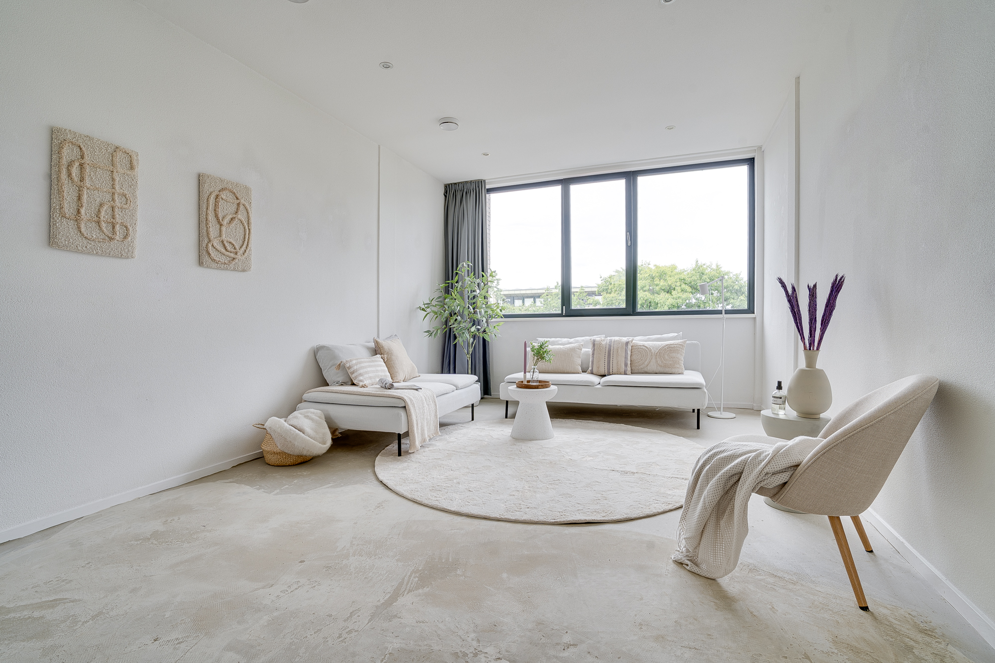 Het appartement zelf heeft een praktische en ruimtelijke indeling met veel lichtinval. De woonkamer met open keuken is royaal van opzet en biedt voldoende ruimte voor een ruime zithoek én een grote eettafel. De keuken is voorzien van een inductiekookplaat, koelkast, combi-oven en vaatwasser. De gehele woning is afgewerkt met een recent geëgaliseerde vloer (klaar om direct een vloer naar wens op aan te brengen), spuitwerk wandafwerking en ingebouwde, dimbare spots.