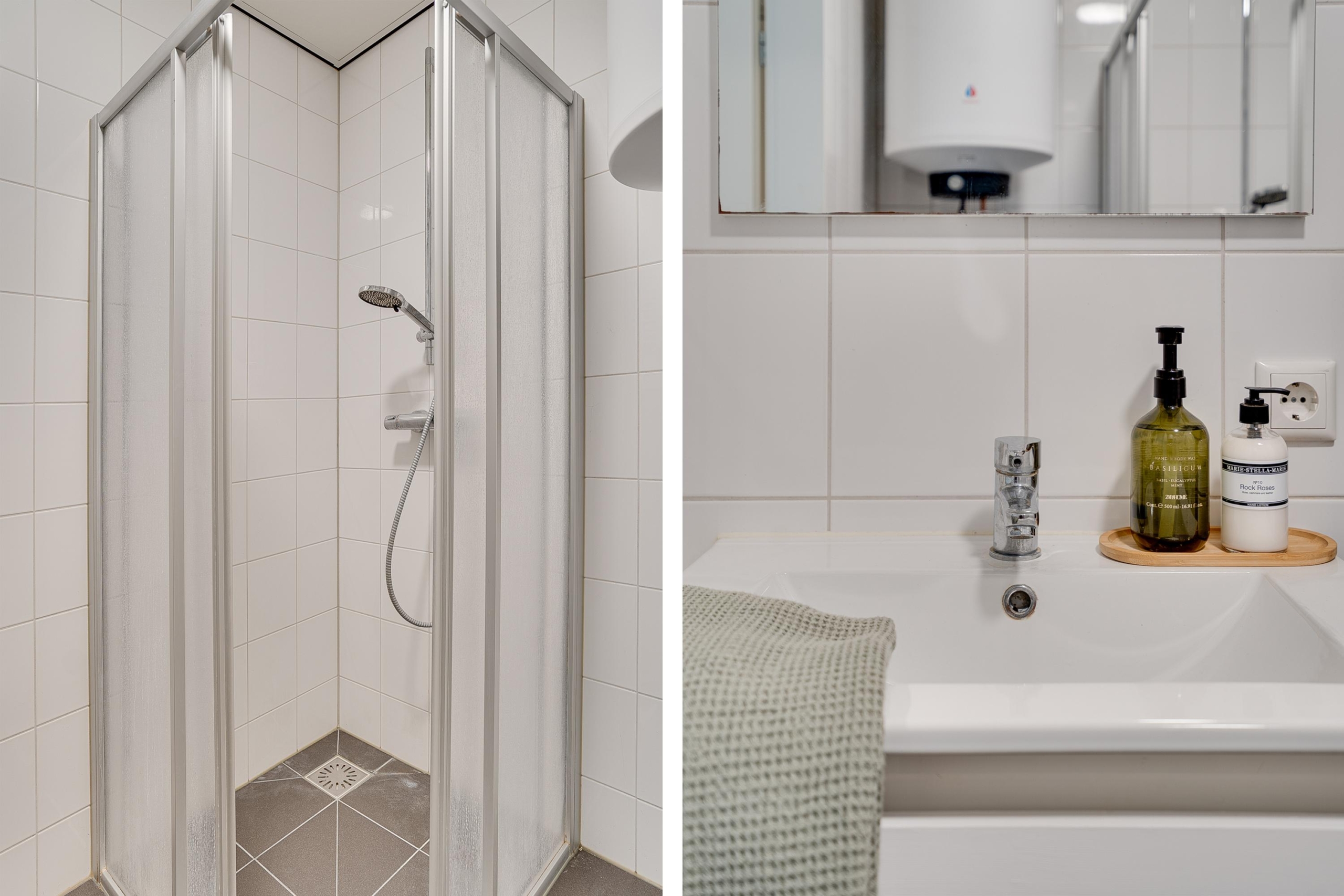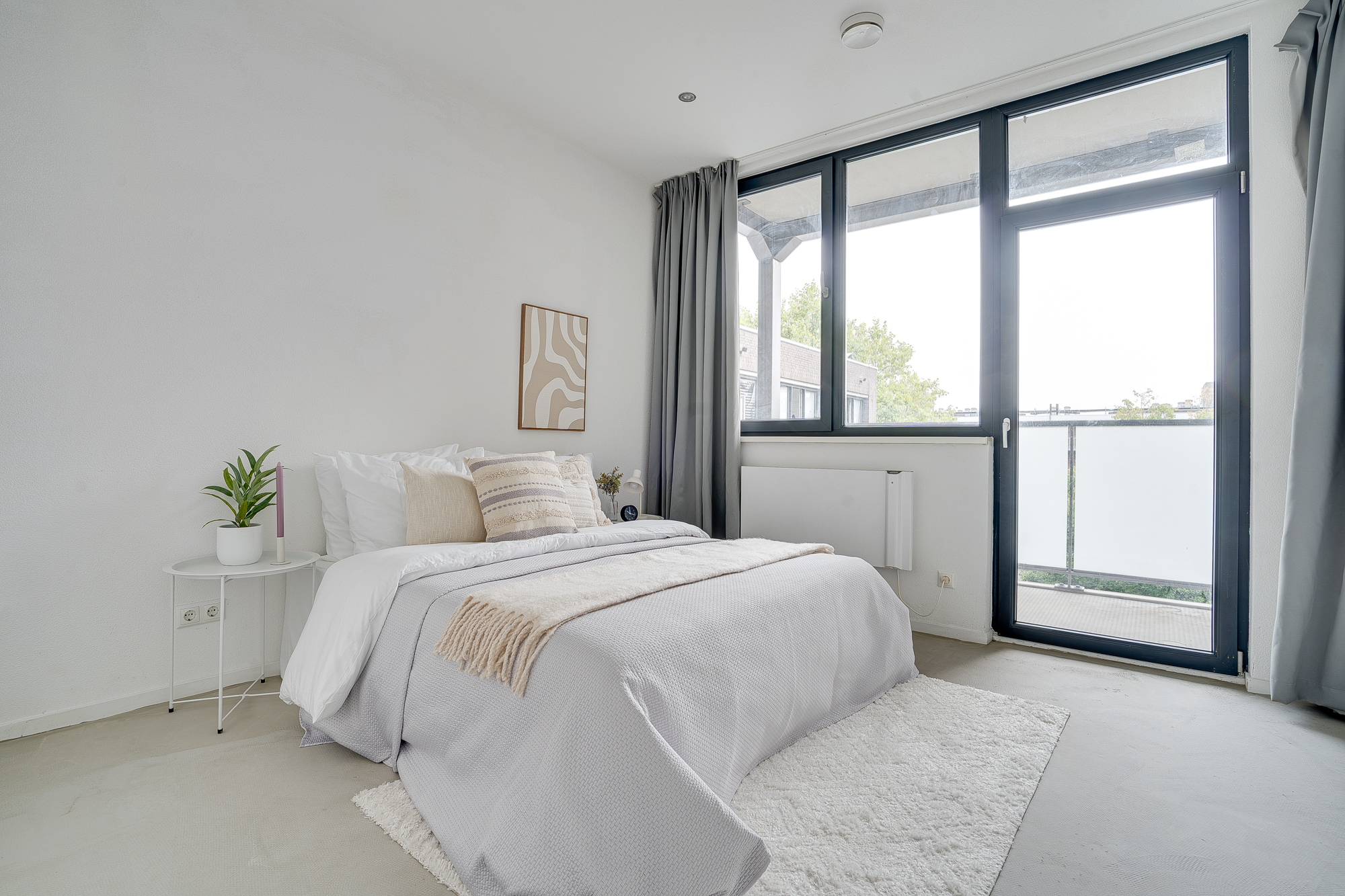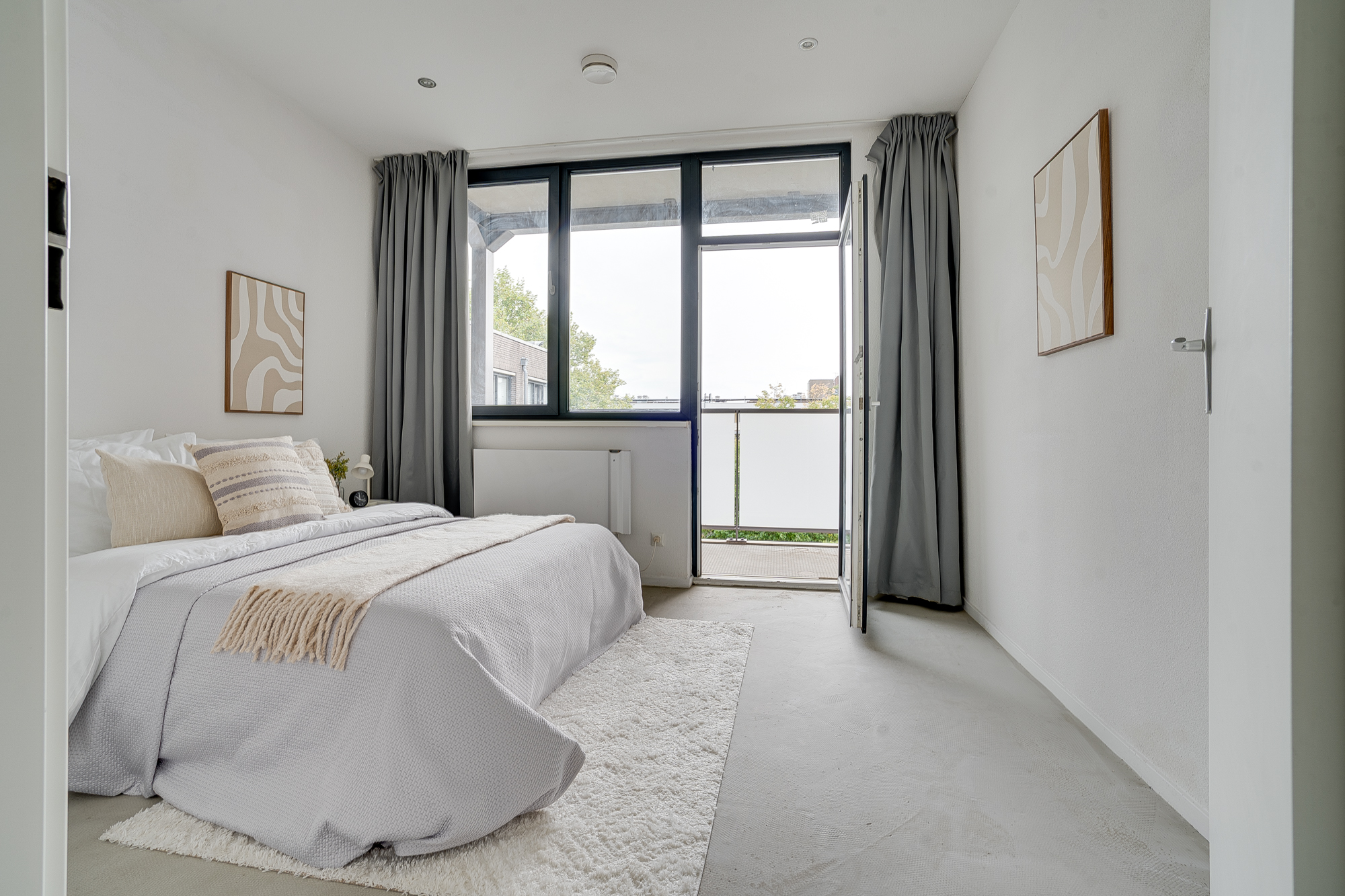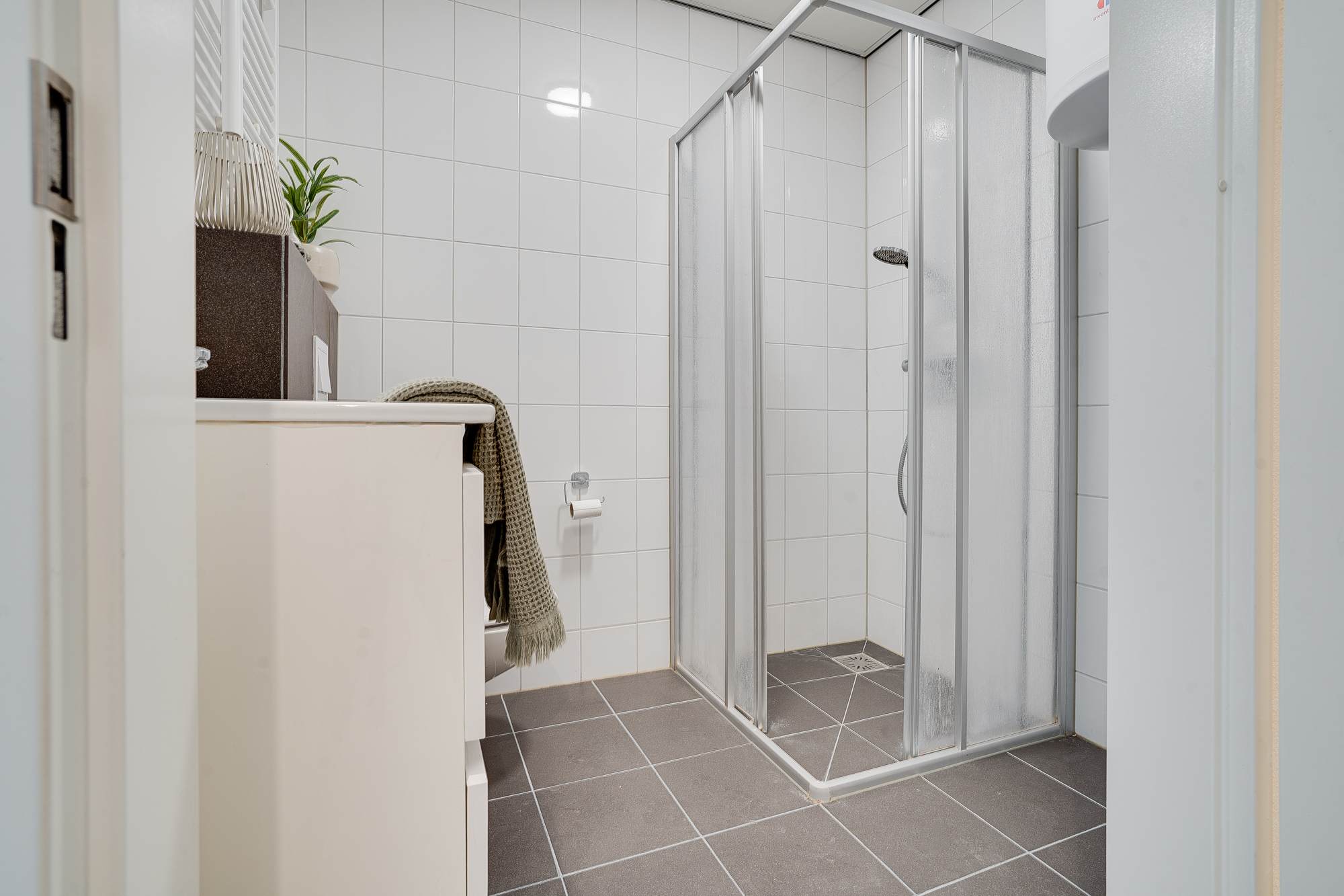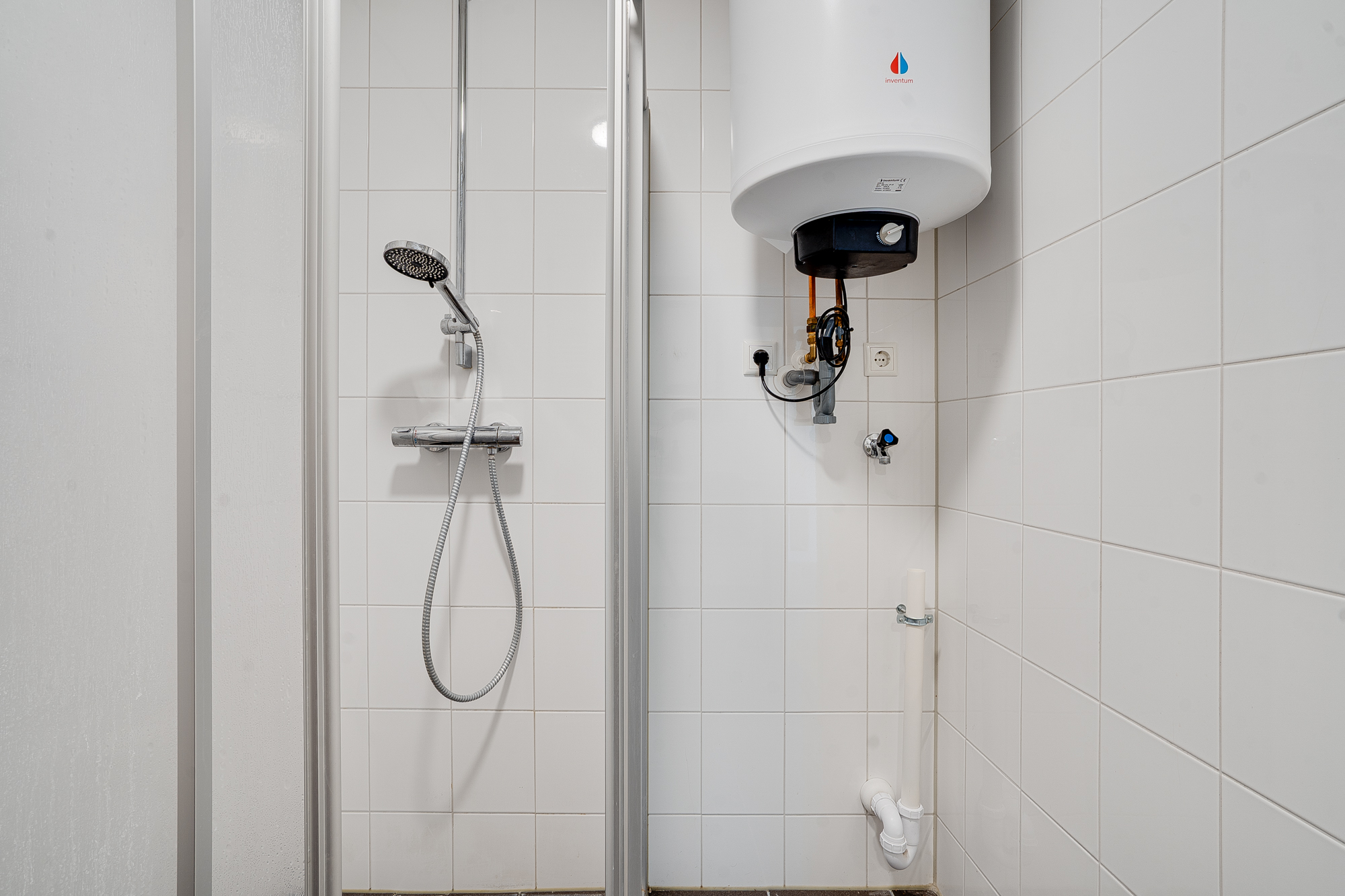 De slaapkamer is ruim bemeten en biedt direct toegang tot het balkon aan de achterzijde. De moderne badkamer is volledig betegeld en beschikt over een douche, wastafelmeubel, hangend toilet en een elektrische boiler.