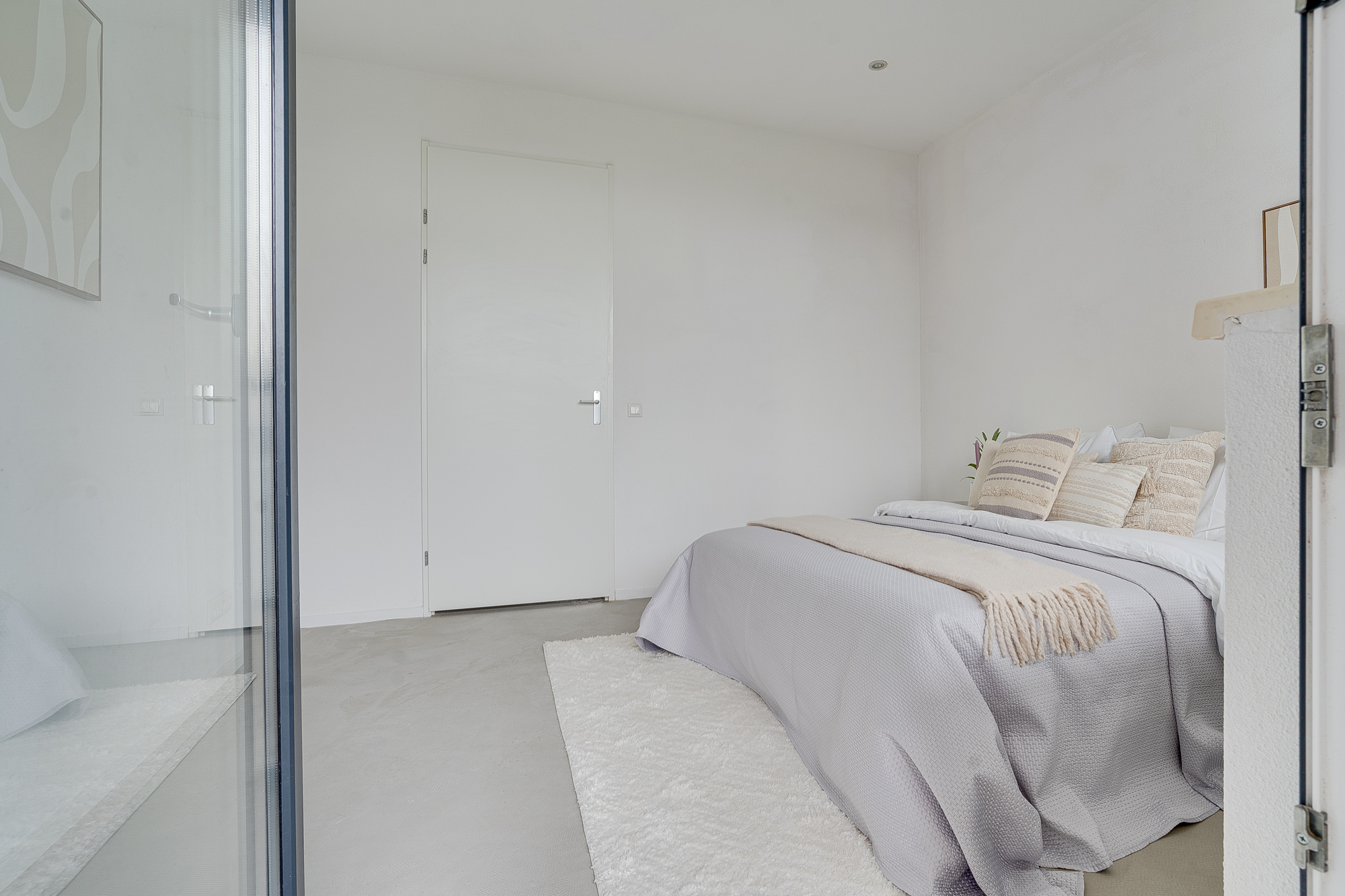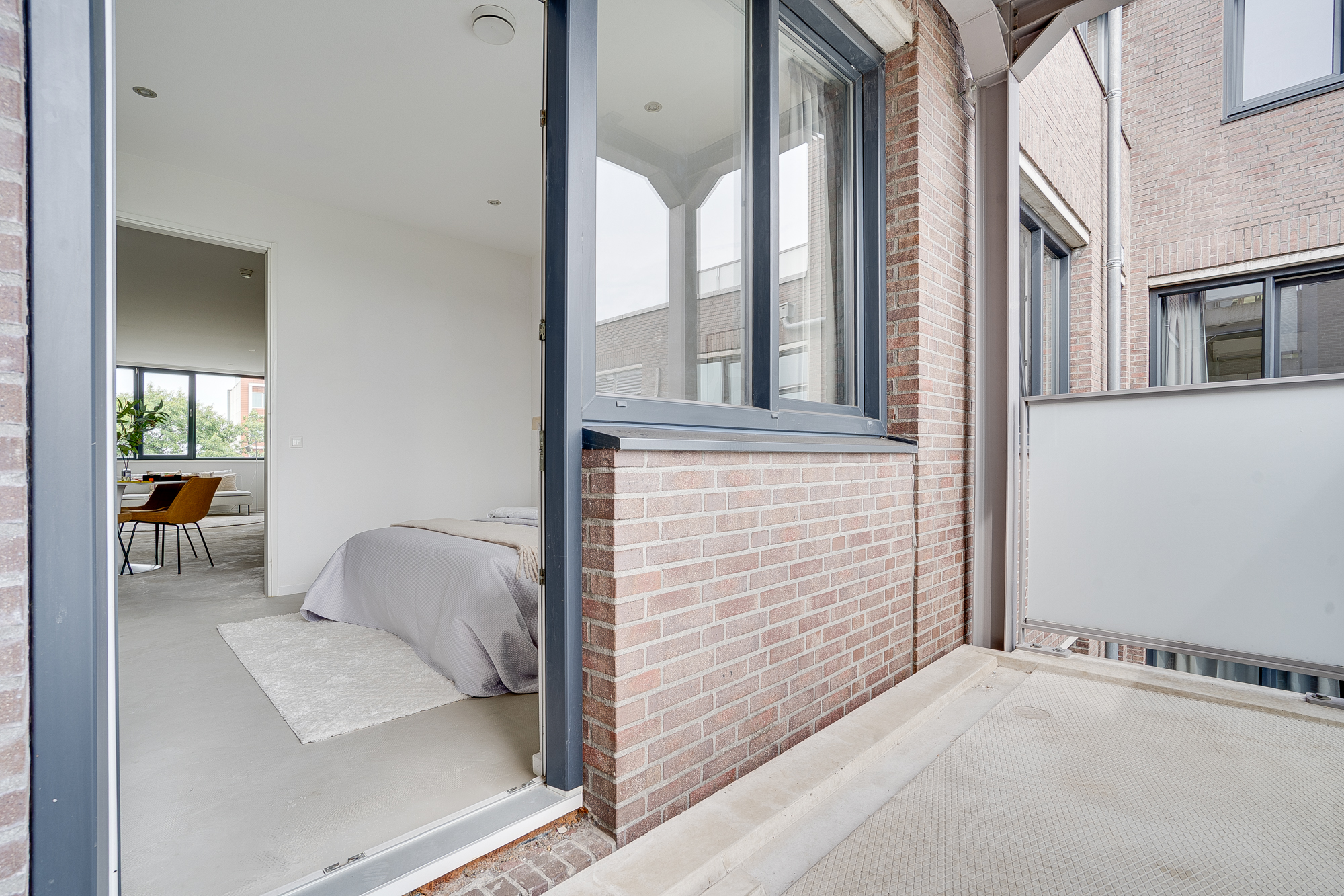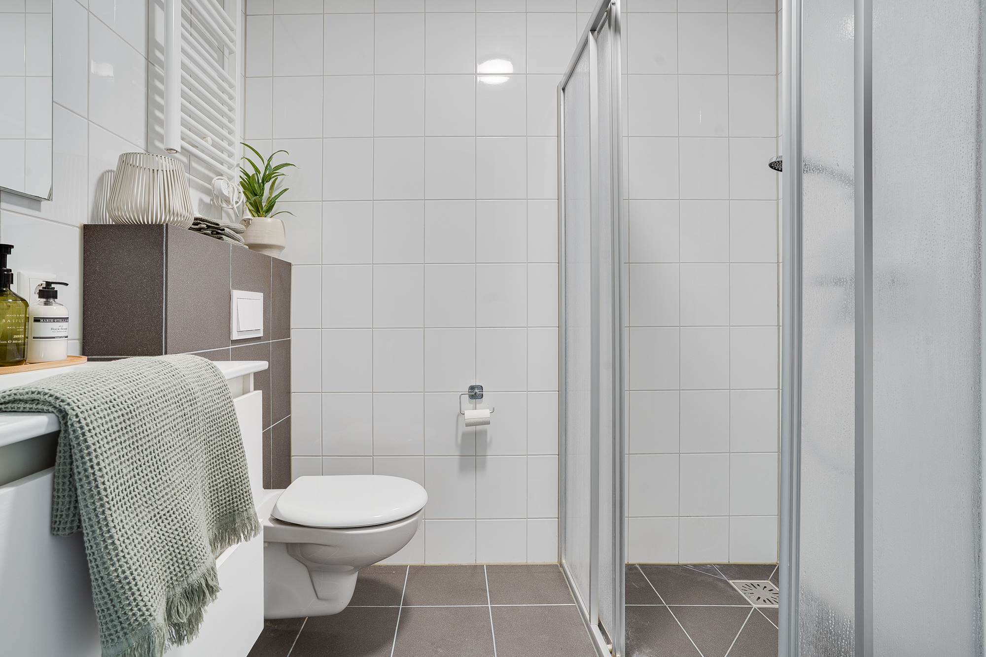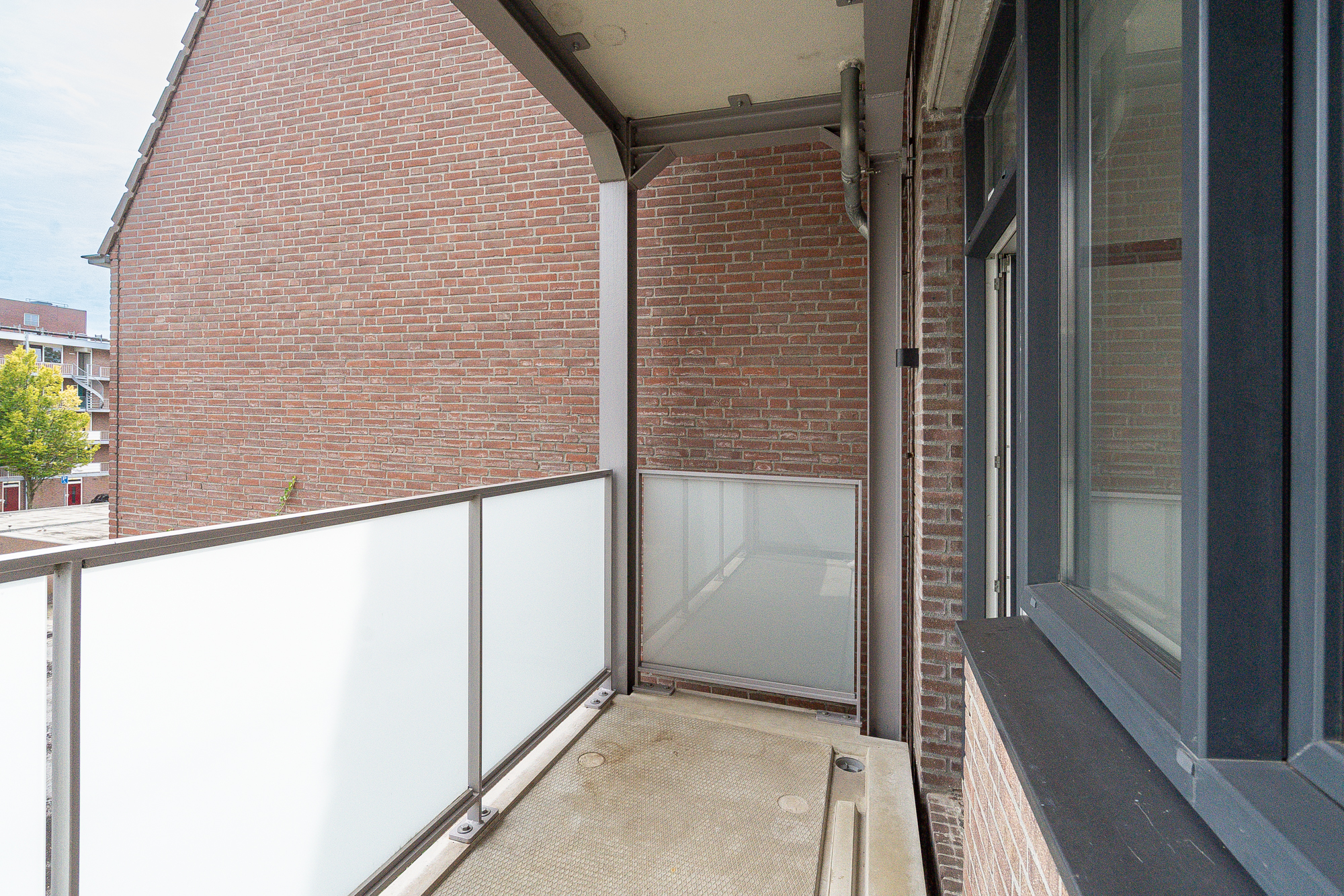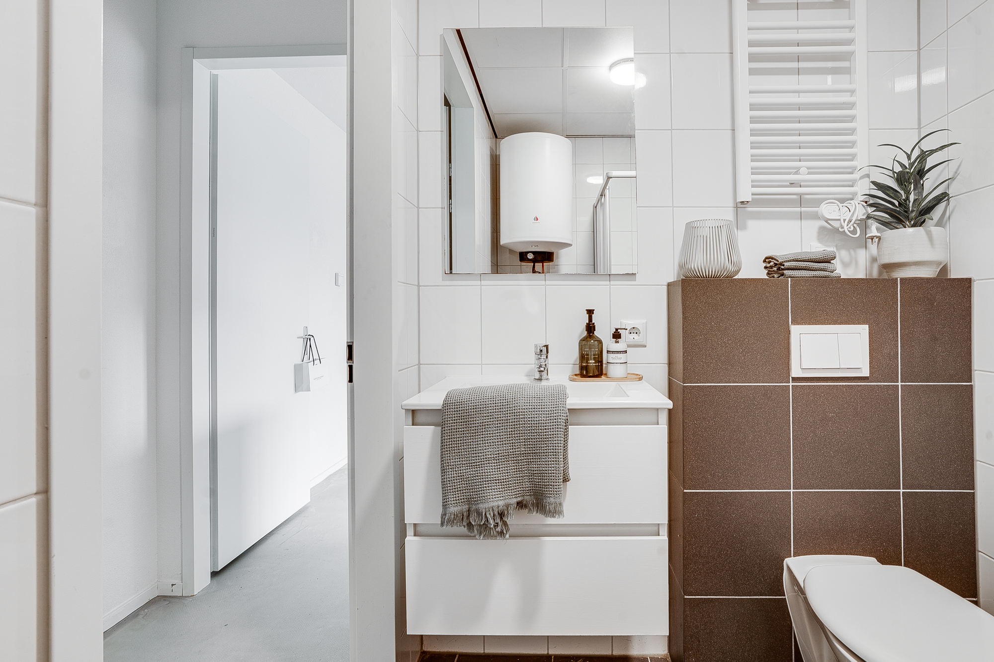 De slaapkamer is ruim bemeten en biedt direct toegang tot het balkon aan de achterzijde. De moderne badkamer is volledig betegeld en beschikt over een douche, wastafelmeubel, hangend toilet en een elektrische boiler.