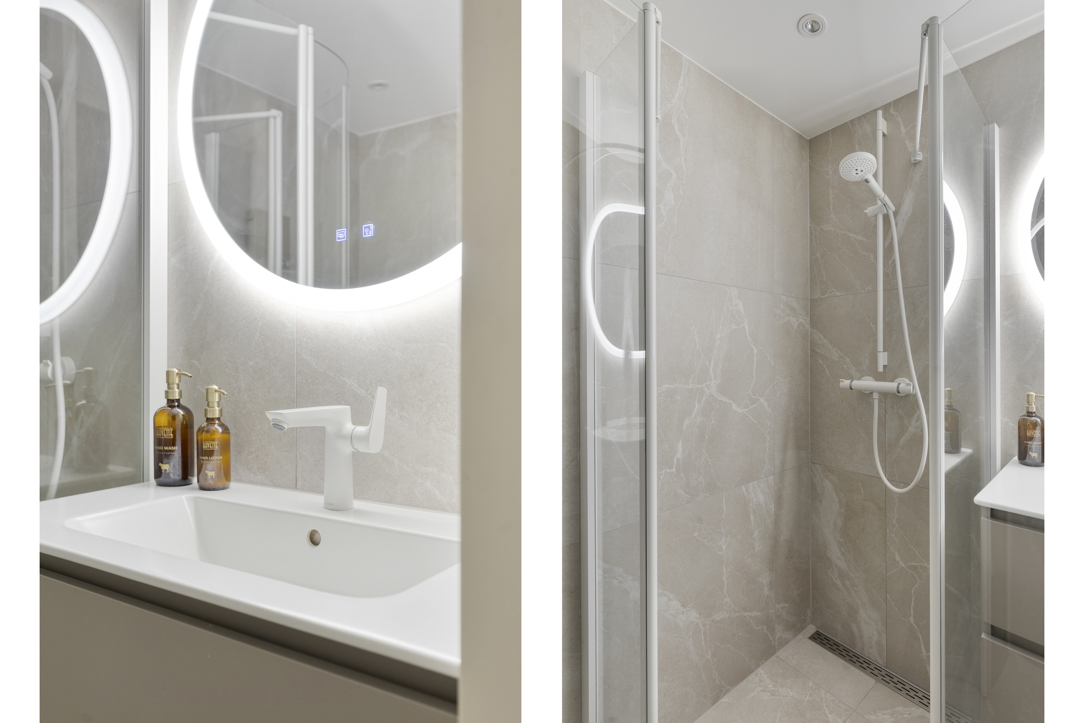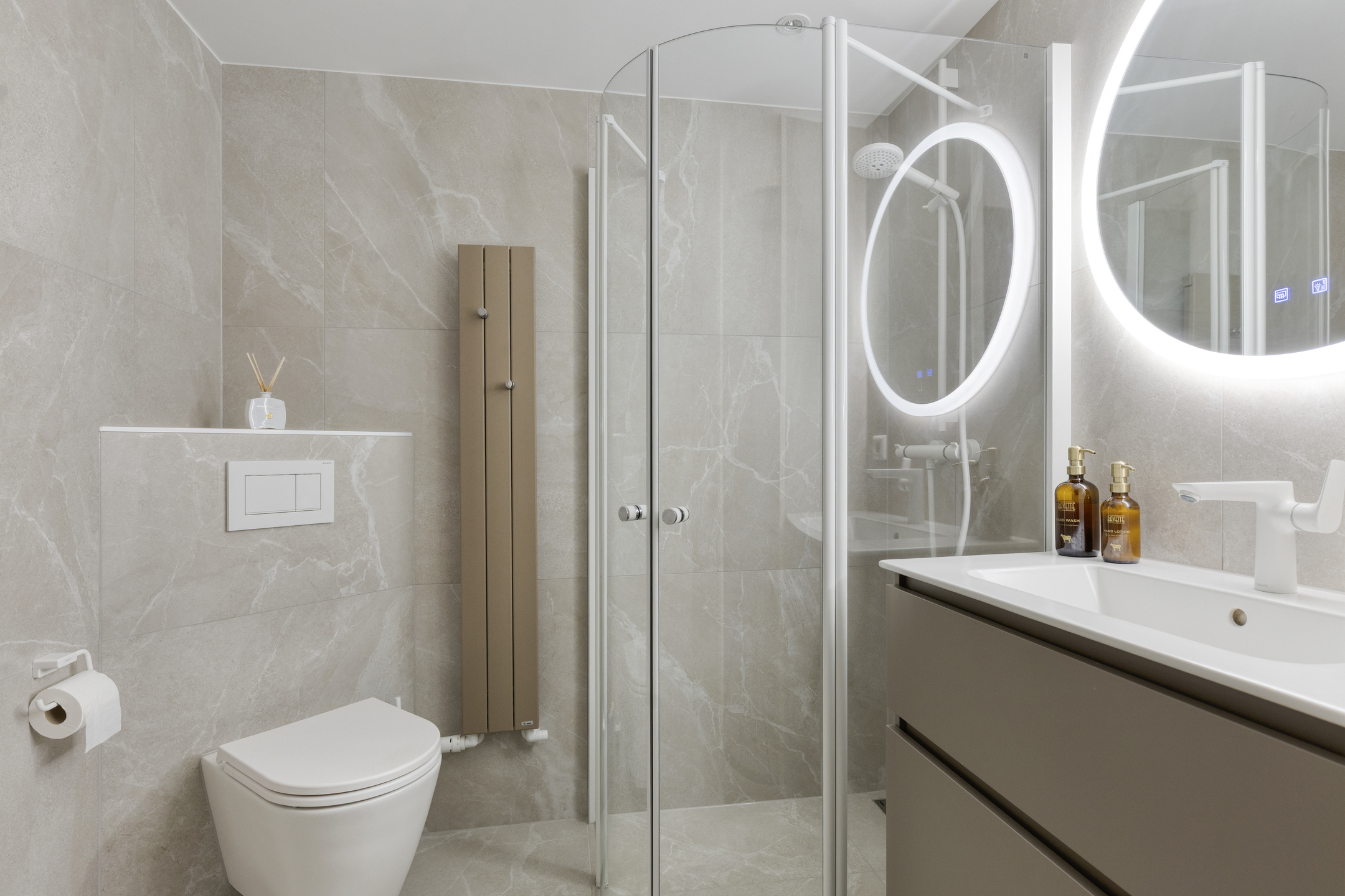 De moderne badkamer, die in 2022 volledig vernieuwd is, is uitgerust met een wastafelmeubel, een inloopdouche, een toilet, en een designradiator. Dankzij de mechanische ventilatie is de ruimte goed geventileerd. Bovendien is er een aansluiting voor de wasmachine en/of droger, wat de functionaliteit van de badkamer vergroot (naar eigen wens is deze ook eenvoudig te realiseren in de technische ruimte). De technische ruimte biedt niet alleen extra opbergruimte, maar ook plaats voor de CV-ketel (Remeha Avanta – 2017) en de mechanische ventilatie-unit.
