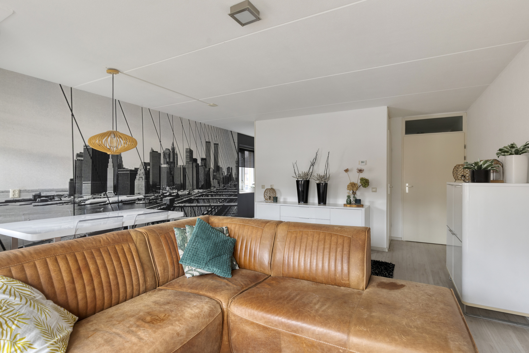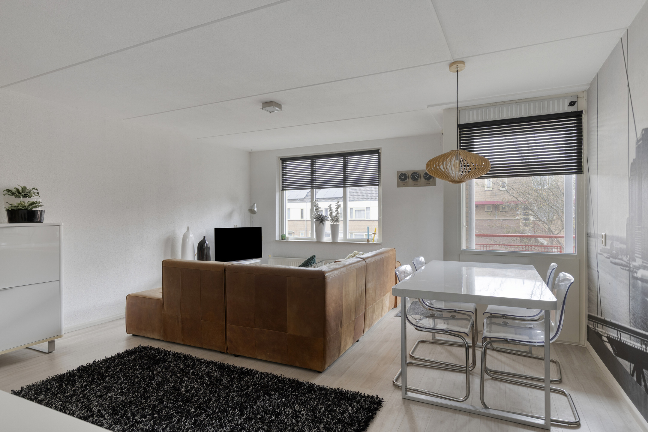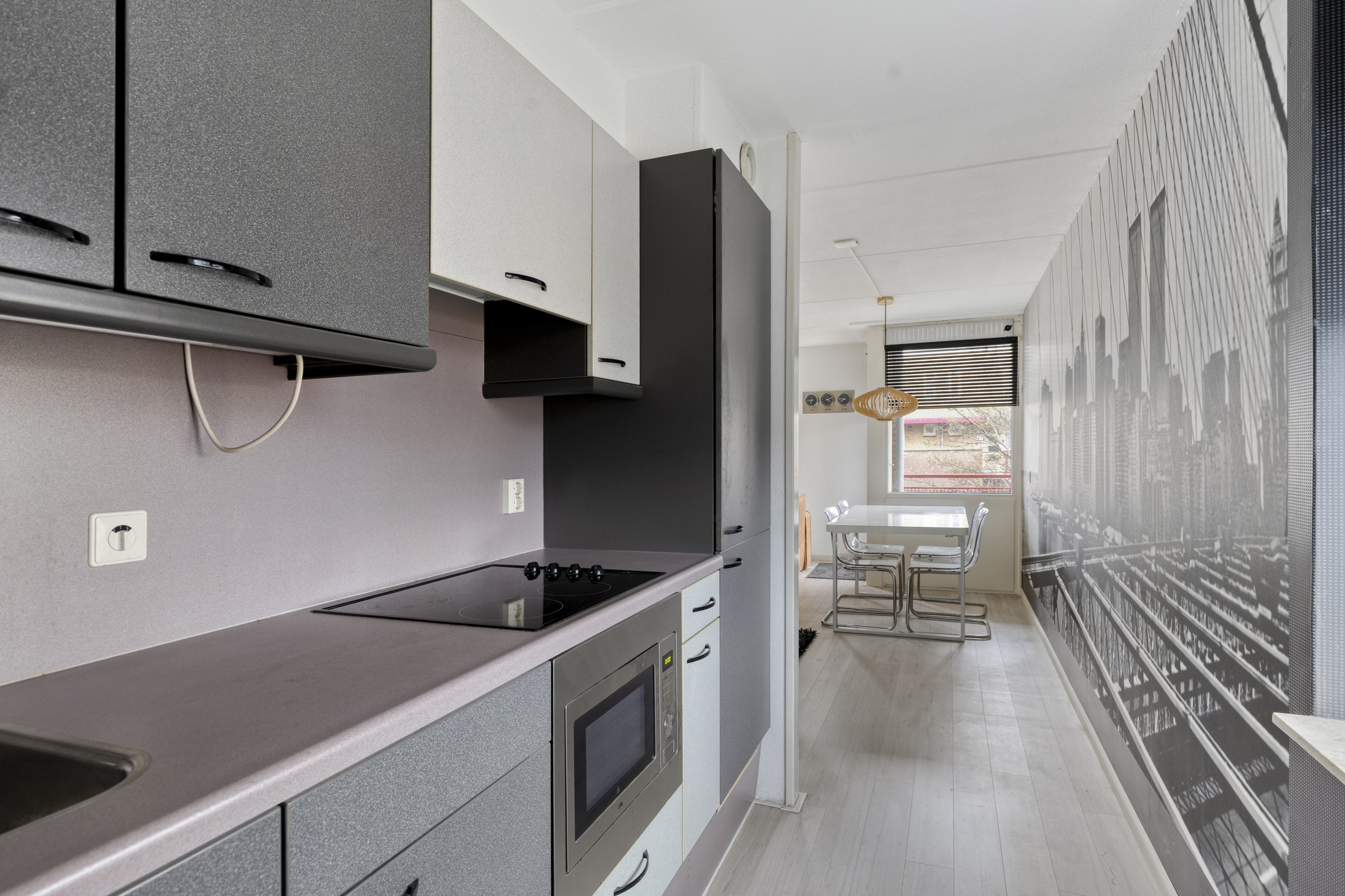 Aan het einde van de hal vind je de lichte woonkamer met open keuken. De keuken is voorzien van inbouwapparatuur, zoals een koelkast, vriezer, 4-pits inductie kookplaat met afzuiging, magnetron, en een spoelbak met mengkraan. Vanuit de woonkamer heb je toegang tot het balkon, gelegen op het zuidoosten. Dit balkon bevindt zich aan een rustige zijde van het complex, waar je in de zomer gedurende de dag heerlijk kunt genieten van de zon in alle rust.