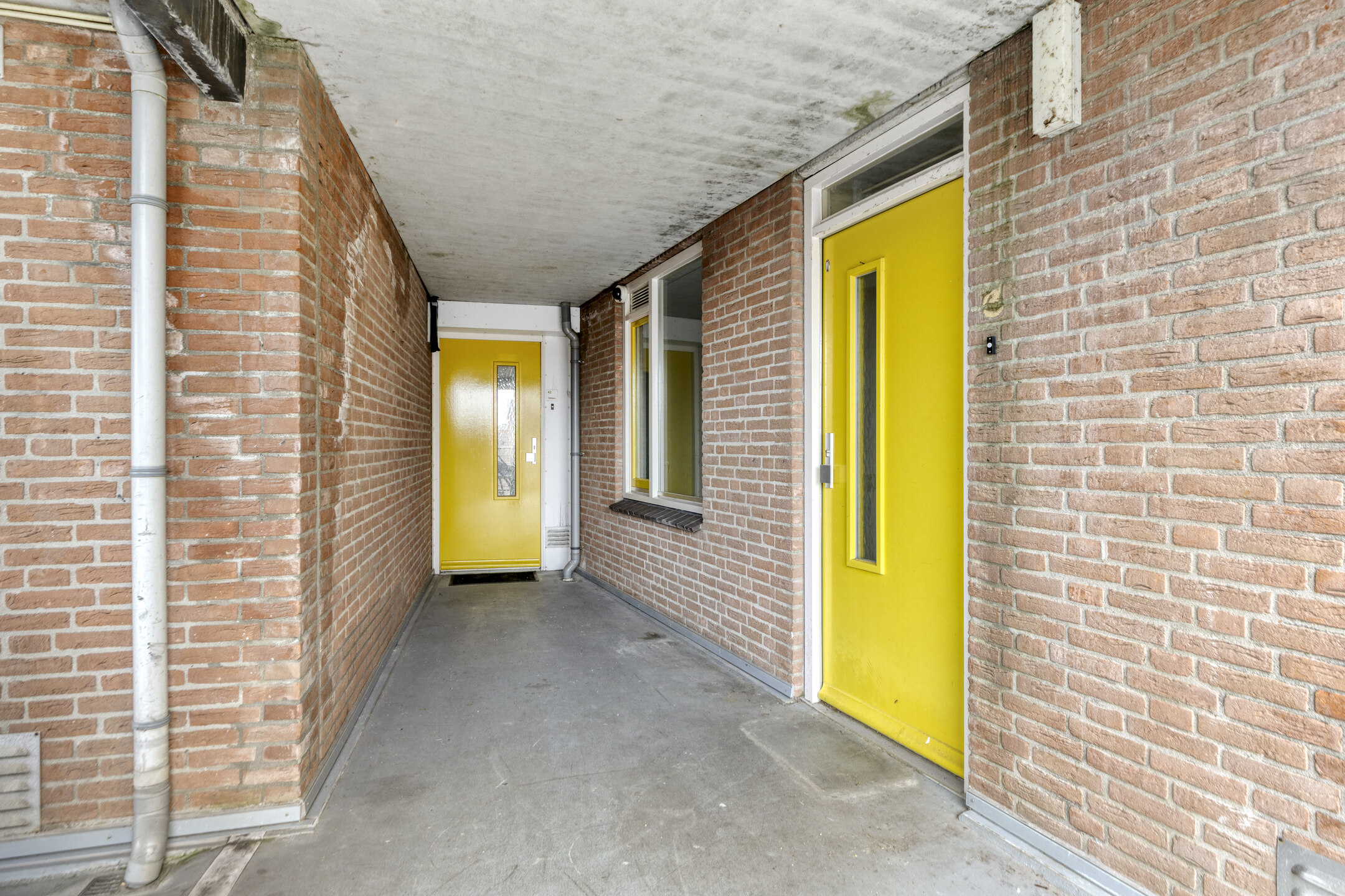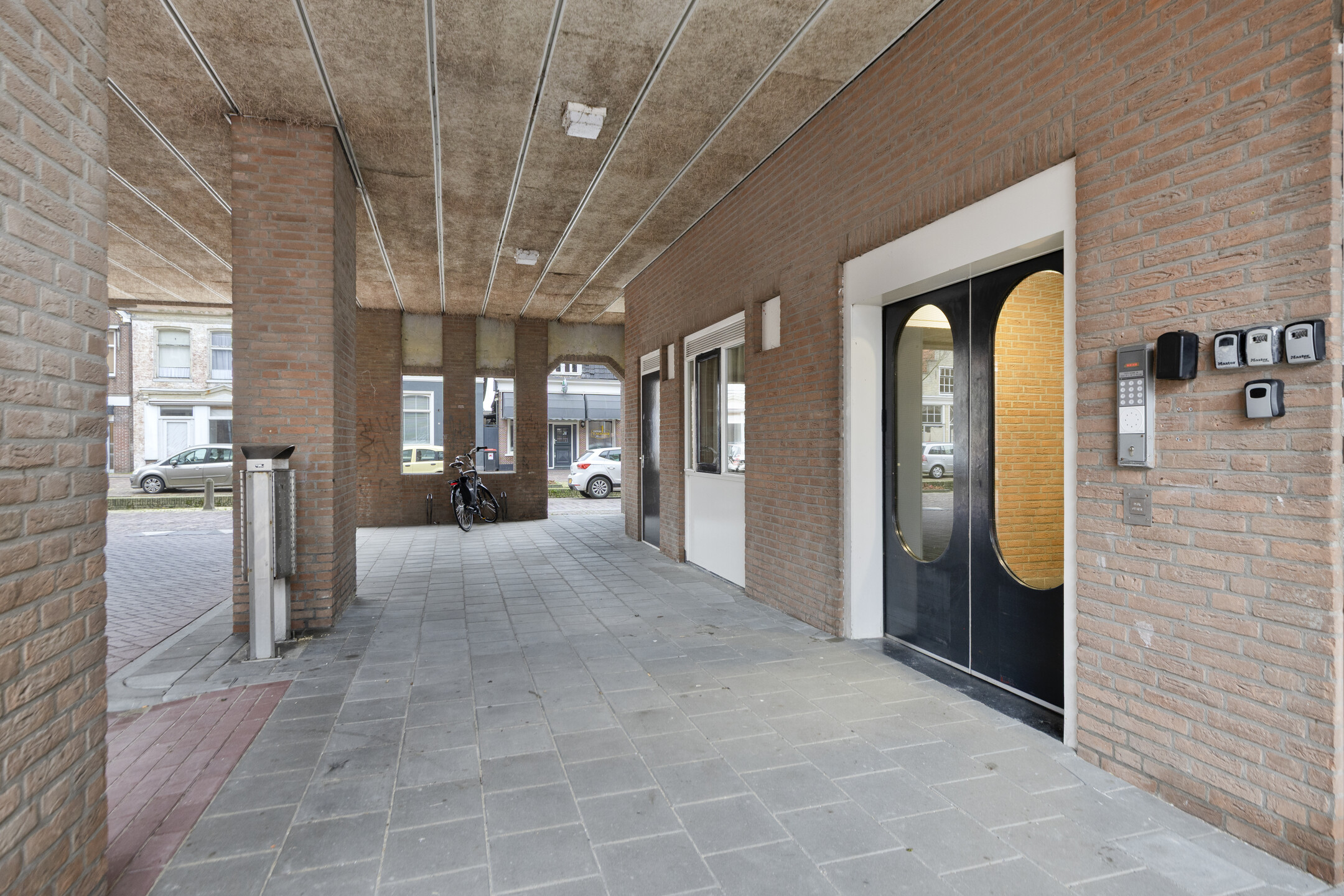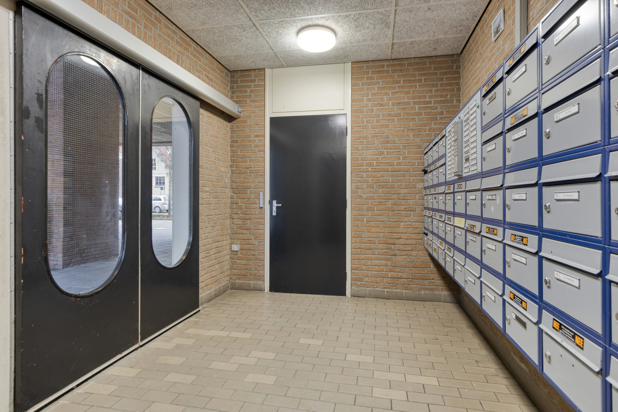 Begane grond: centrale hal met brievenbussen en bellentableau, afgesloten deur naar de lift en het trappenhuis.