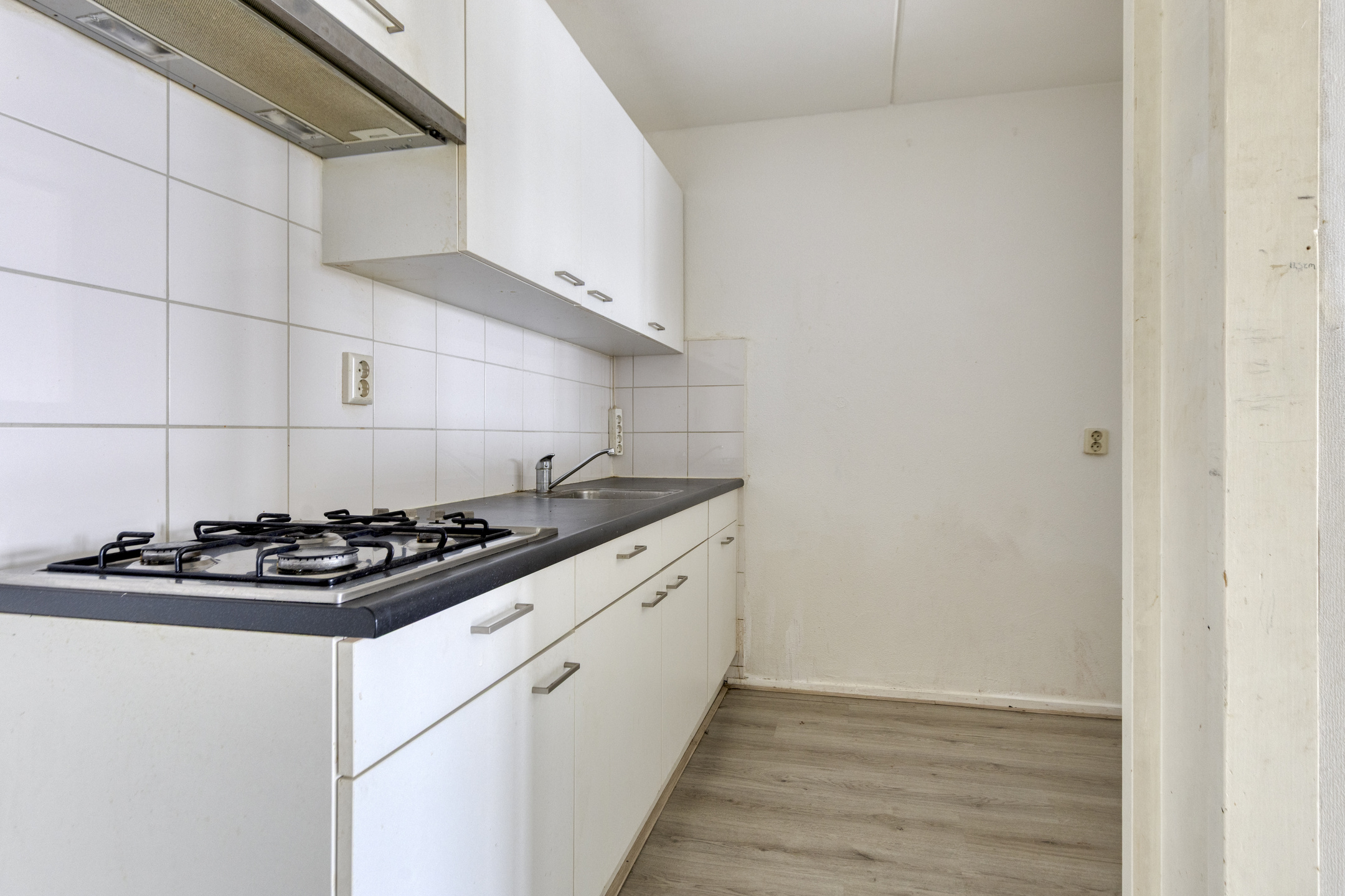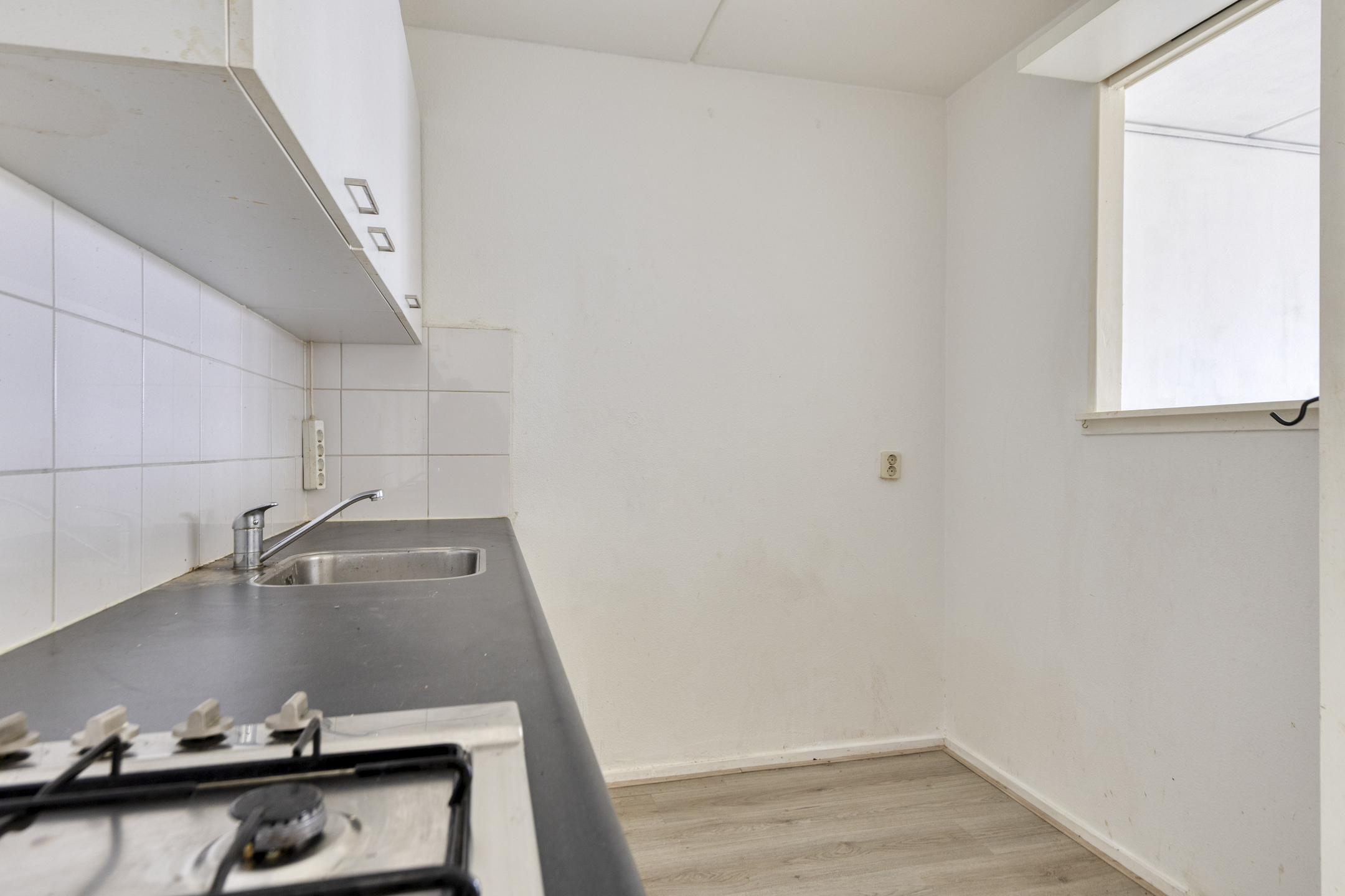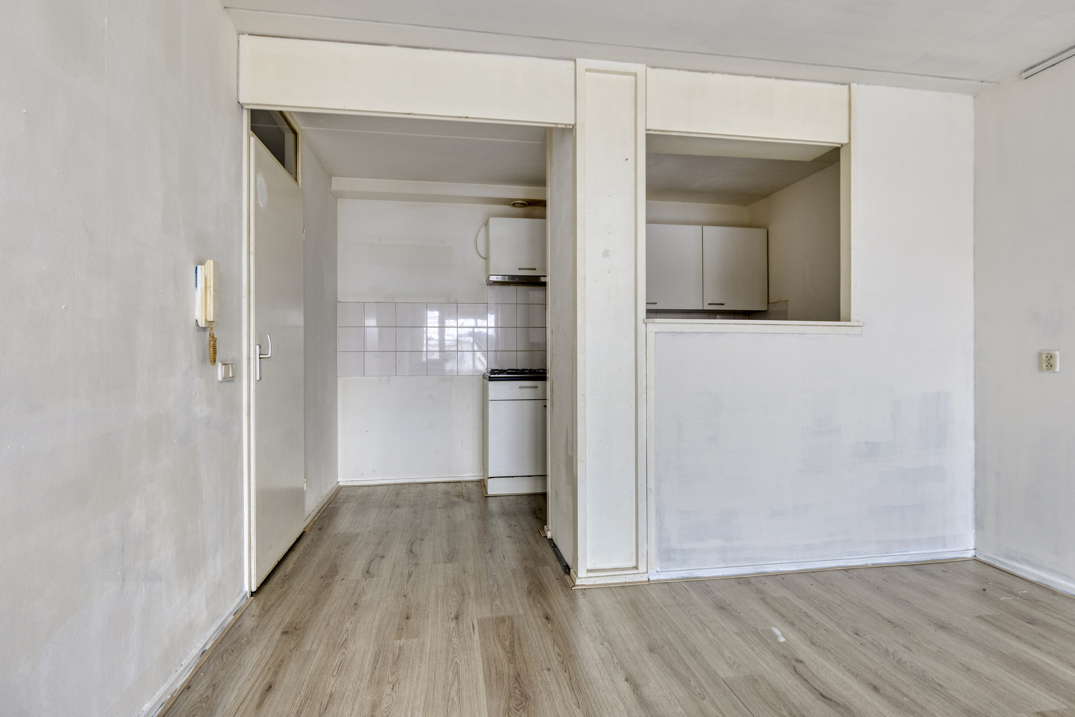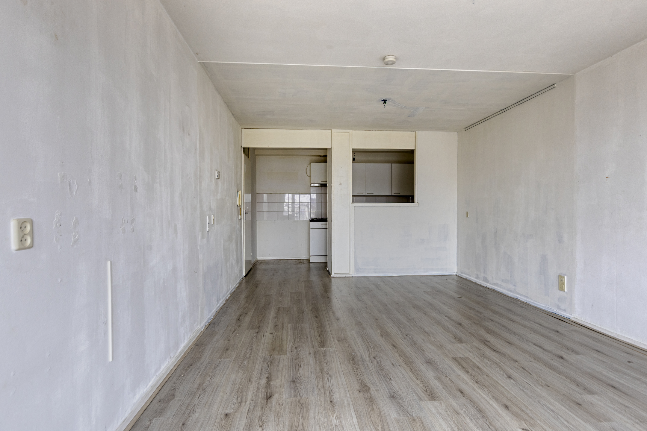 De woonkamer grenst aan een halfopen keuken, die eenvoudig open te breken is. Hierdoor kun je een moderne leefruimte realiseren, bijvoorbeeld met een kookeiland.