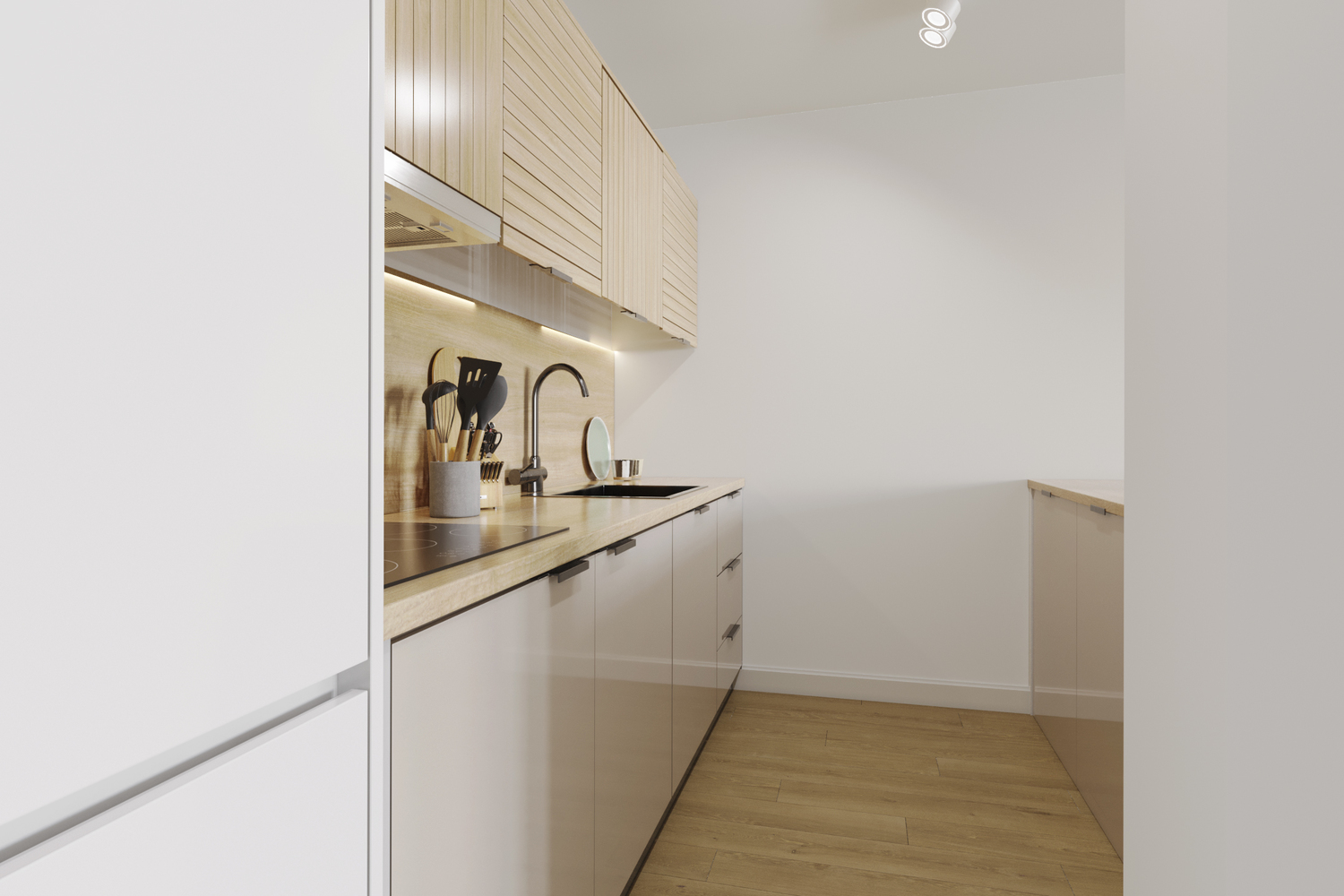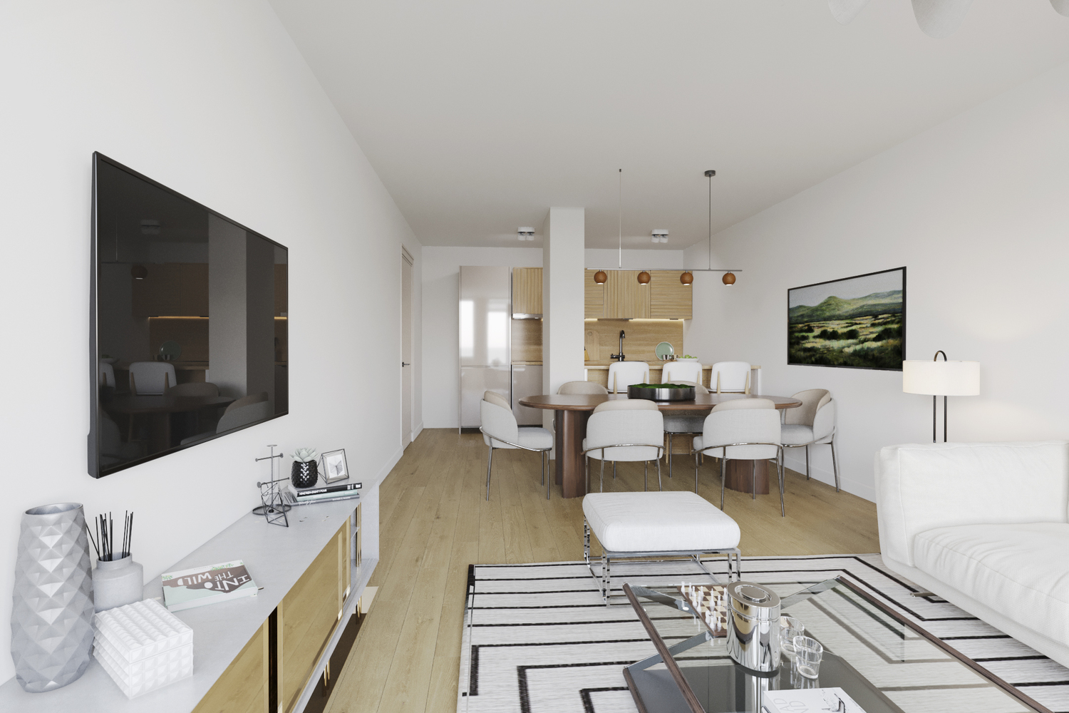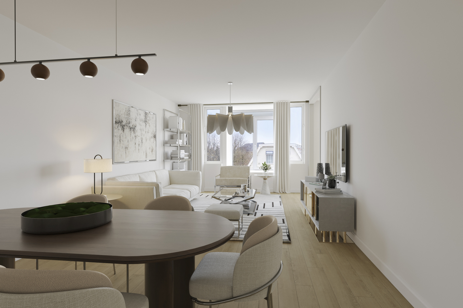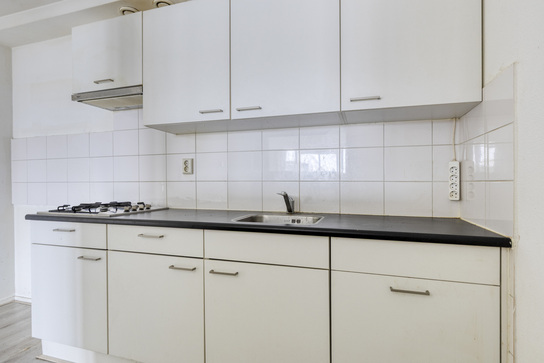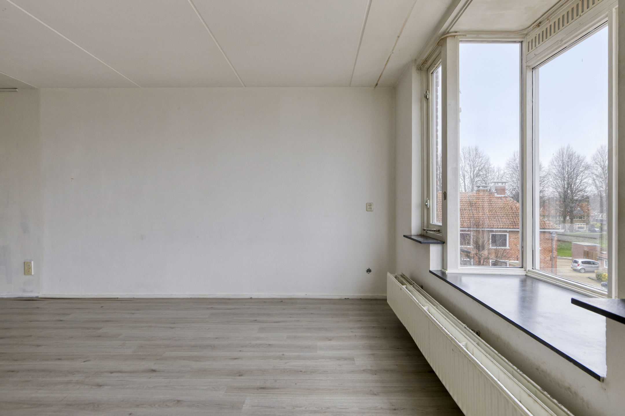 De woonkamer grenst aan een halfopen keuken, die eenvoudig open te breken is. Hierdoor kun je een moderne leefruimte realiseren, bijvoorbeeld met een kookeiland.