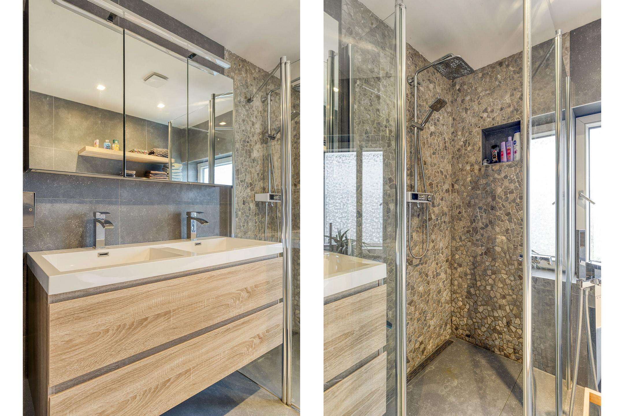 Op deze verdieping vind je een ruime overloop met plek voor een werkhoek en afgesloten wasruimte. Hier bevinden zich twee royale slaapkamers en een ruime badkamer, uitgerust met een dubbele wastafel, inloopdouche, tweede toilet en ligbad.