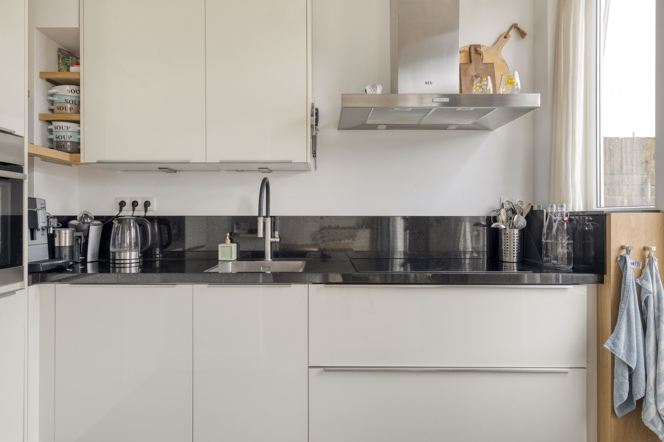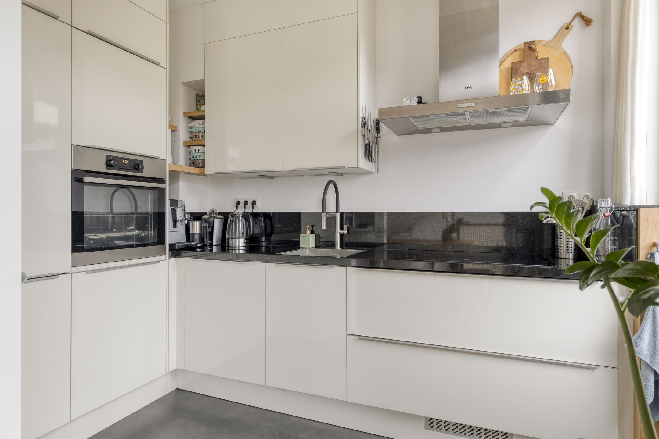 Via de eigen entree en trap bereik je de eerste woonlaag. De overloop geeft toegang tot een separaat toilet en een praktische werk- of studeerkamer. De sfeervolle woonkamer-en-suite met knusse open haard vormt het hart van deze verdieping. Grote raampartijen zorgen voor een prettige lichtinval en een fraai uitzicht. Aan de achterzijde bevindt zich de moderne en lichte halfopen keuken, die in open verbinding staat met de woonkamer. Vanuit hier stap je zo het zonnige balkon op het westen op: een heerlijke plek om tot in de avond van de zon te genieten.