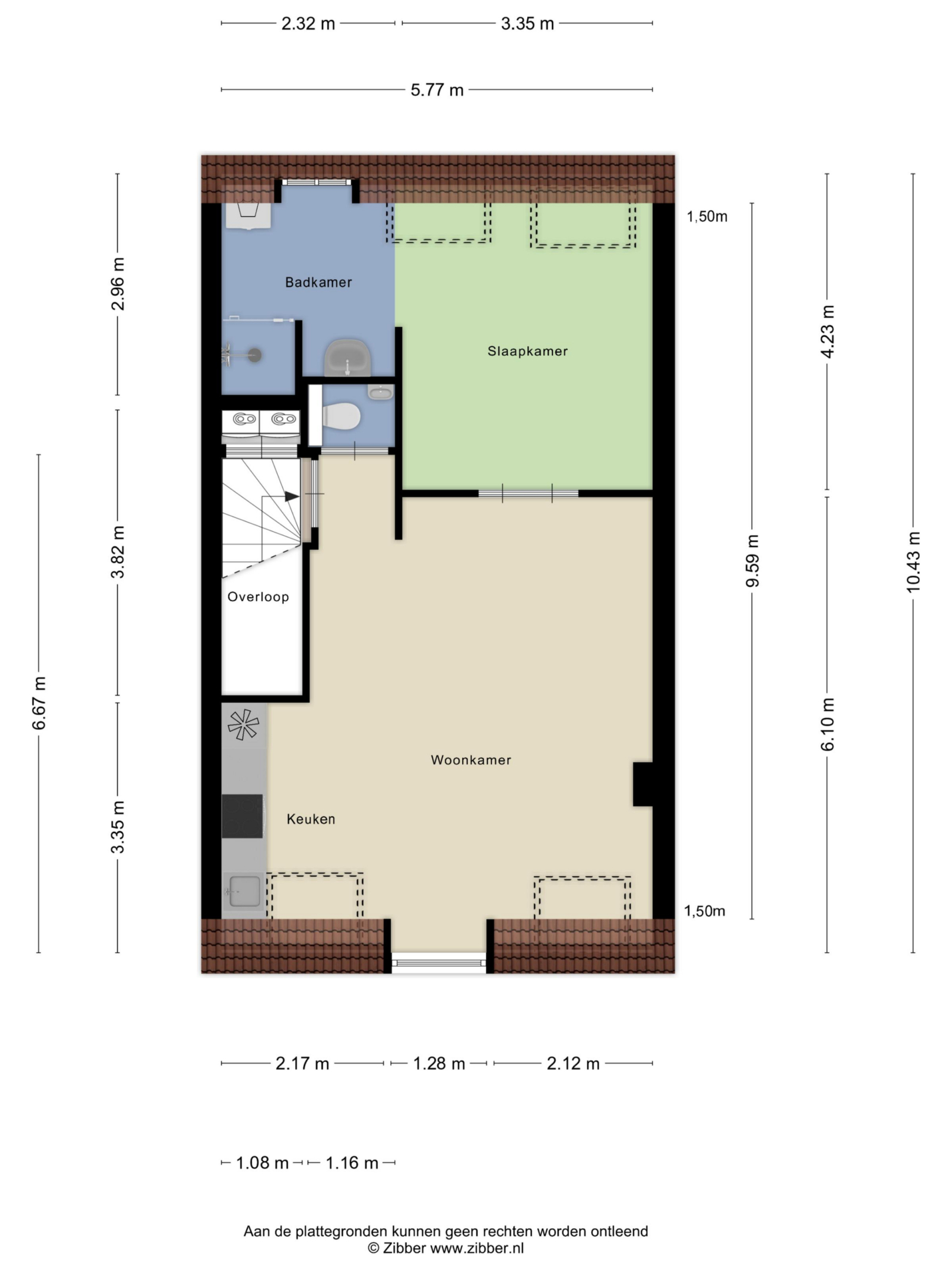 Second Floor: This apartment has a similar layout. You first enter the landing and the toilet, then proceed into the bright living room with a modern open kitchen. In this space, the exposed roof trusses immediately catch the eye and contribute to an authentic and warm atmosphere. Through bi-fold paneled doors, you enter the bedroom, which is connected to the bathroom featuring a shower, washbasin, towel radiator, and a washing machine connection.