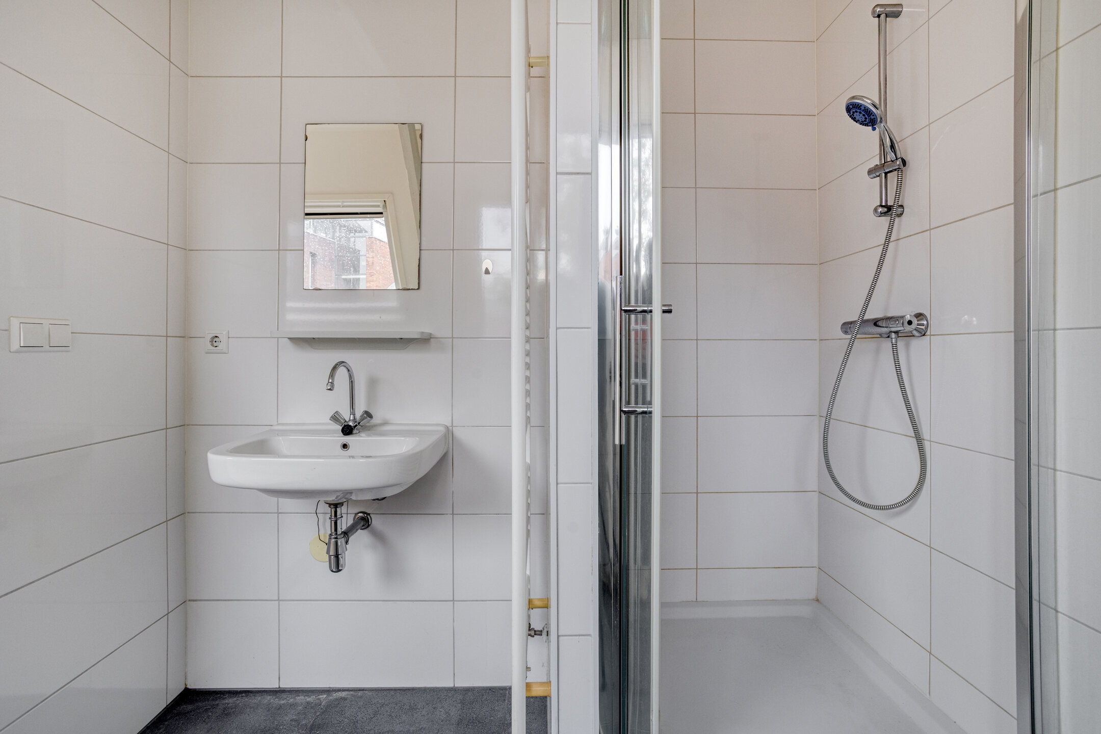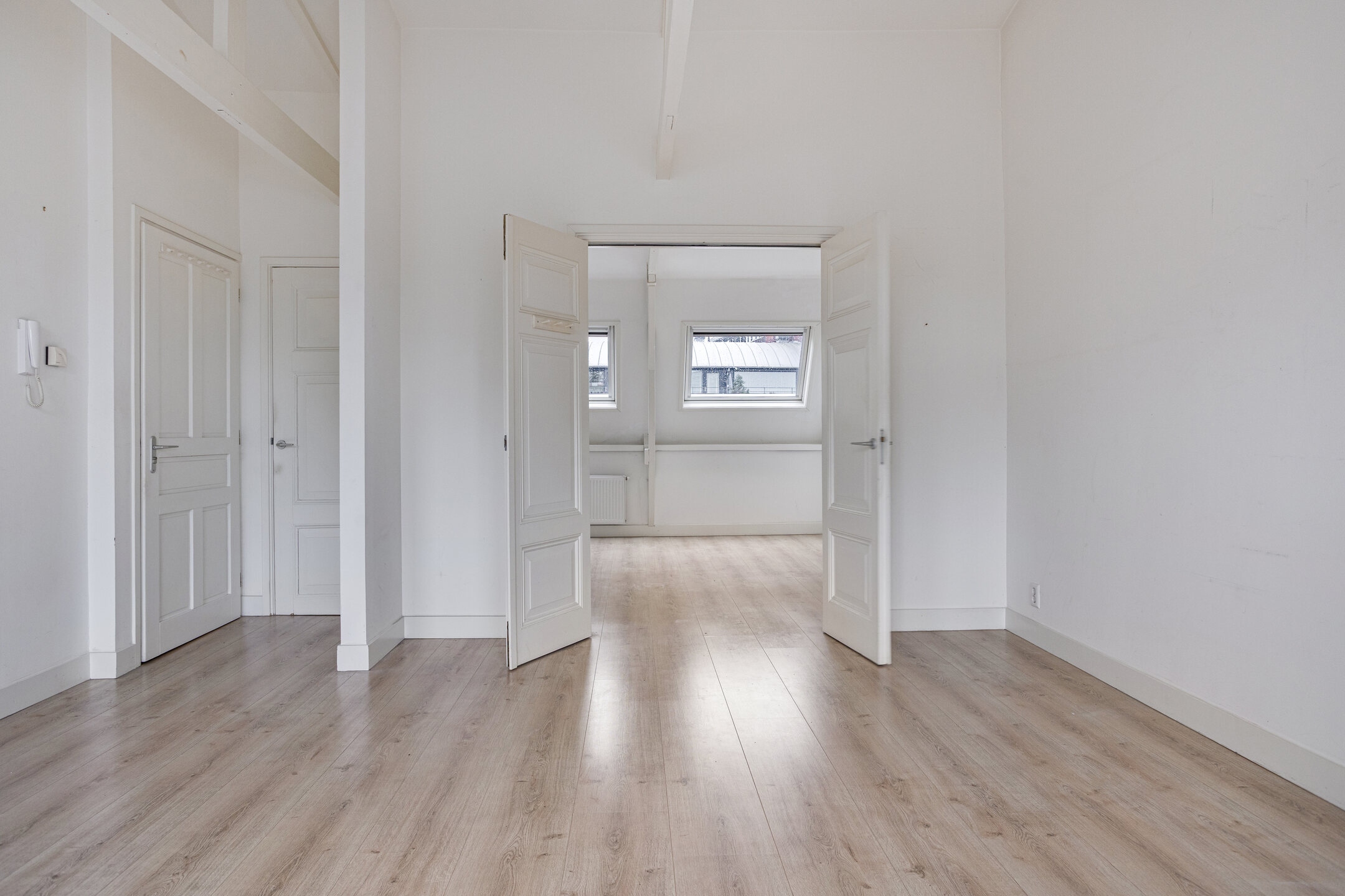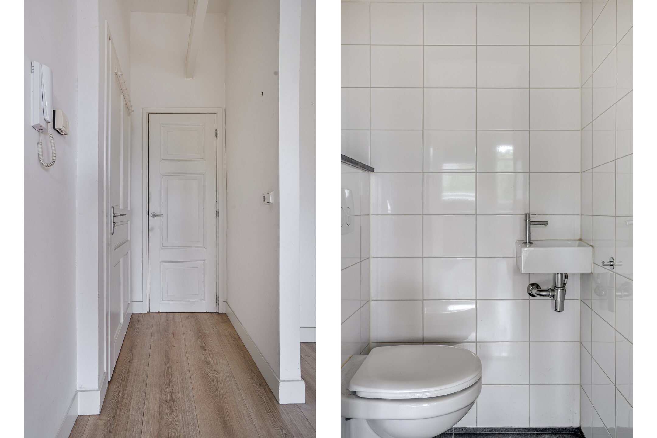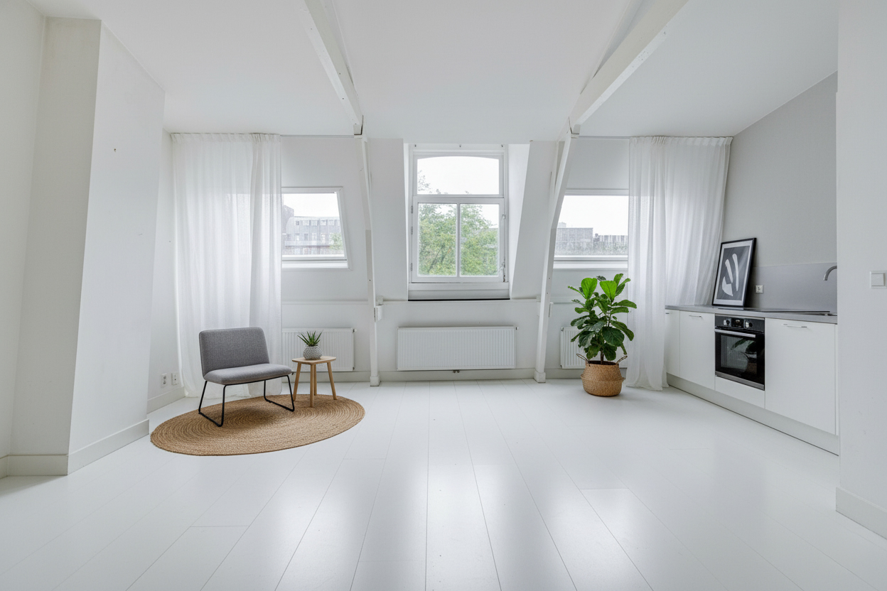 Dit appartement kent een vergelijkbare indeling. Je betreedt eerst de overloop en het toilet, waarna je de lichte woonkamer binnengaat met een moderne open keuken. In deze ruimte vallen meteen de zichtbare dakspanten op, die zorgen voor een authentieke en warme sfeer. Via openslaande paneeldeuren kom je in de slaapkamer, die verbonden is met de badkamer, voorzien van douche, wastafel, handdoekradiator en aansluiting voor de wasmachine.