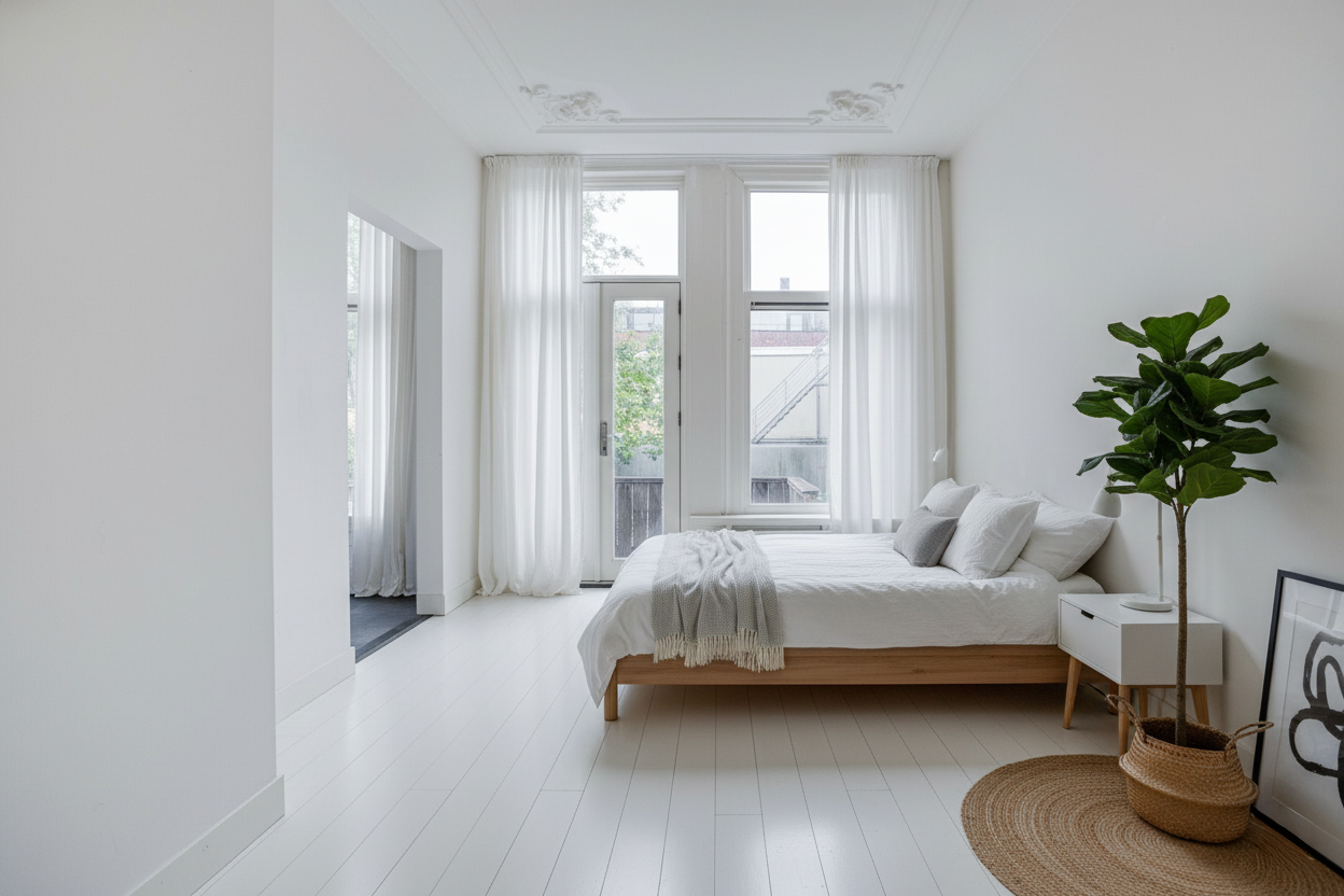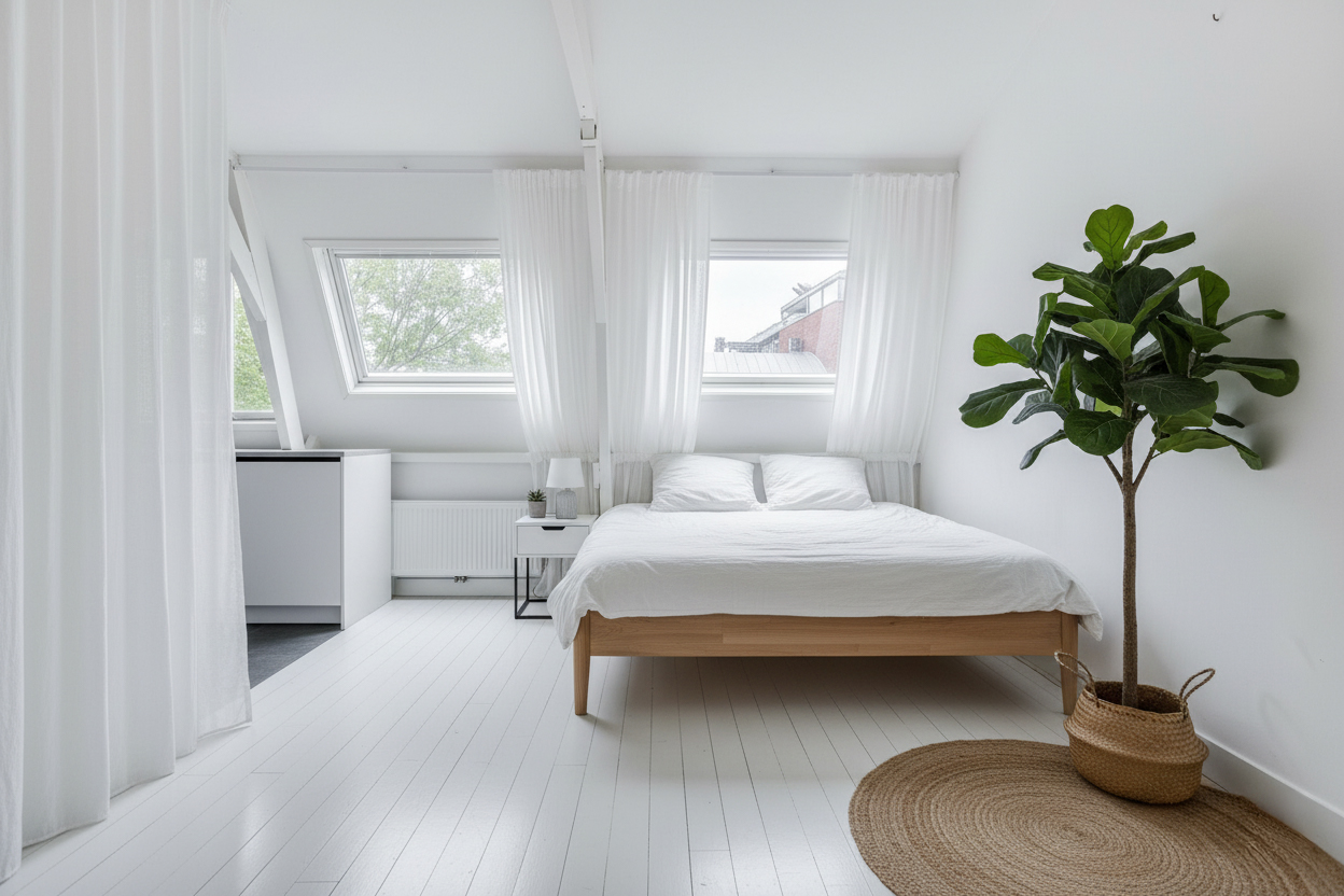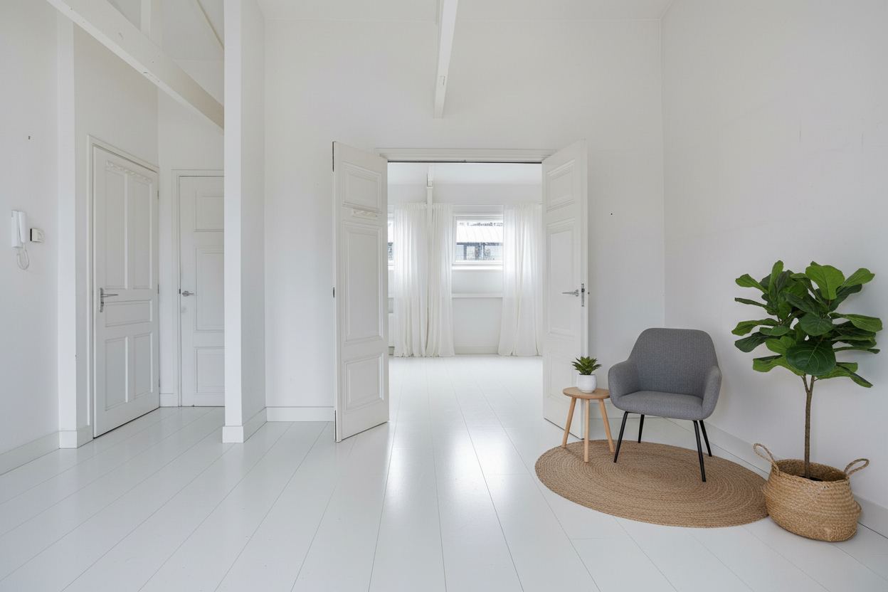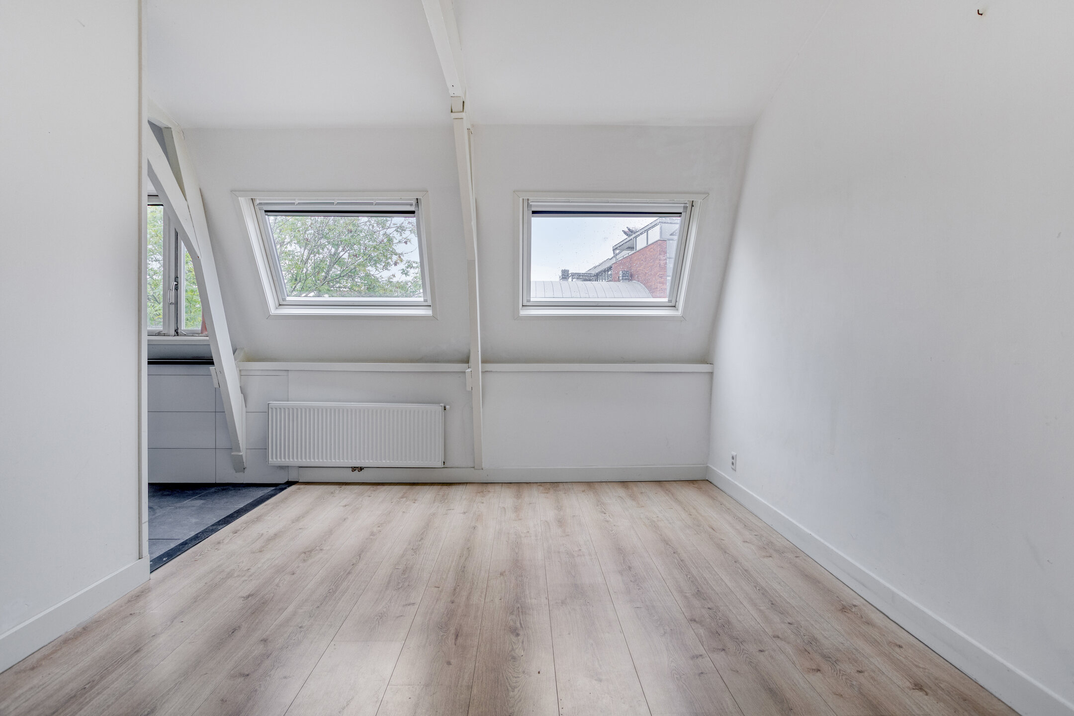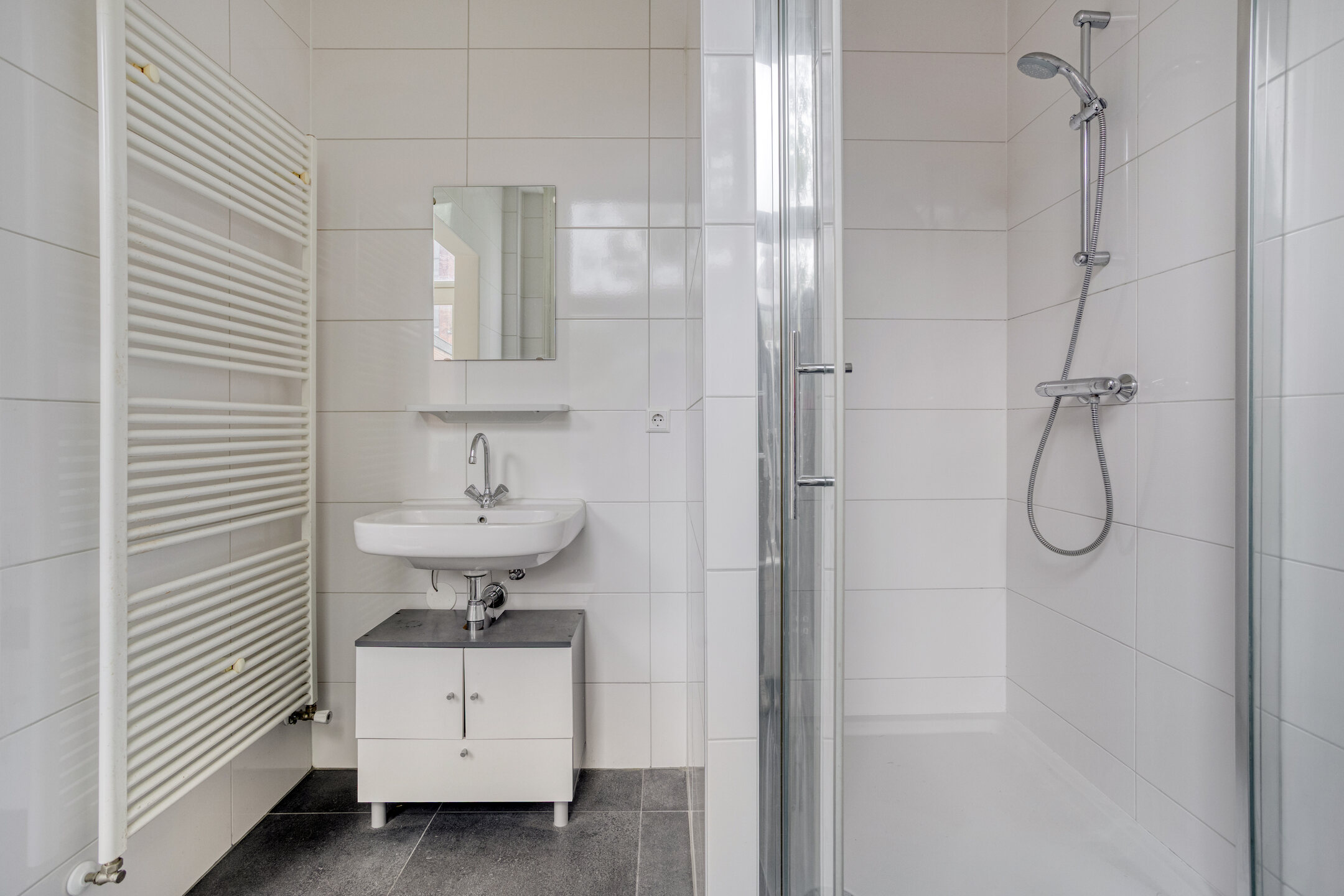 Dit appartement kent een vergelijkbare indeling. Je betreedt eerst de overloop en het toilet, waarna je de lichte woonkamer binnengaat met een moderne open keuken. In deze ruimte vallen meteen de zichtbare dakspanten op, die zorgen voor een authentieke en warme sfeer. Via openslaande paneeldeuren kom je in de slaapkamer, die verbonden is met de badkamer, voorzien van douche, wastafel, handdoekradiator en aansluiting voor de wasmachine.