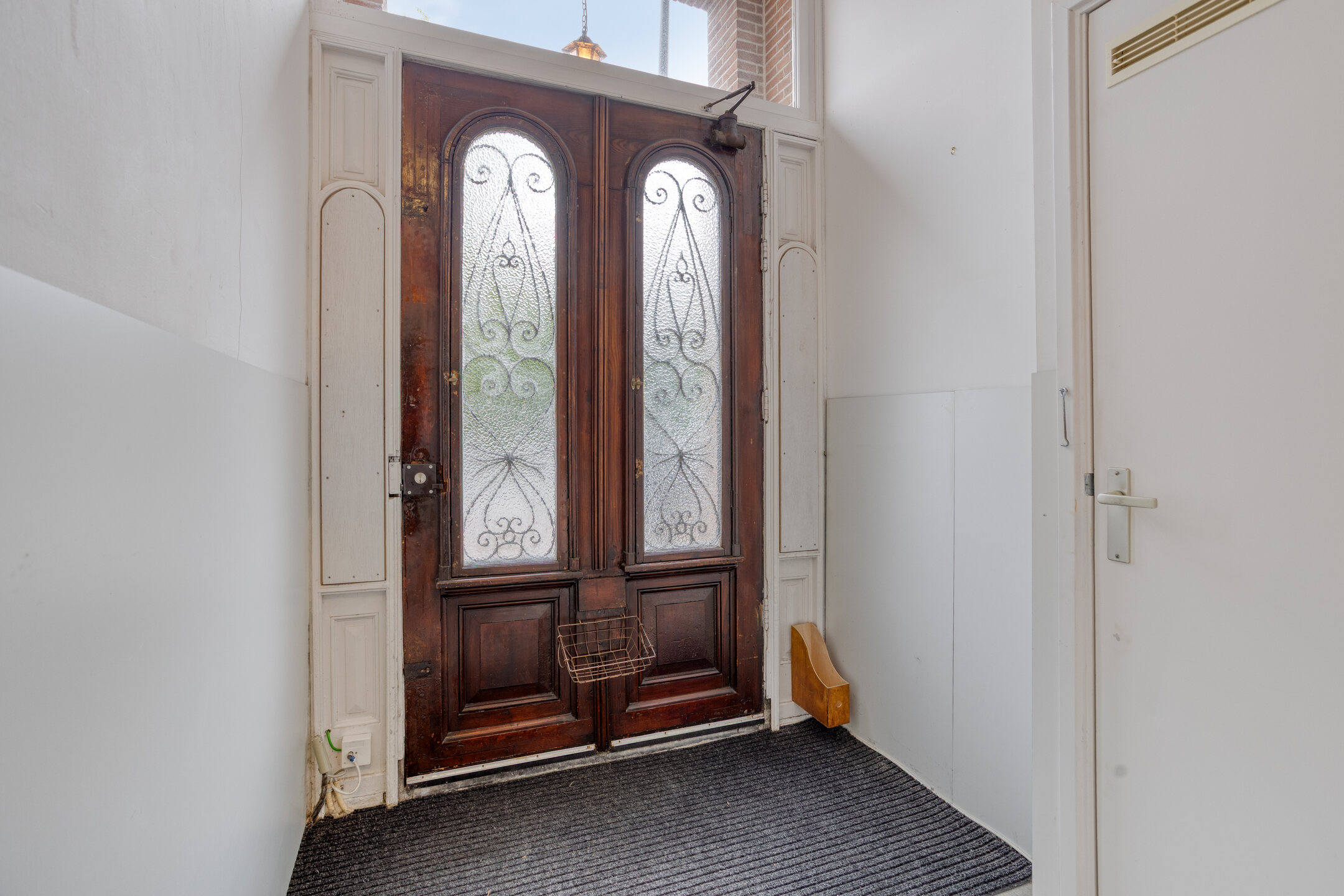 Een imposante brede entreedeur geeft toegang tot de hal met de gemoderniseerde meterkast en het trappenhuis.